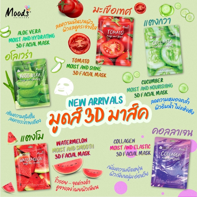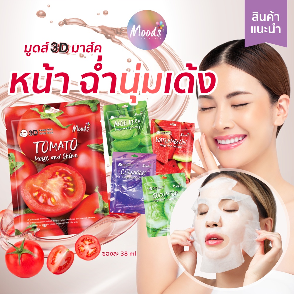 มูดส์ 3D มาสก์ 8 สูตร ว่าน/ คอลลาเจน/ แตงกวา/ มะเขือเทศ/ แตงโม /เมือกหอยทาก /ไฮยา /ทับทิม