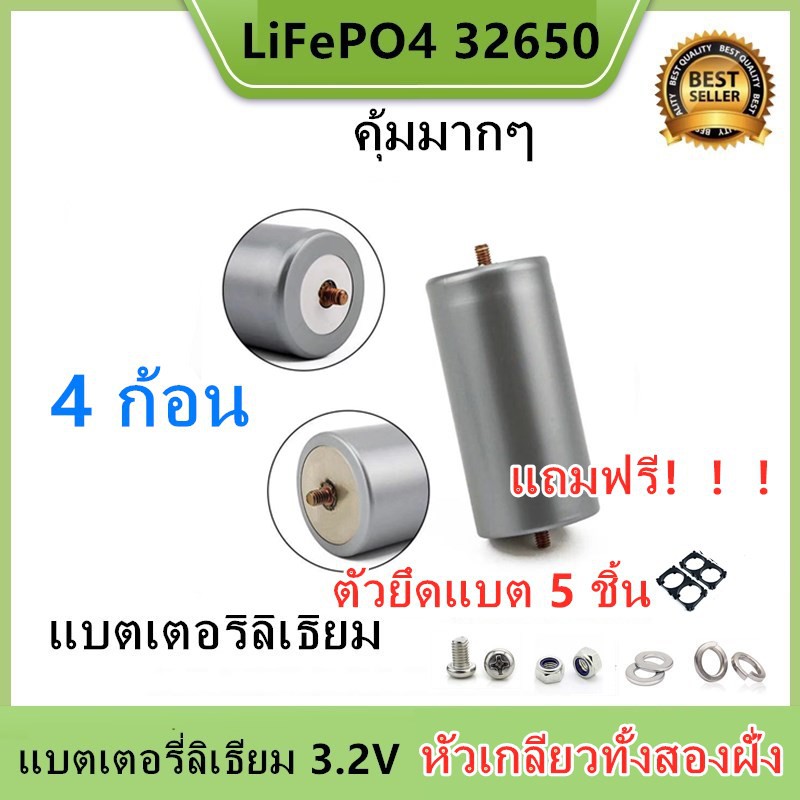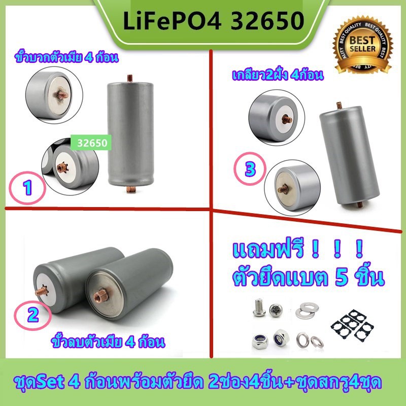 แบตเตอรี่32650 (ชุดSet 4 ก้อน) ขั่วแบตใหม่ พร้อมตัวยึด 2ช่อง4ชิ้น+ชุดสกรู4ชุด LiFePO4 3.2 v 5300-6000mAh
