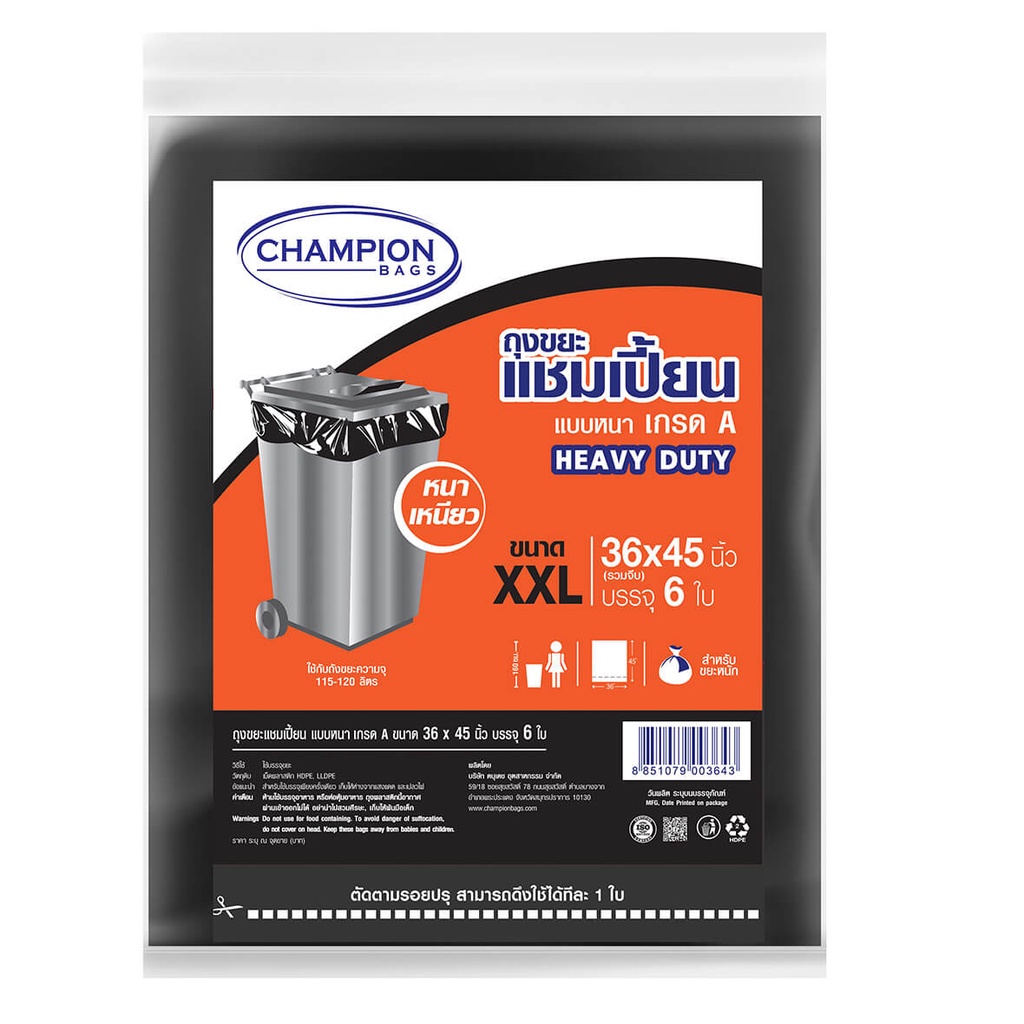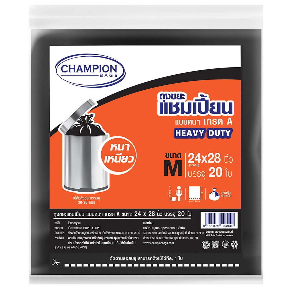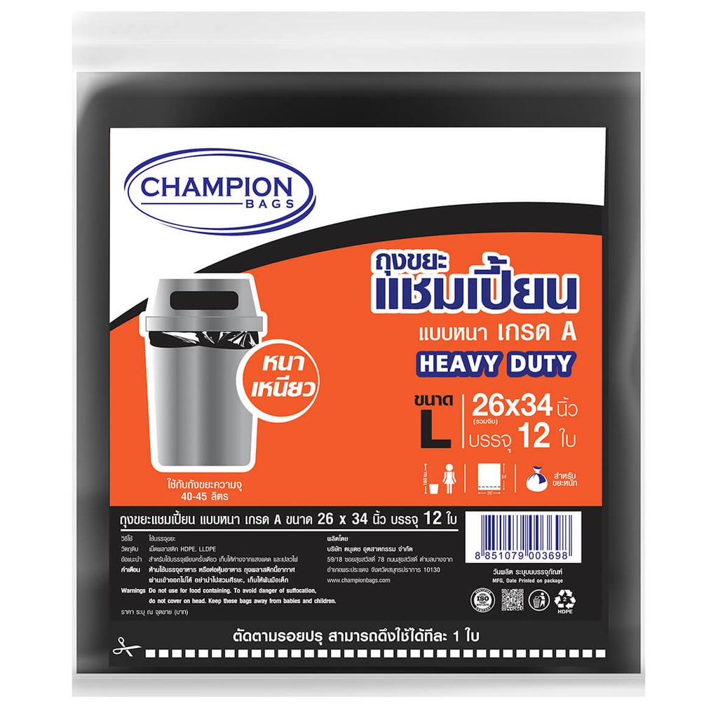 ถุงขยะ แชมเปี้ยน Champion Bags แบบหนา เกรด A รับน้ำหนักได้มาก เนื้อเหนียว ทนทาน ไร้กลิ่นกวนใจ