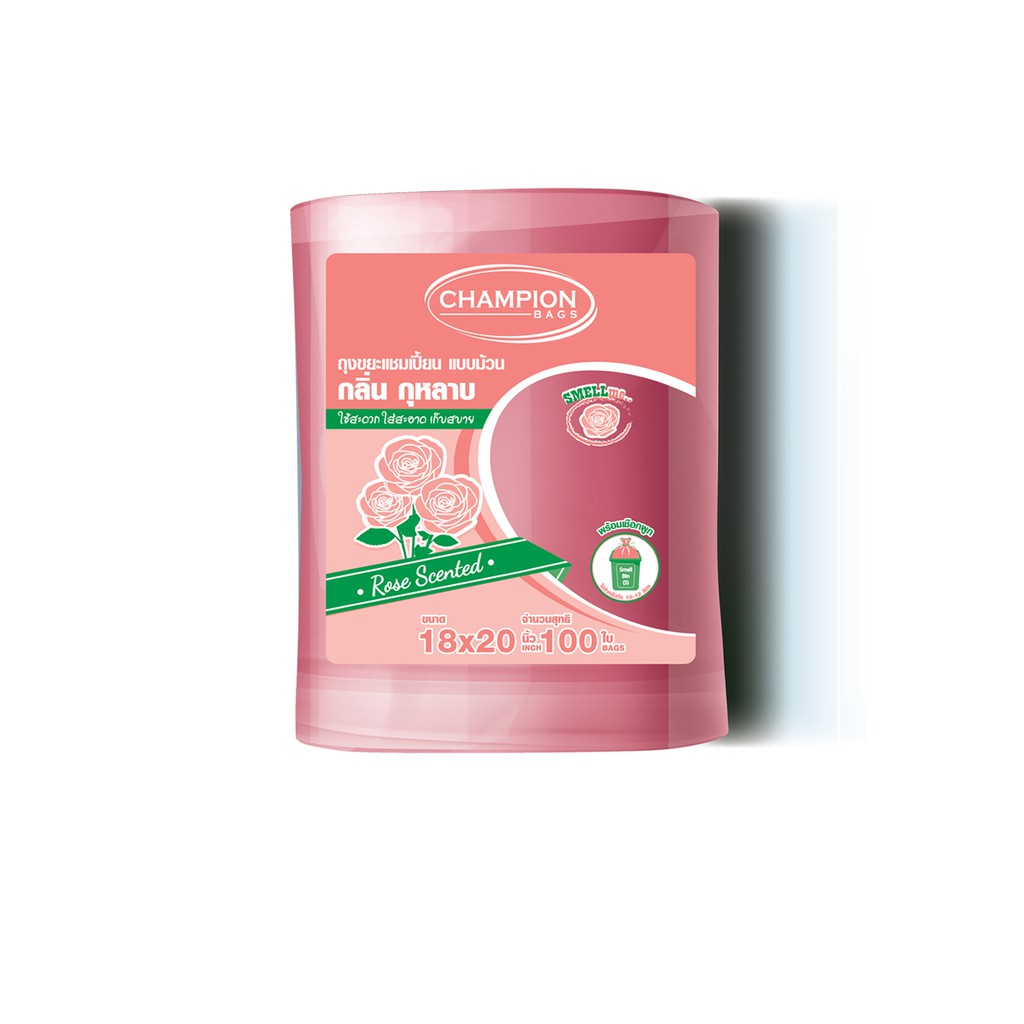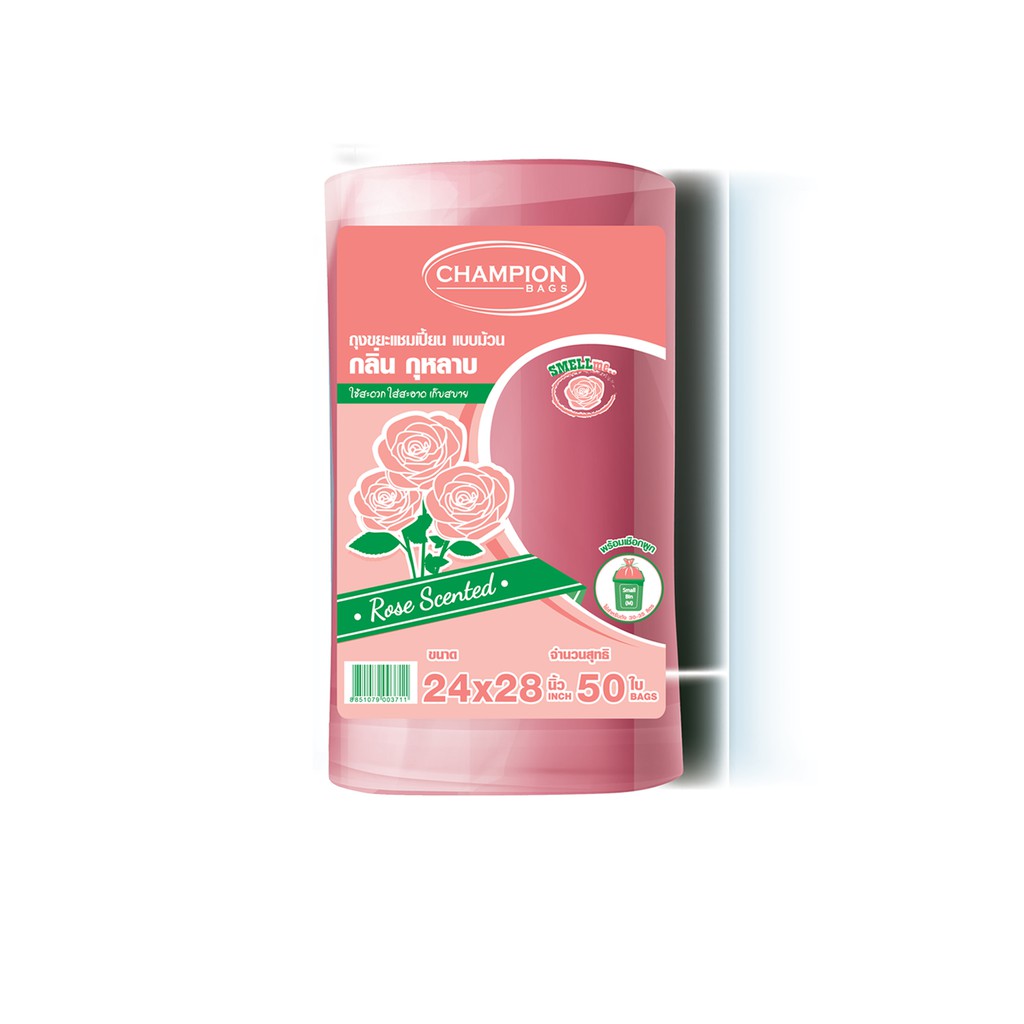 ถุงขยะ แชมเปี้ยน Champion Bags ถุงหอม ม้วนใหญ่ กลิ่นกุหลาบ มีเชือกมัดปากถุง ขนาด18x20 และ 24x28