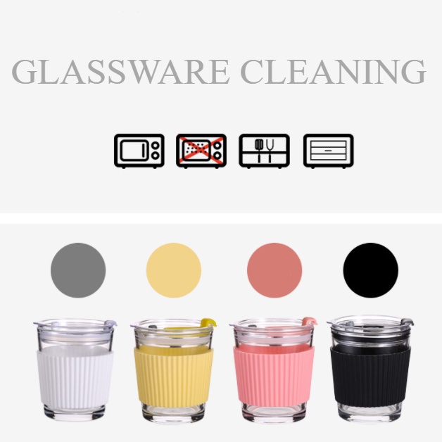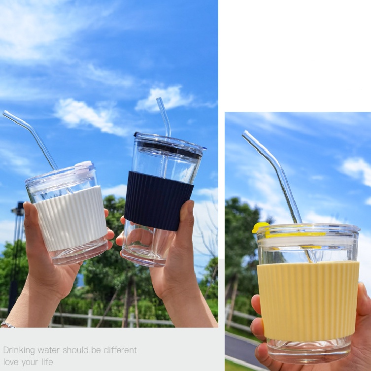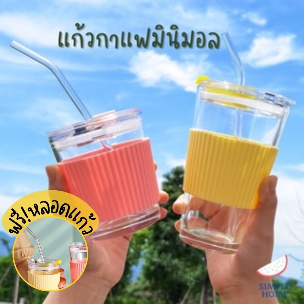 จัดส่งไว! แก้วน้ำสไตล์มินิมอล พร้อมหลอดแก้ว ฝาปิด ปลอกซิลิโคนกันร้อน สีน่ารัก มี 2 ขนาด