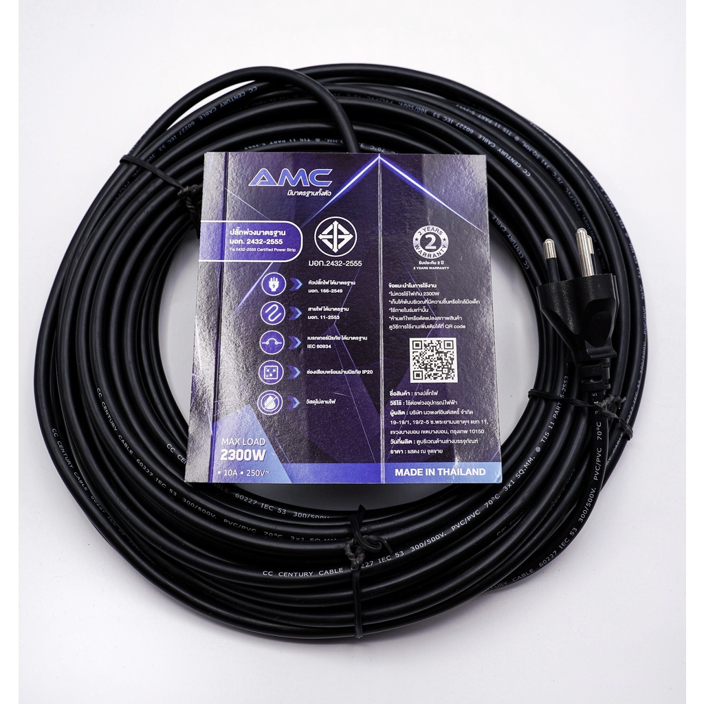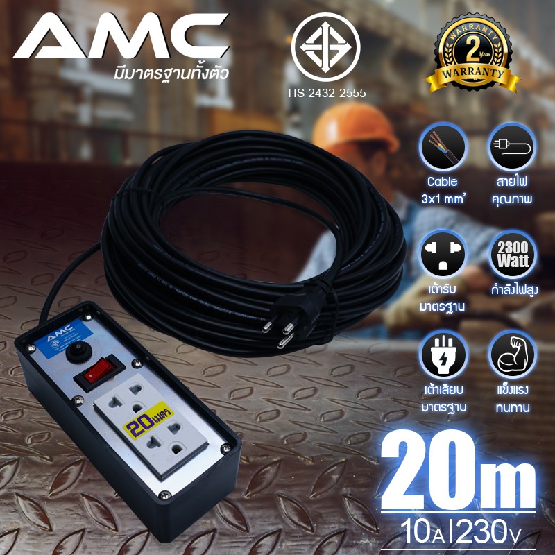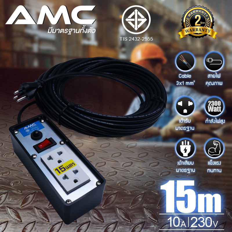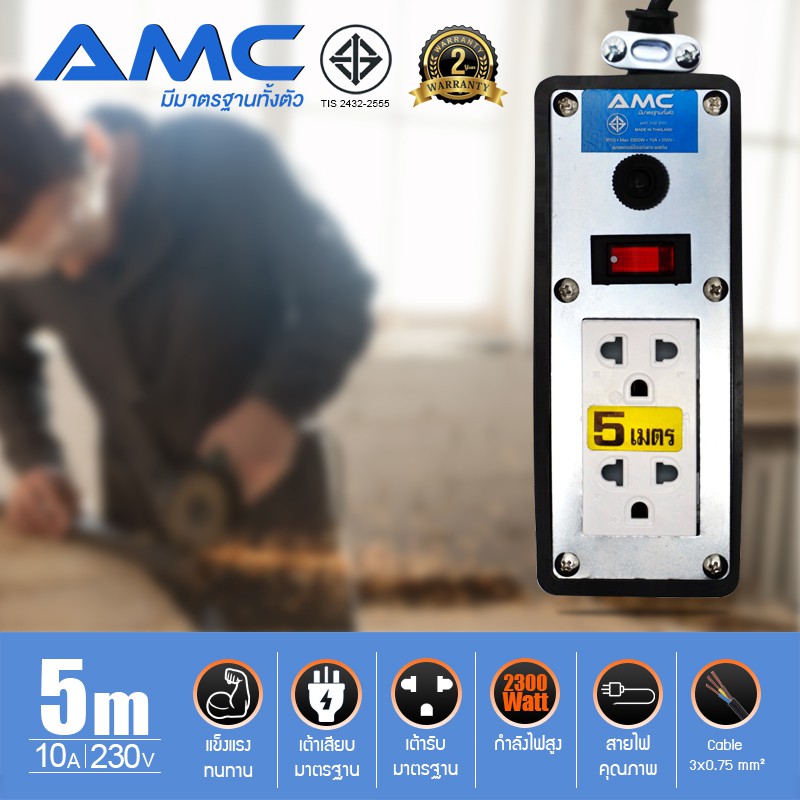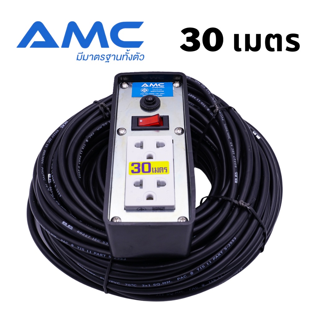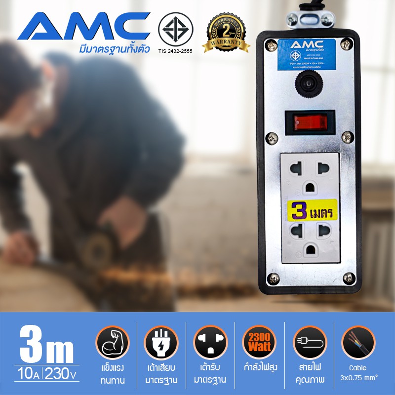 AMC ปลั๊กบล็อคยาง มาตราฐาน มอก. หน้าเหล็ก 2 ช่อง ยาว 3-30 เมตร พร้อมสวิตช์ ปลั๊กไฟ (รับประกัน 2 ปี) C12XX