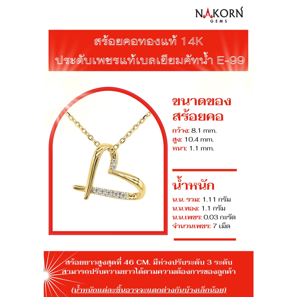 NG079 NAKORN GEMS สร้อยคอเพชรแท้ ทองคำแท้14K(ทอง58.5%) ดีไซน์จี้รูปหัวใจ พร้อมใบรับประกัน