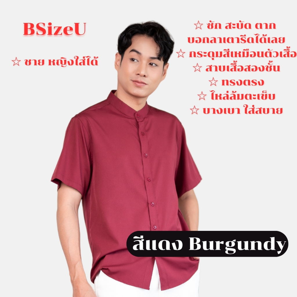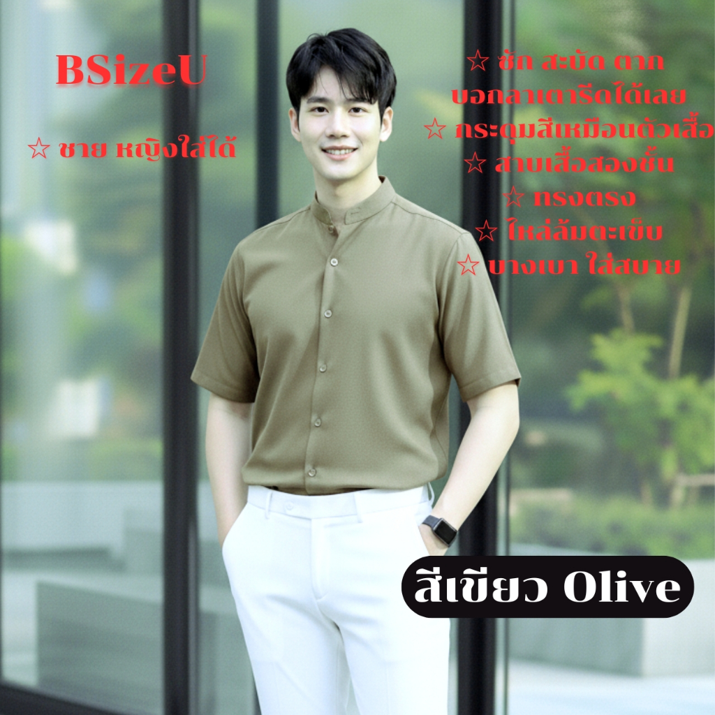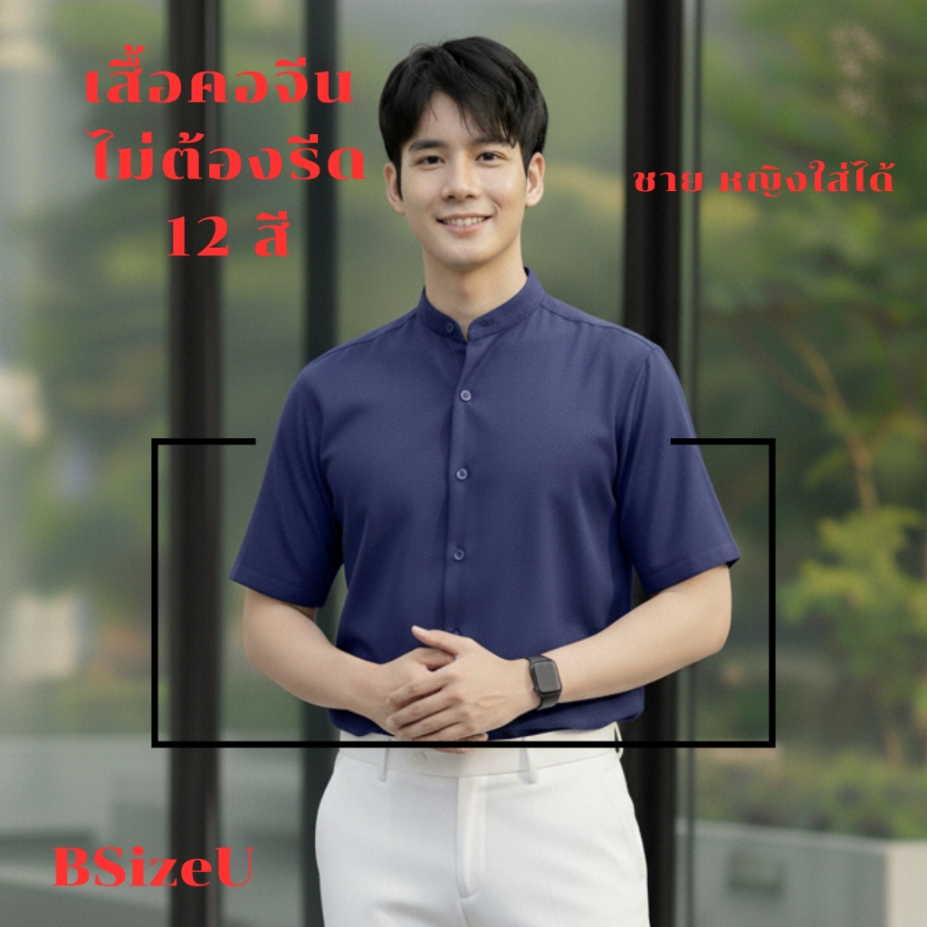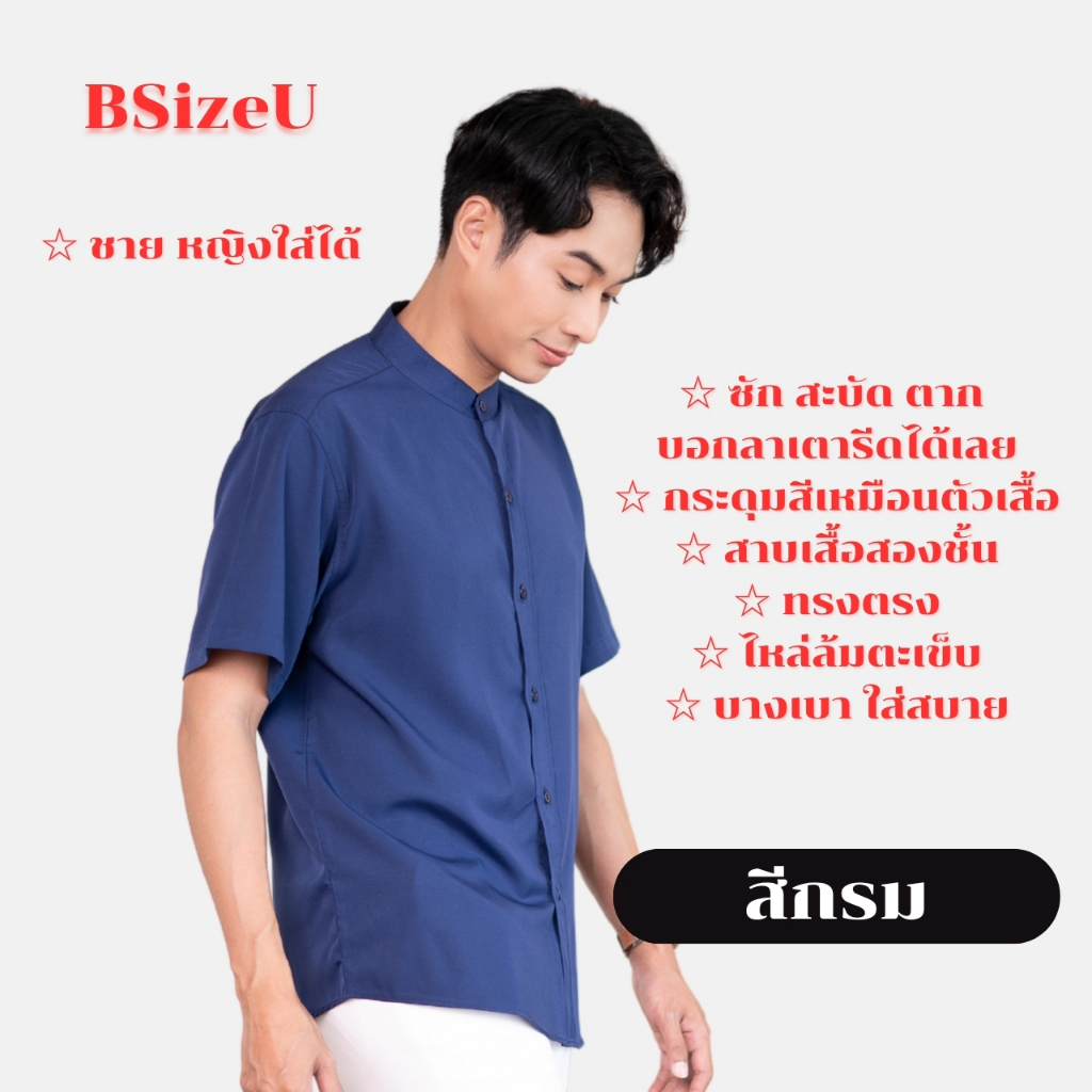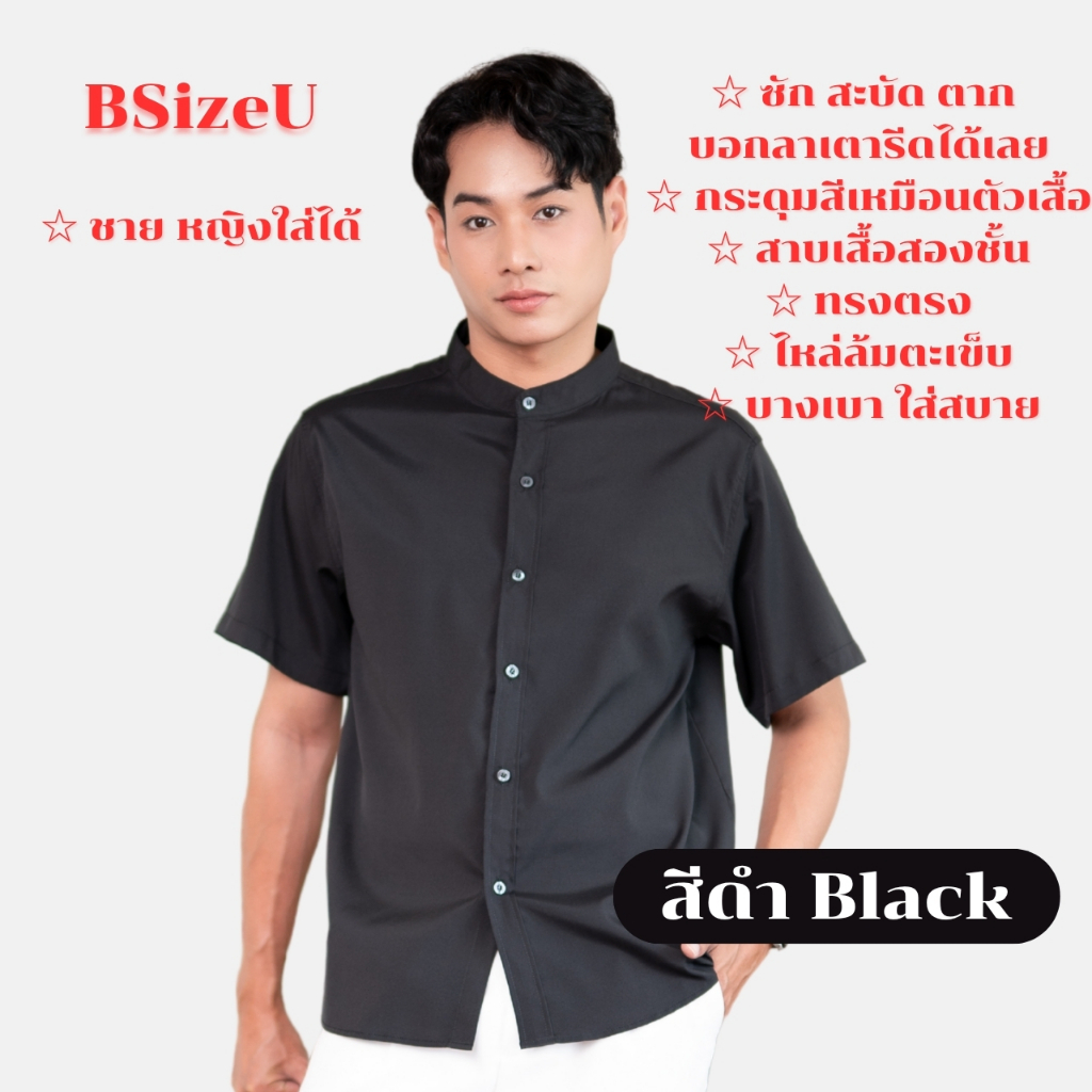 เสื้อเชิ้ตสีดำ เสื้อเชิ้ตแขนสั้น คอจีน แบรนด์ BSizeU เสื้อเชิ้ต ไม่ต้องรีด