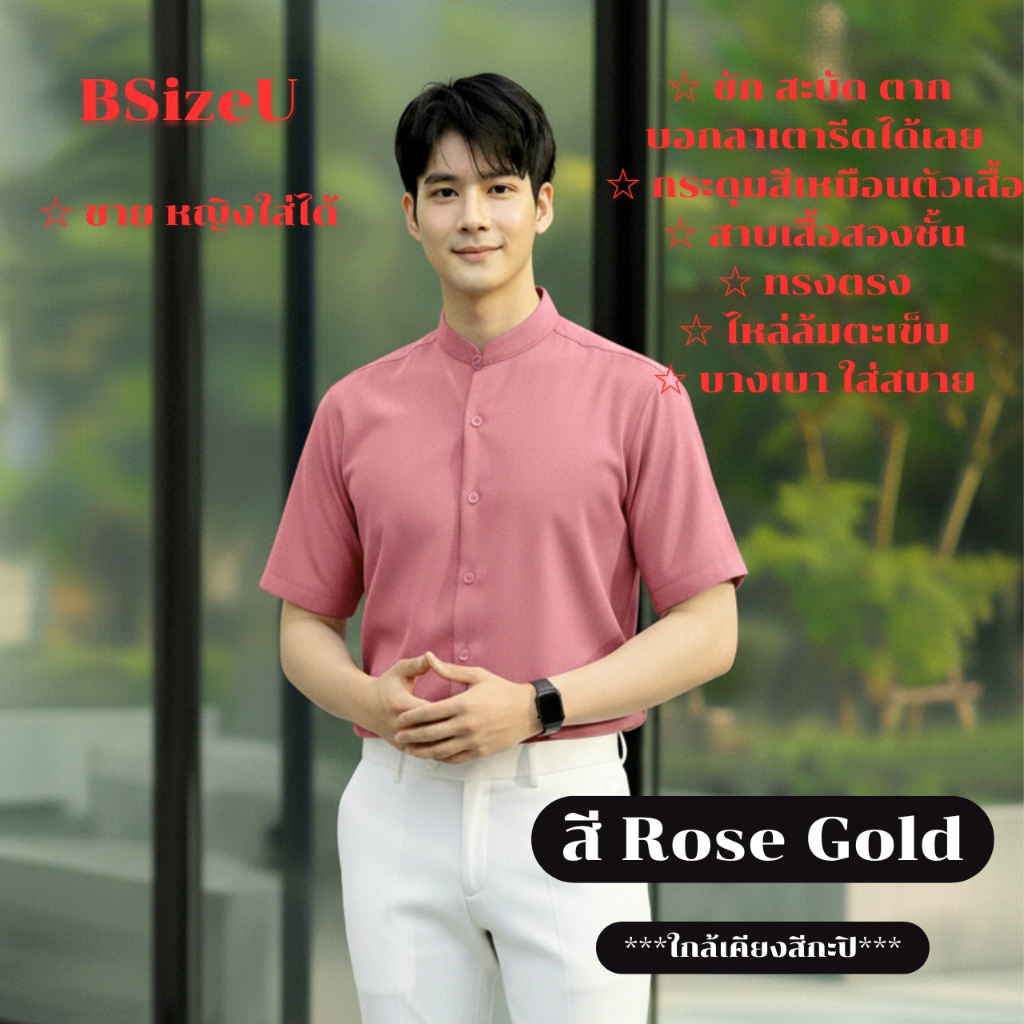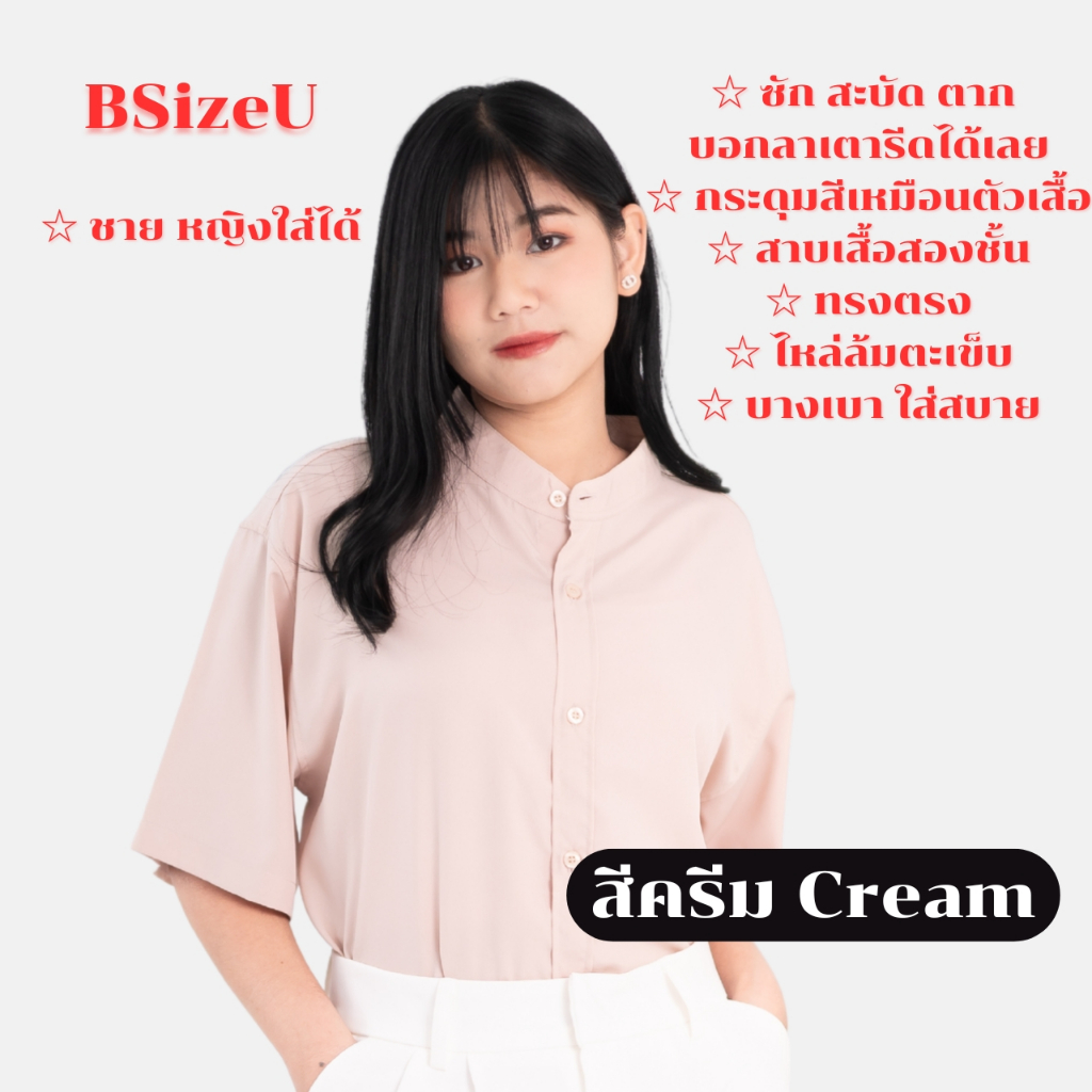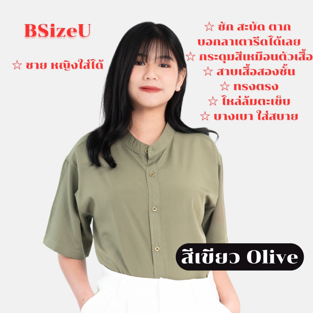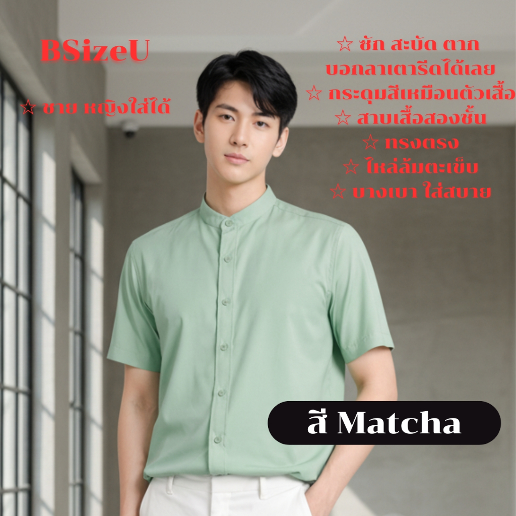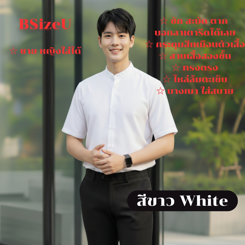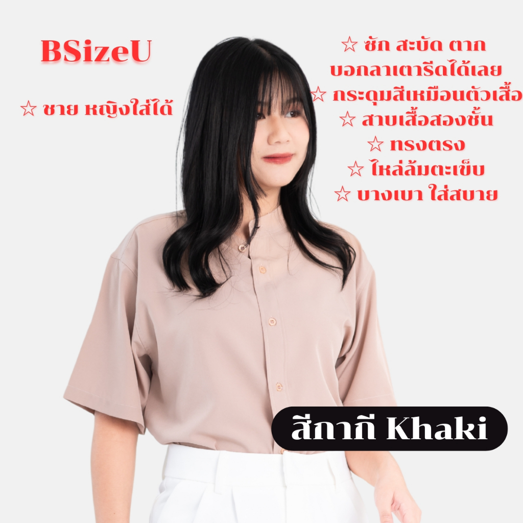 เสื้อเชิ้ตสีดำ เสื้อเชิ้ตแขนสั้น คอจีน แบรนด์ BSizeU เสื้อเชิ้ต ไม่ต้องรีด