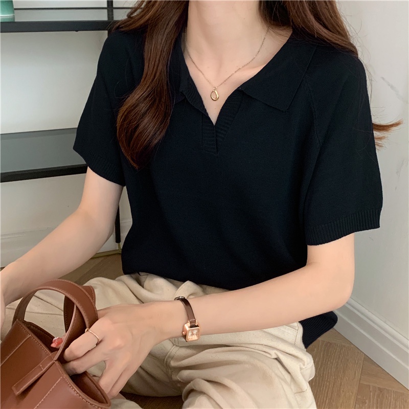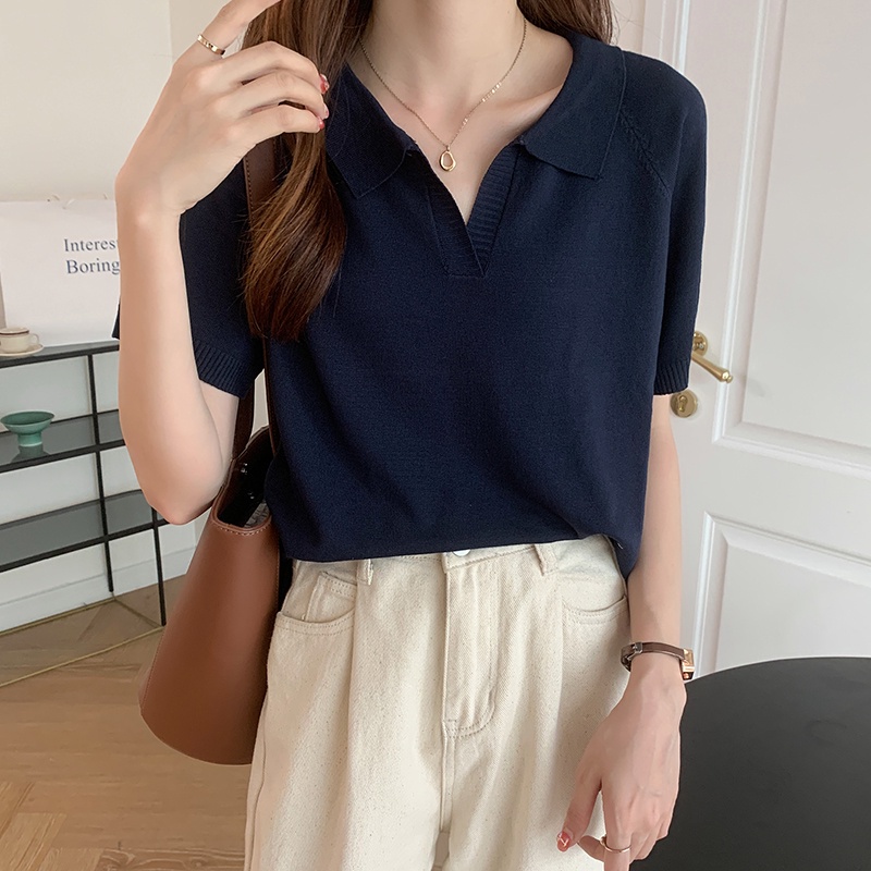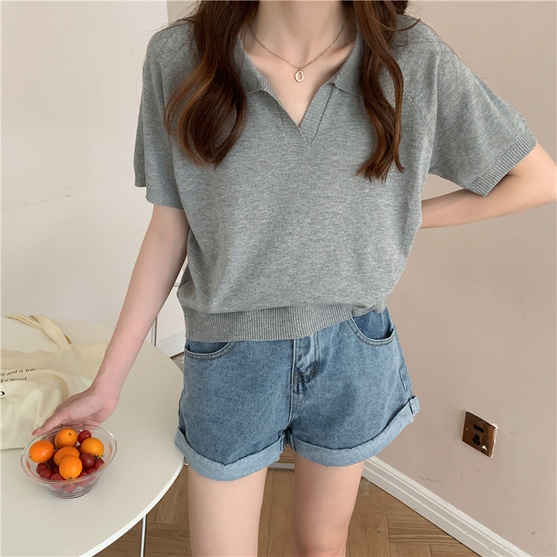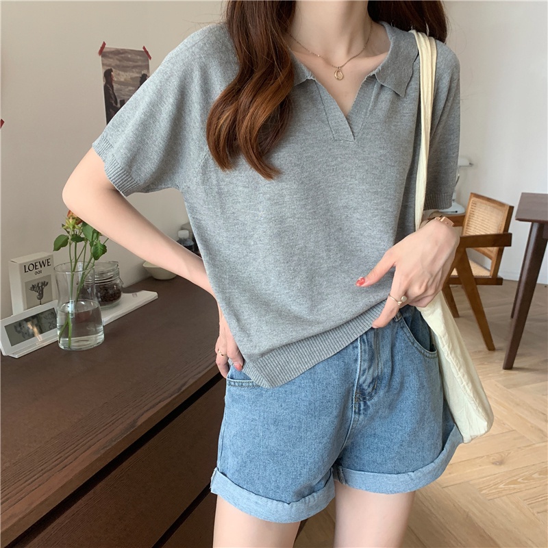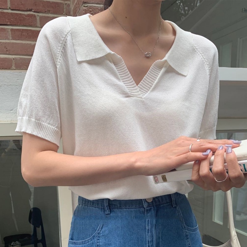 C&M เสื้อยืด แขนสั้น คอวี มีปก ทรงหลวม แฟชั่นสำหรับผู้หญิง