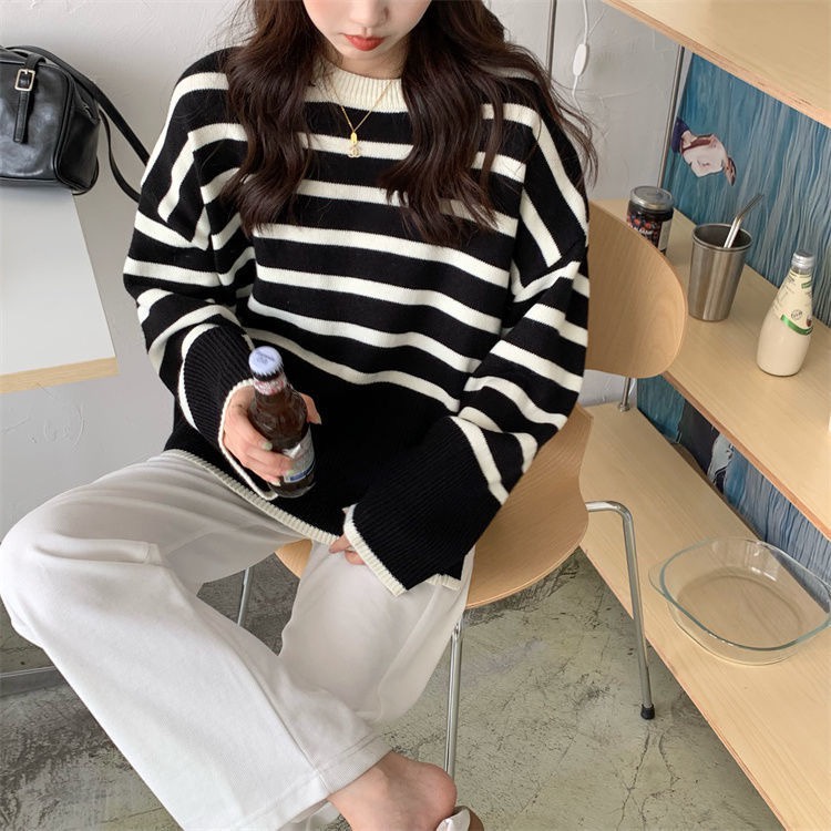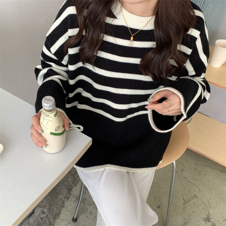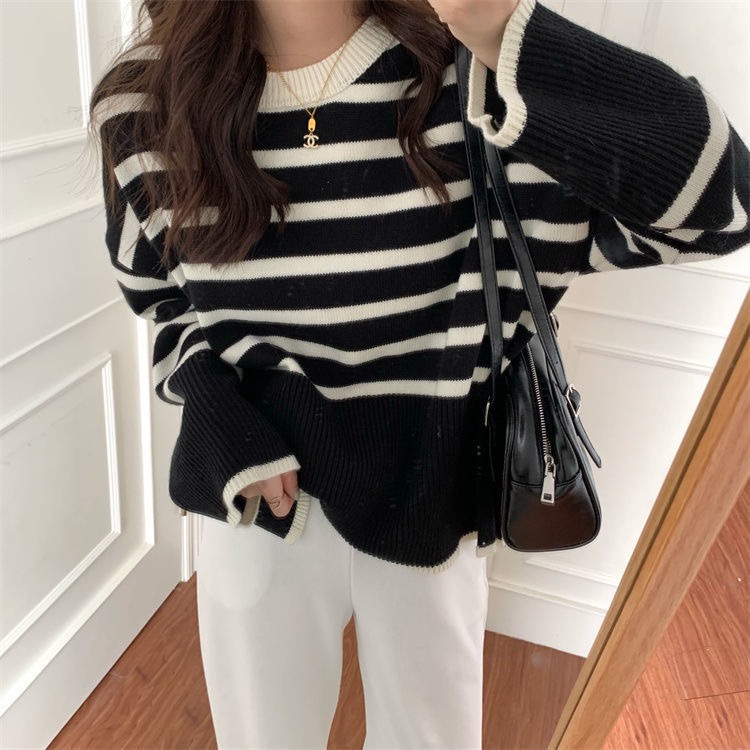 【พร้อมส่ง】เสื้อกันหนาว แขนยาว ผ้าถัก ทรงหลวม ลายทาง แฟชั่นสไตล์เกาหลี สําหรับผู้หญิง