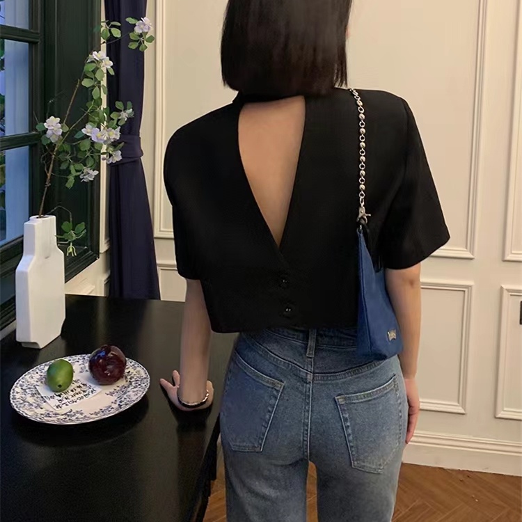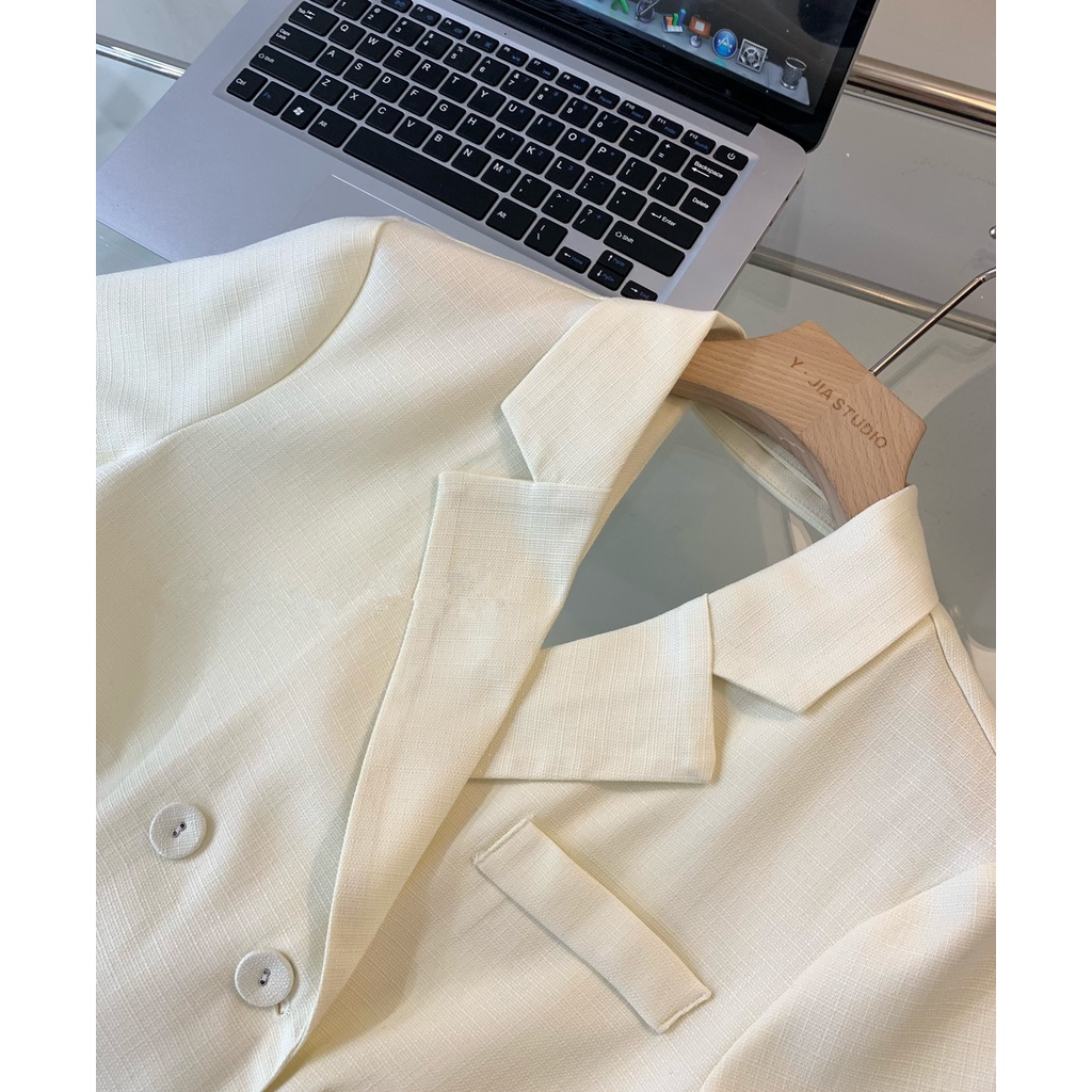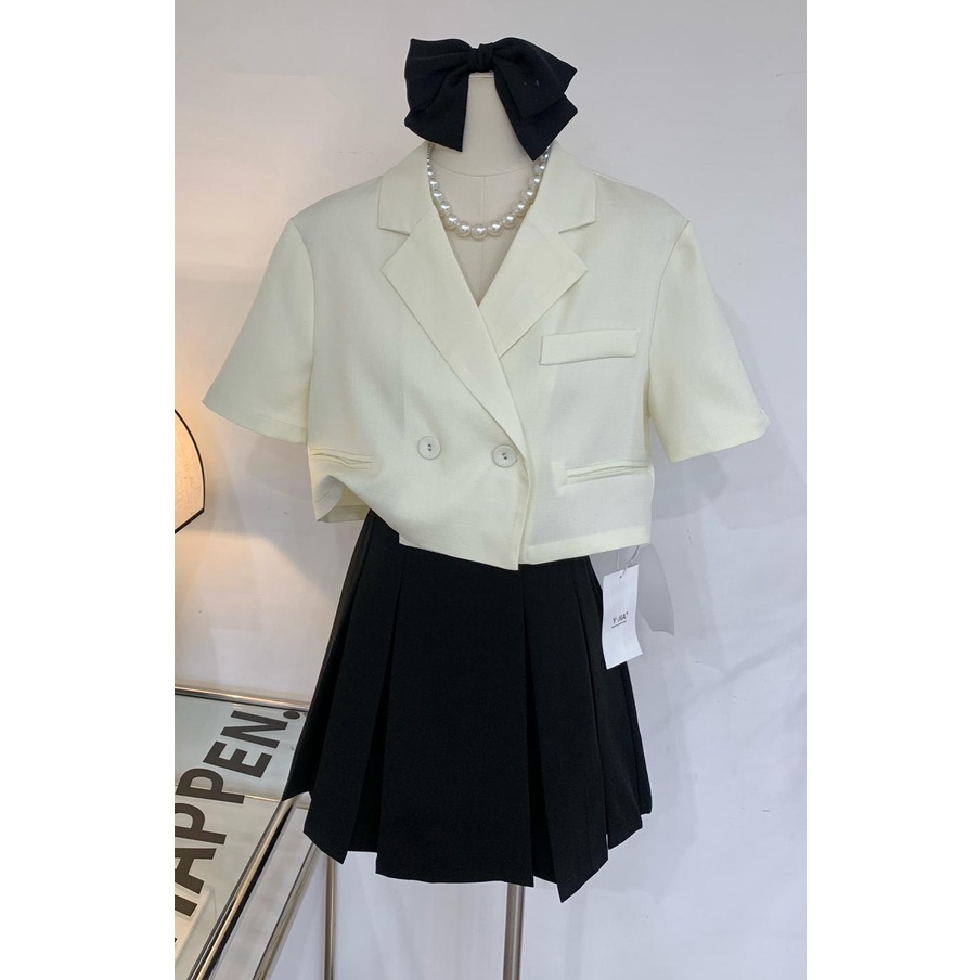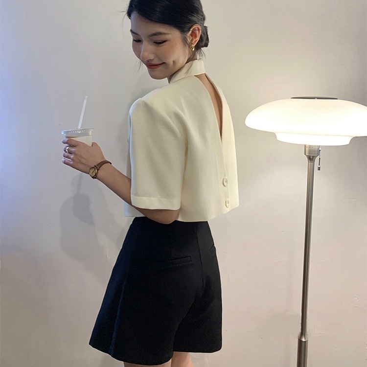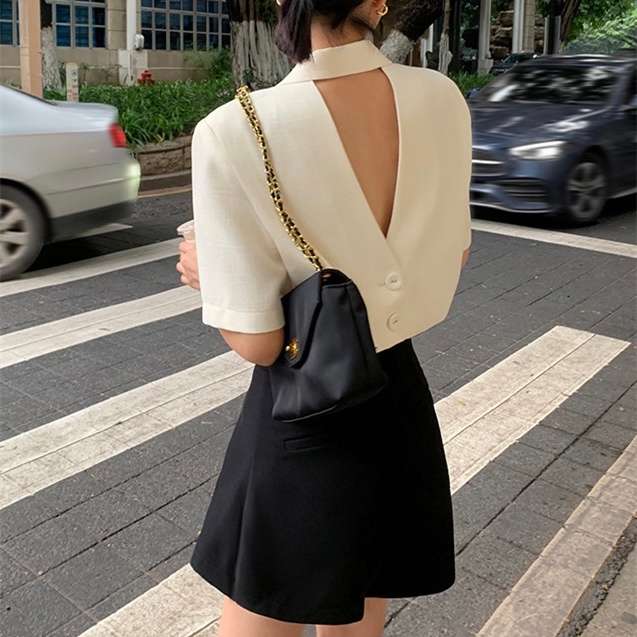C&M เสื้อแจ็คเก็ตแขนสั้นสุดชิคสไตล์เกาหลีสําหรับผู้หญิง Hollow Out Design Short Blazer