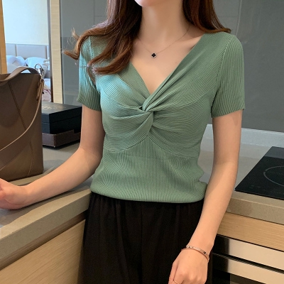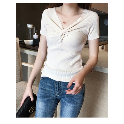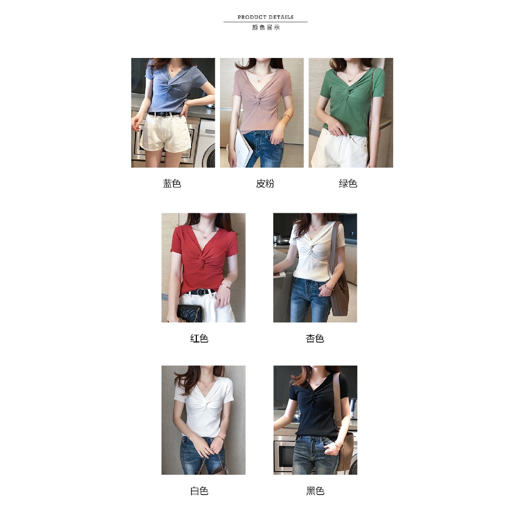 C&M เสื้อยืดผ้าร่อง คอวี แขนสั้น แต่งอกแบบไขว้ ดีไซน์เรียบหรู เซ็กซี่