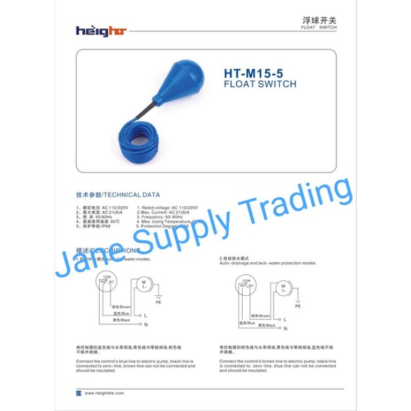 สวิทซ์ลูกลอยไฟฟ้า/ ลูกลอยน้ำเสีย/ ลูกลอยอุตสาหกรรม/ลูกลอยบ่อบำบัด ทรงหยดน้ำ 5ม. HT-M15-5