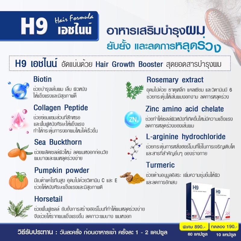 H9 วิตามินผมดก แบบทาน ลดผมร่วง เร่งผมยาว แบ่งขาย ไบโอติน 3000 ต่อเม็ด ยาแก้ผมร่วง