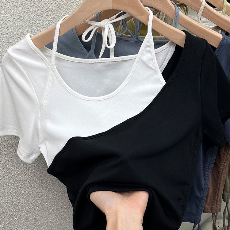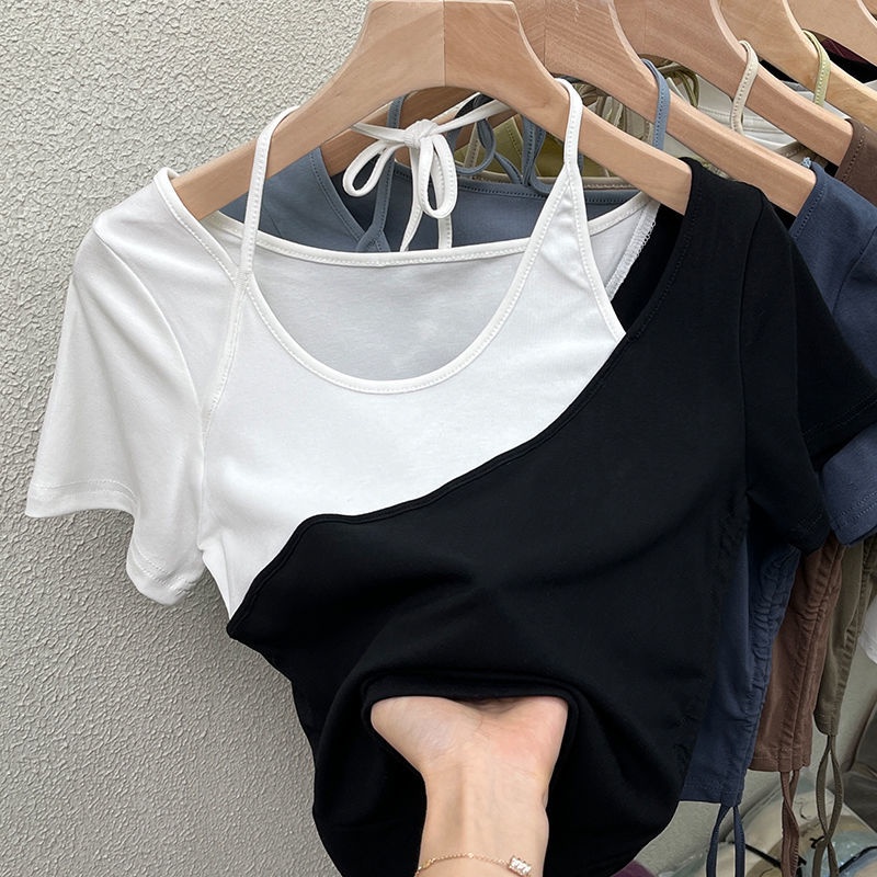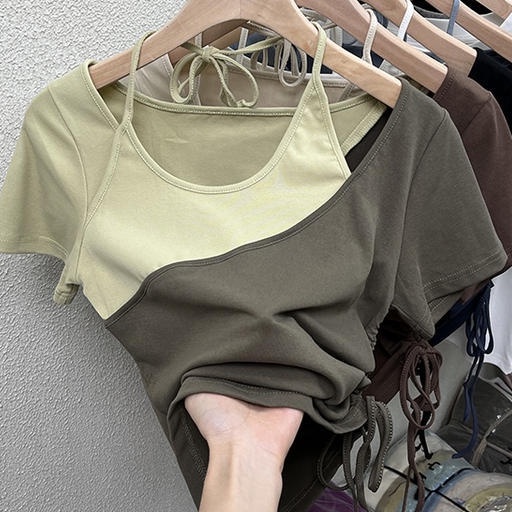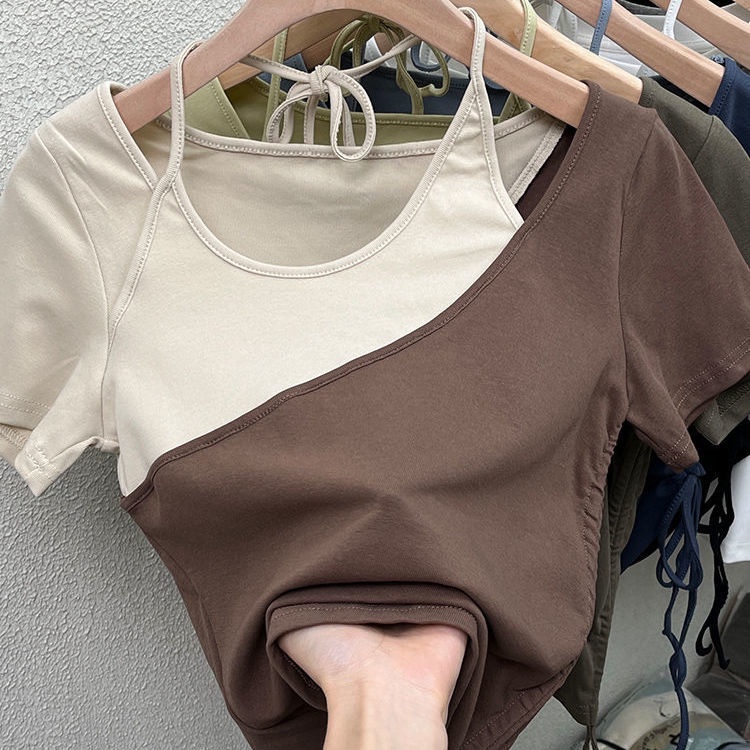 ฤดูร้อน เสื้อยืดเย็บปะติดปะต่อกันสีชนเก๋ๆของผู้หญิงเซ็กซี่และปิดไหล่