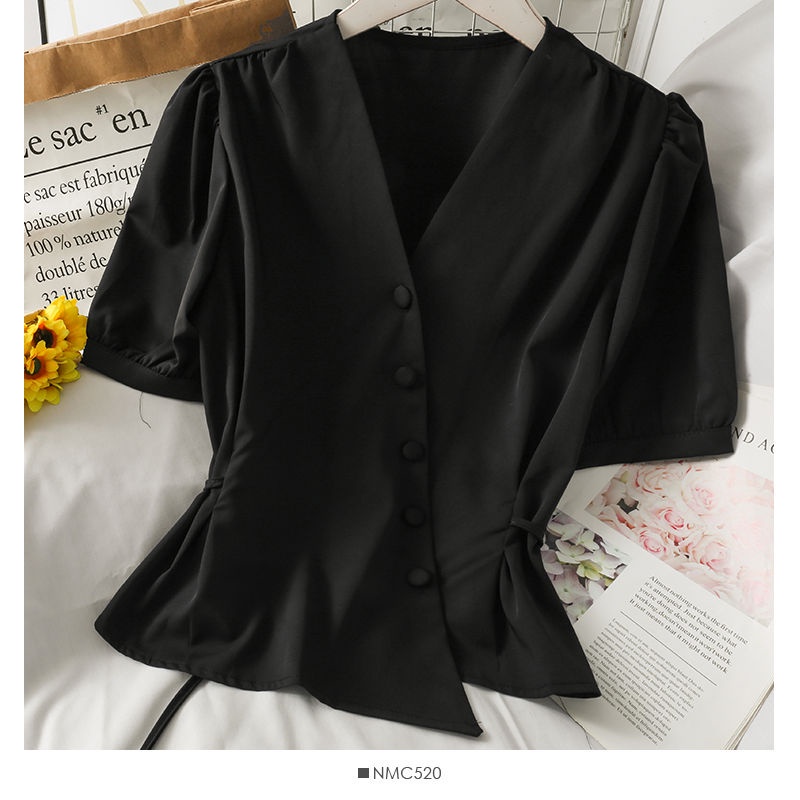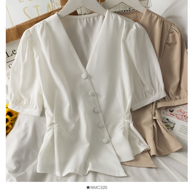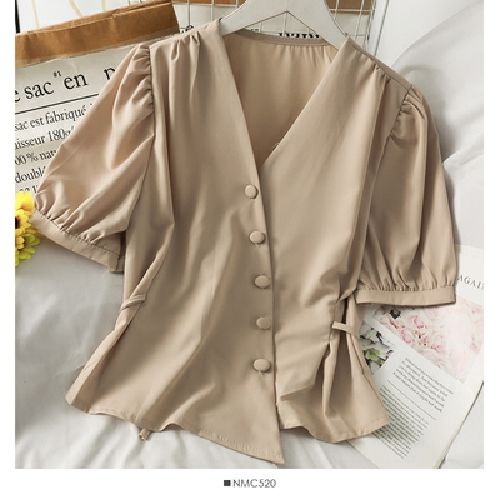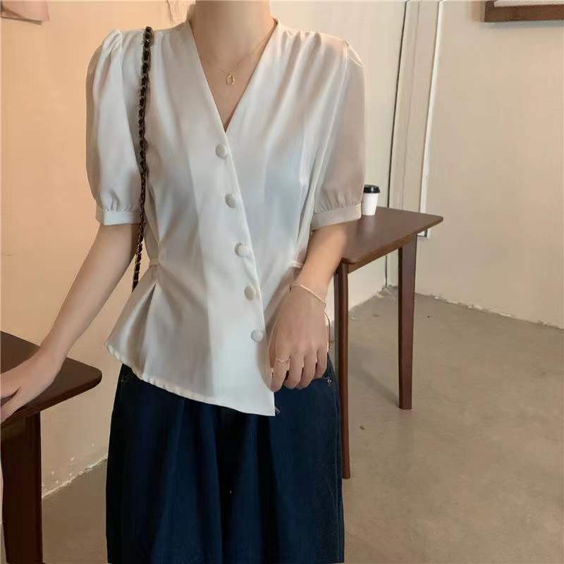 Bh Spring French Ladies เสื้อคอวีไม่สม่ําเสมอสไตล์สั้นเอวแขนฟอง
