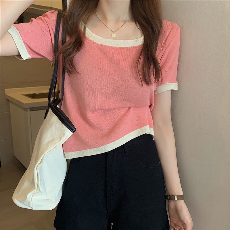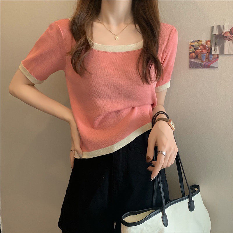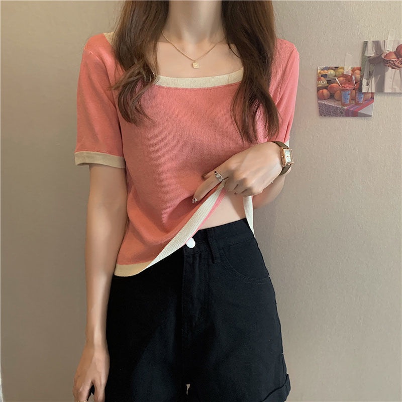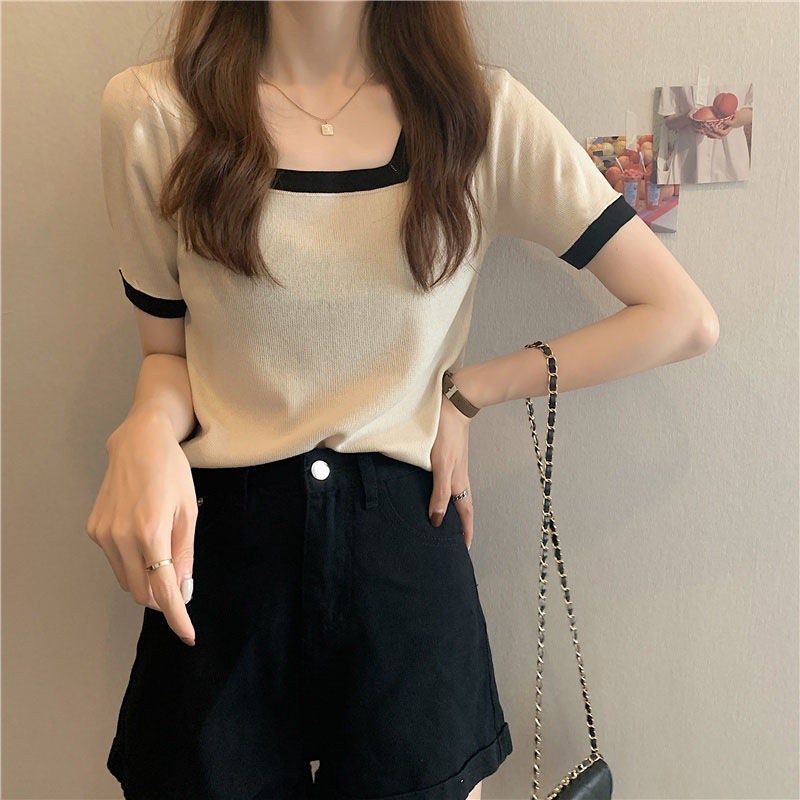 เสื้อยืดคอสี่เหลี่ยมแขนสั้นผ้าฝ้ายสไตล์เกาหลีฤดูร้อนสําหรับผู้หญิง