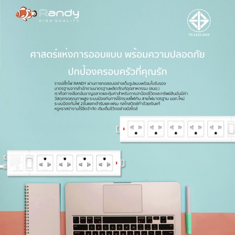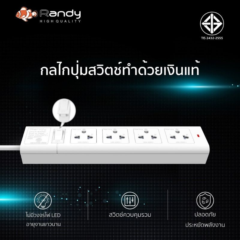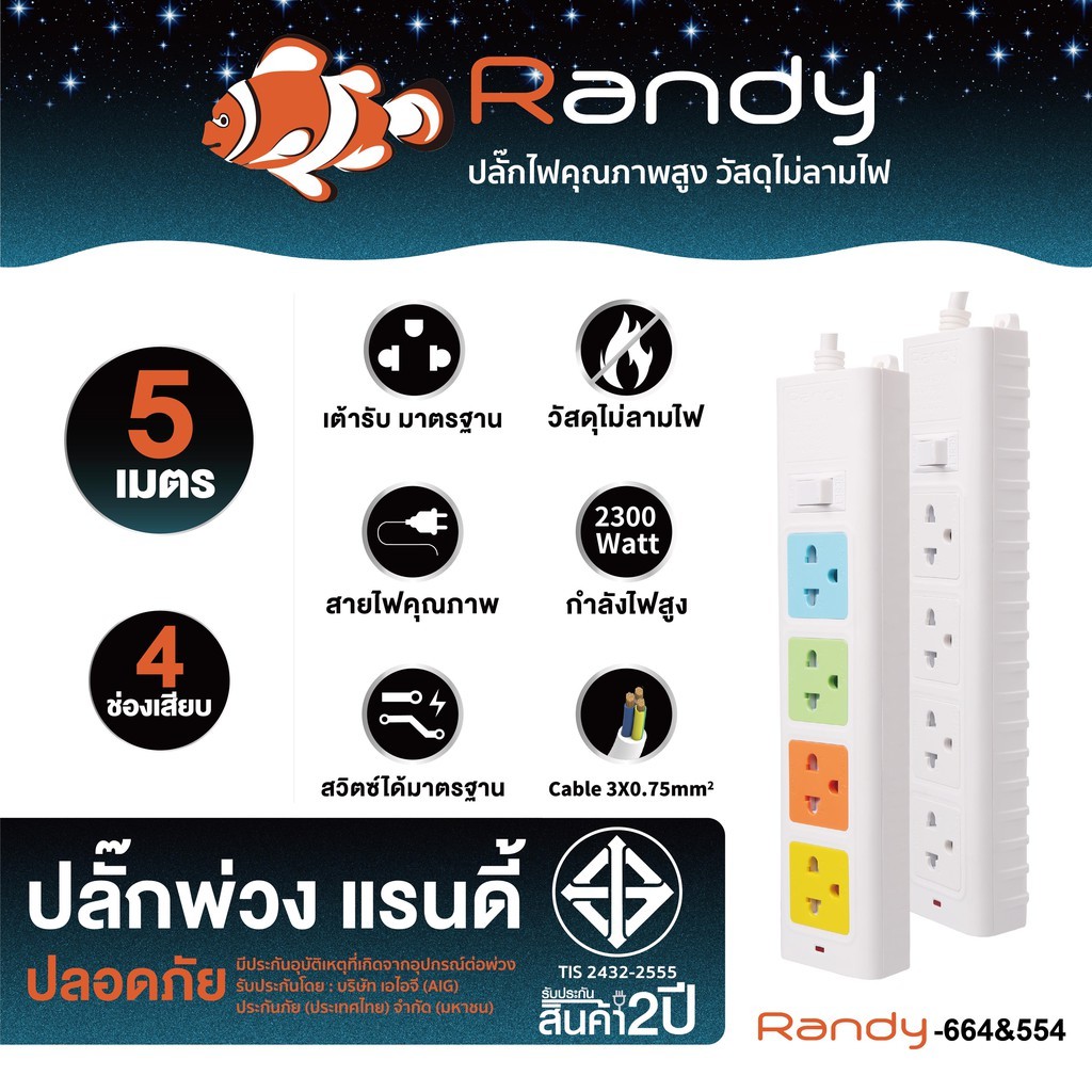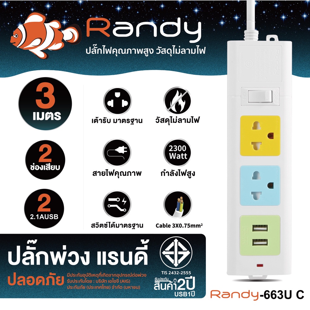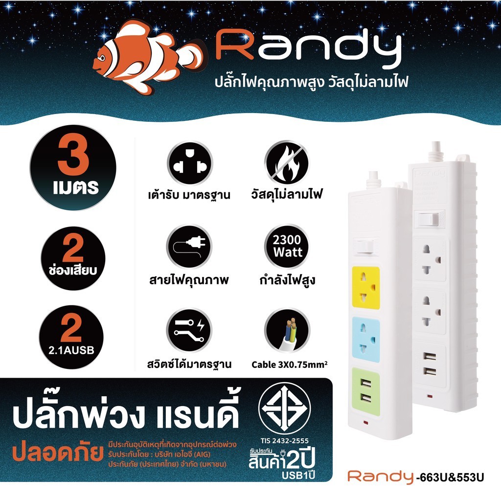 🔥โค้ดลด+ส่งฟรี🔥Randy ปลั๊กไฟ 2-6ช่อง กันไฟสองชั้น มอก. คุณภาพดี 3M5M10M ปลั๊ก ปลั๊กไฟUSB 10A2300W สาย100%ทองแดง ปลั๊