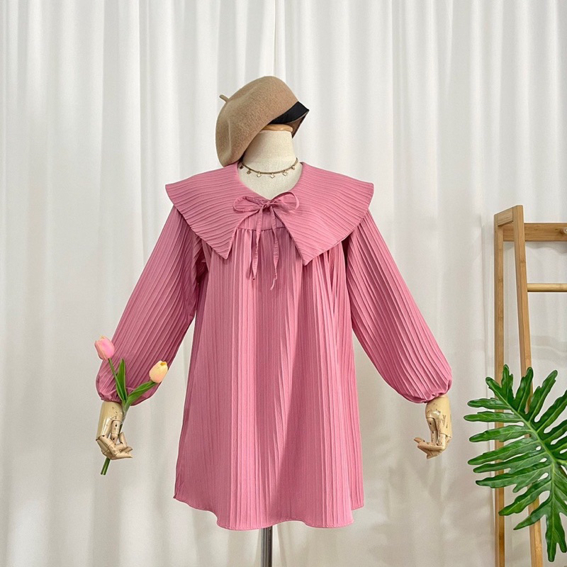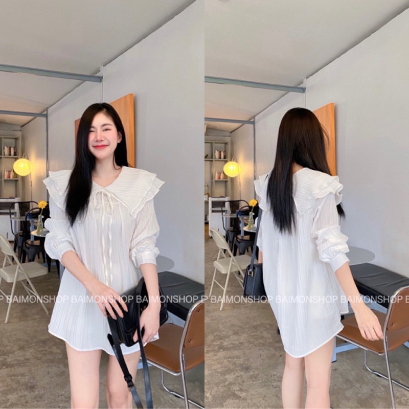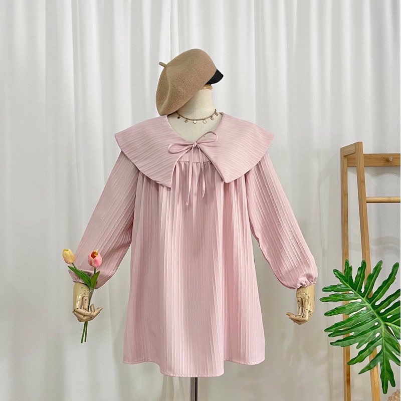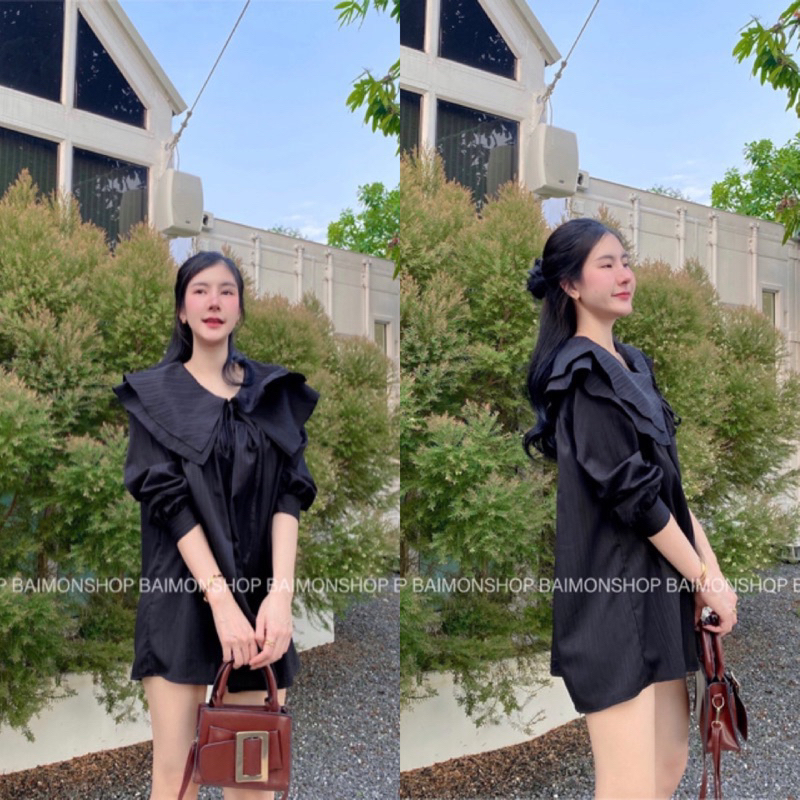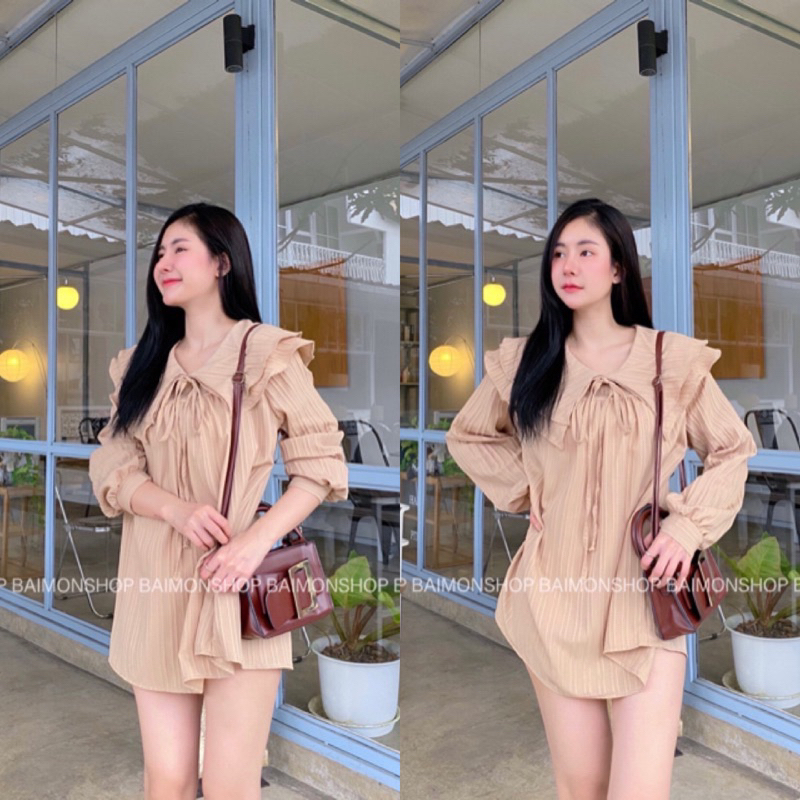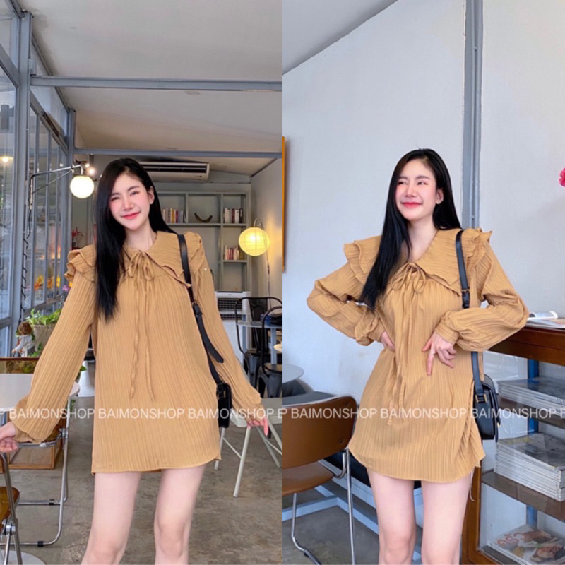 พร้อมส่ง🌈🌈Javawa shop🌈🌈1🌈( L 07 )มินิเดรสคอปกแต่งระบาย1ชั้น🌷งานแขนยาว เพิ่มโบว์ให้ผูกด้านหน้า น่ารักมากก
