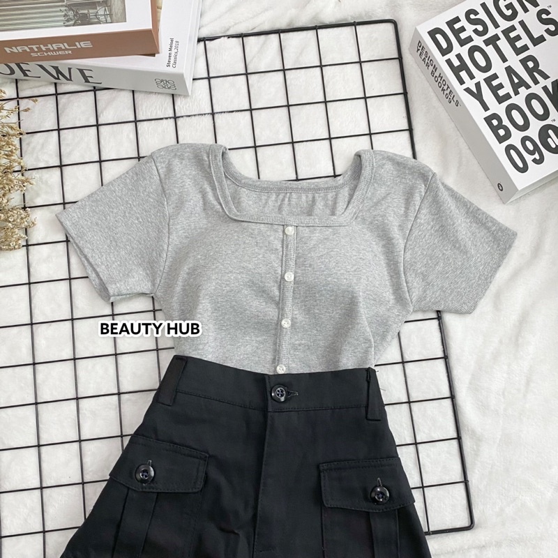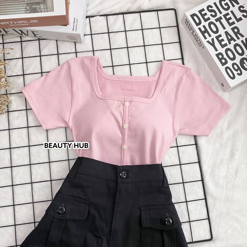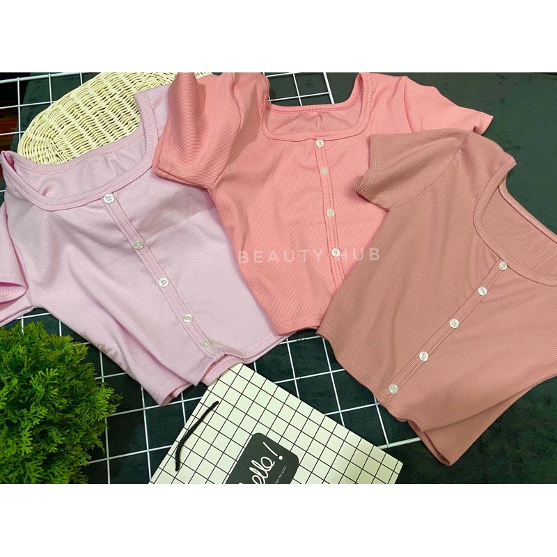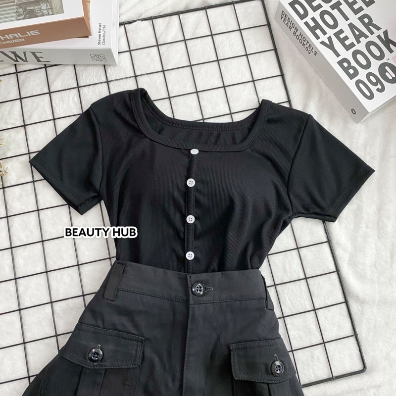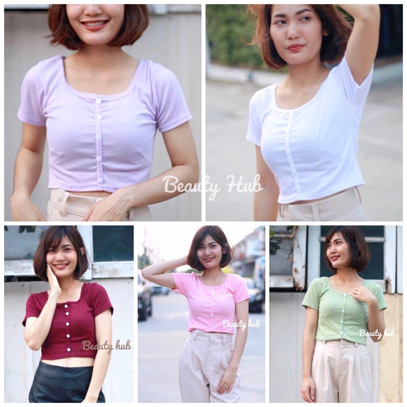 [#002] เสื้อครอป แขนสั้น แต่งกระดุมหน้า สวยเก๋ น่ารัก❤️