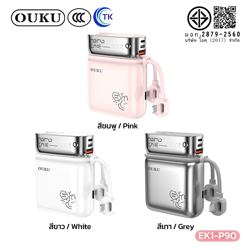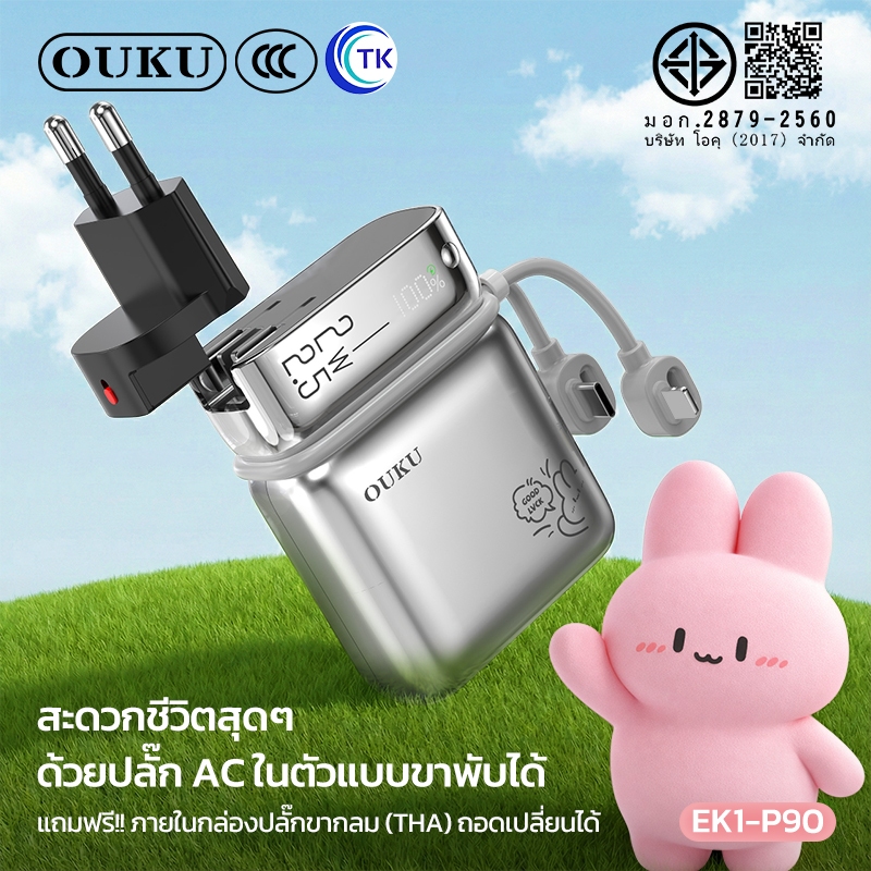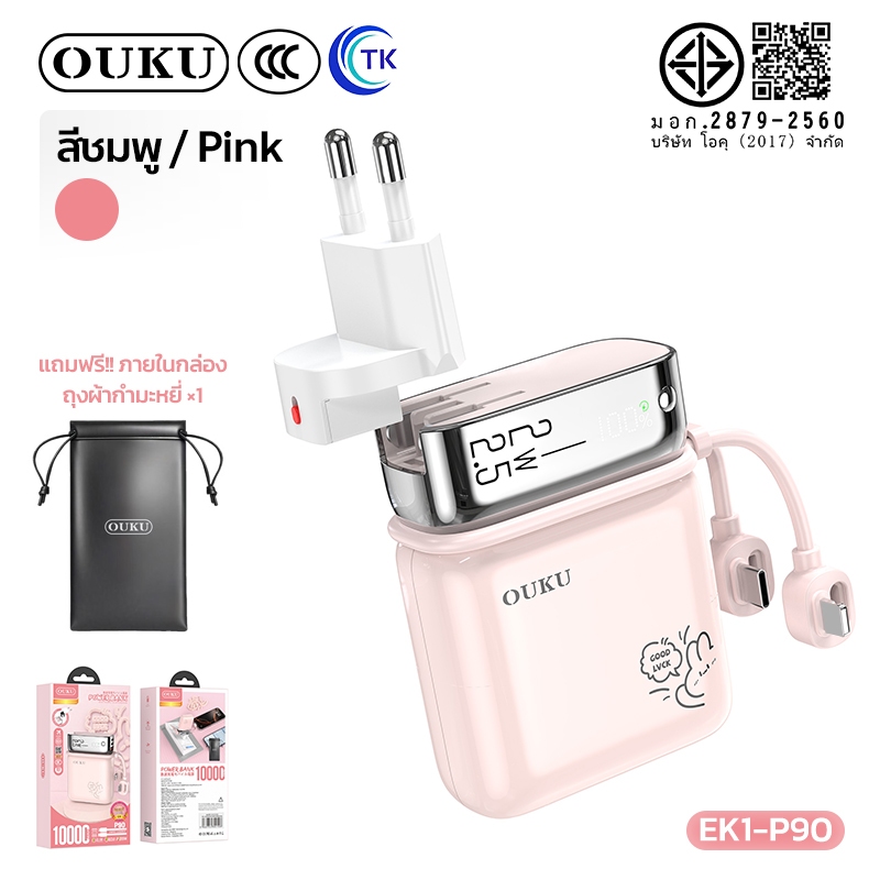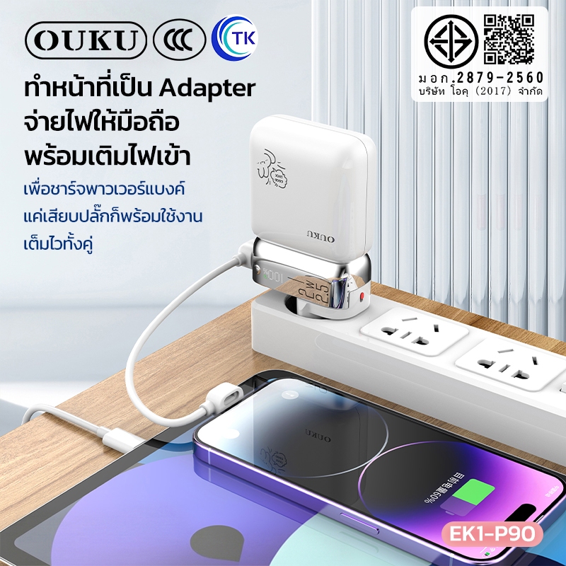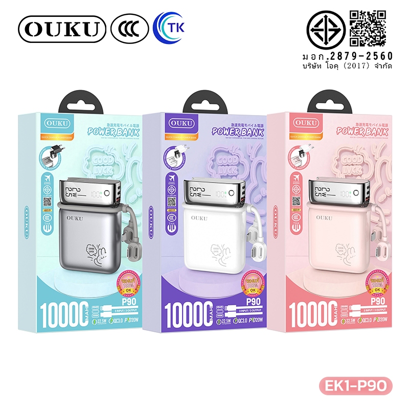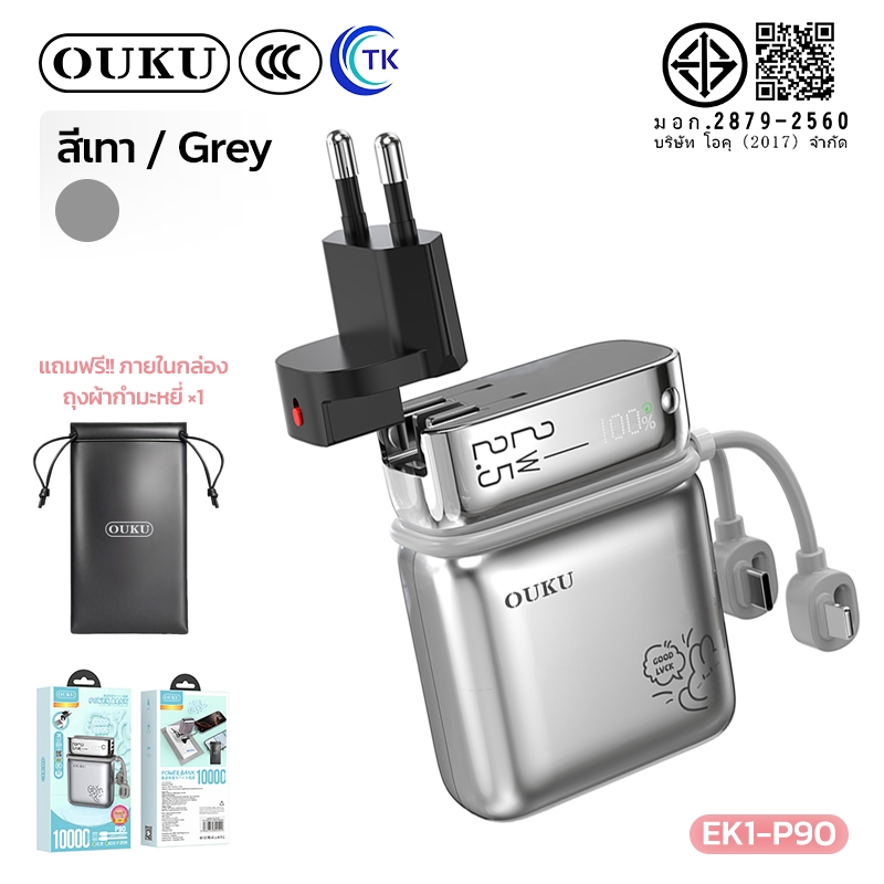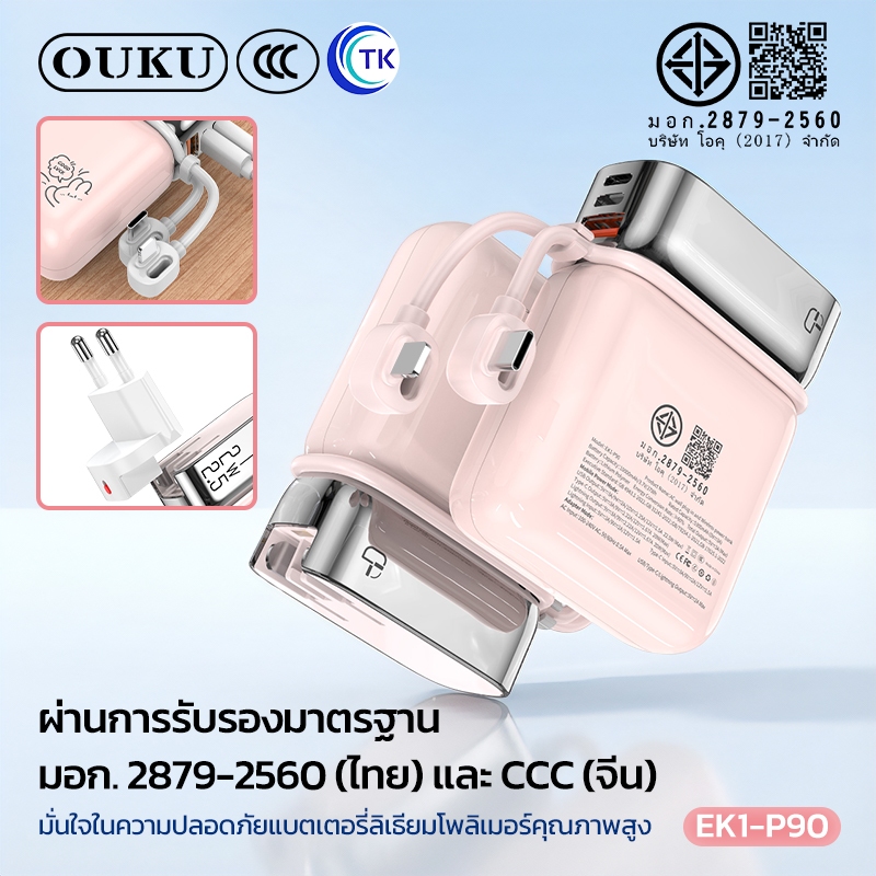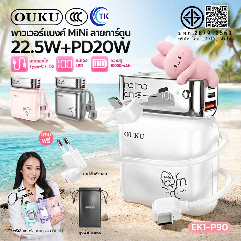 [China CCC] OUKU พาวเวอร์แบงค์ชาร์จเร็ว Mini 10000mAh สายซิลิโคนในตัว Type-C/iOS ปลั๊กขากลมถอดเปลี่ยนได้ EK1-P90