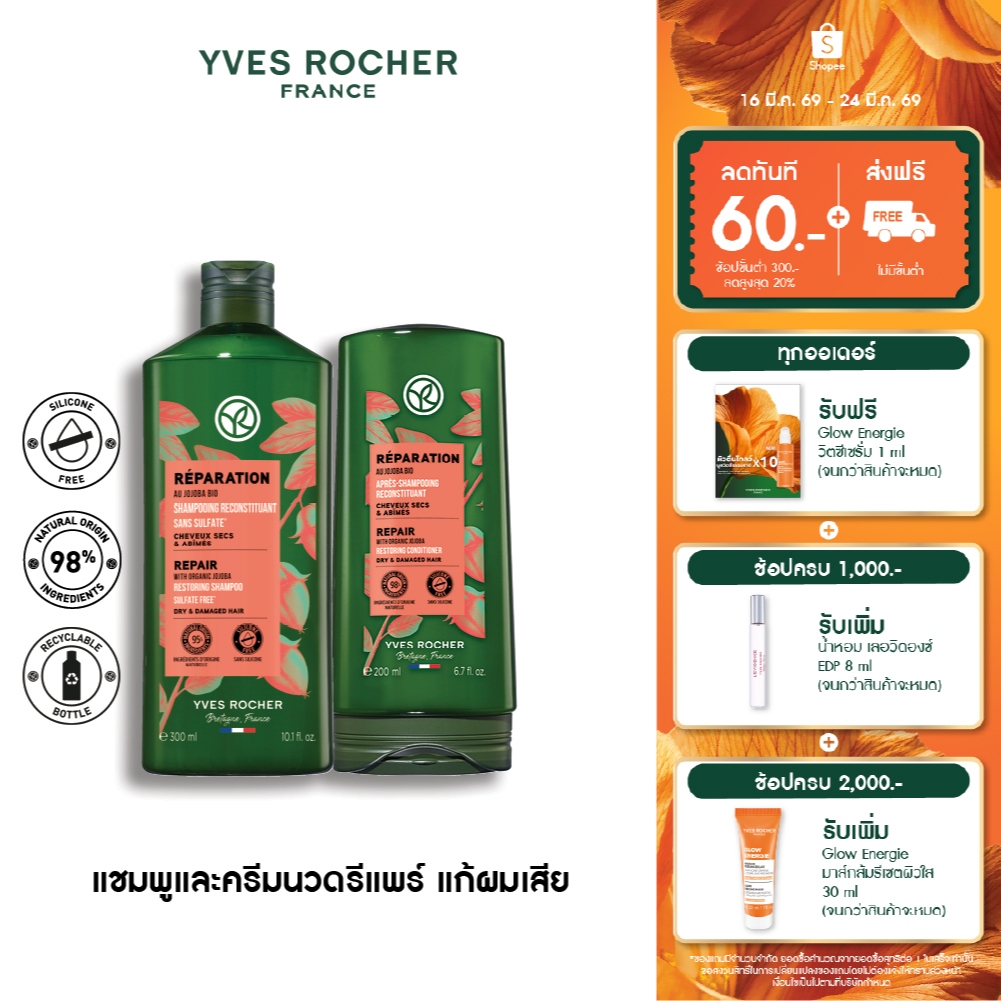 [แพ็คคู่] อีฟ โรเช Yves Rocher Reparation Shampoo300มล.&conditioner 200มล. แชมพูและครีมนวดแก้ผมเสีย - รีแพร์ถึงแกน