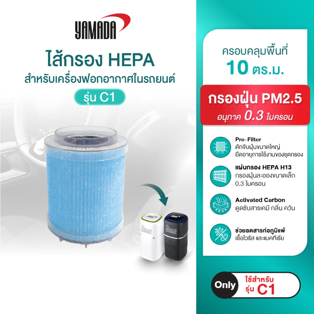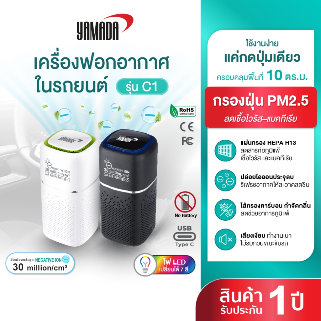เครื่องฟอกอากาศในรถยนต์ HEPA13 กรองฝุ่น ฝุ่นPM25 เชื้อไวรัส แบคทีเรีย เสียงเบา ไม่ใช้แบตเตอรี่ รุ่น C1 Yamada