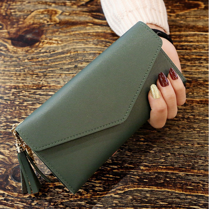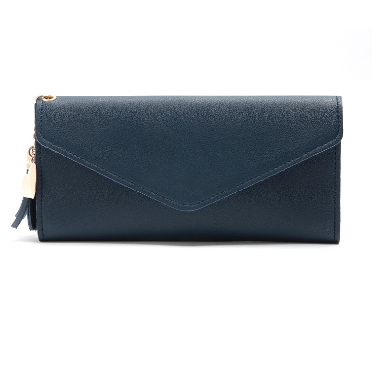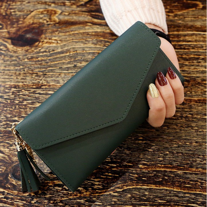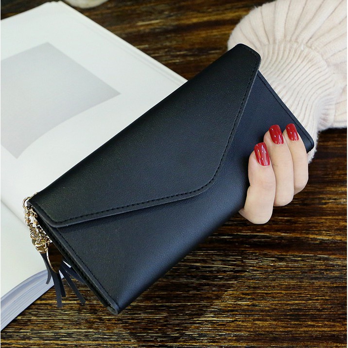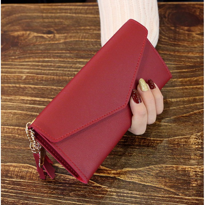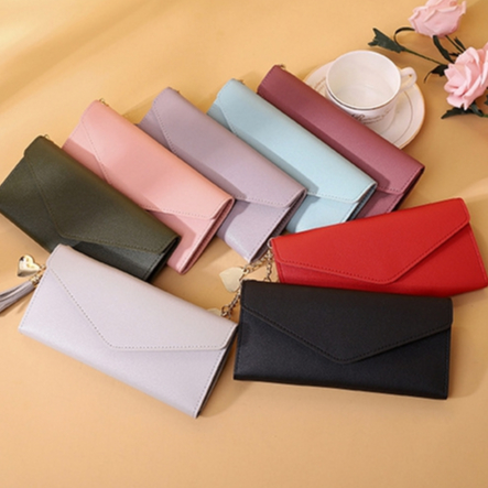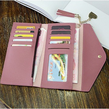 กระเป๋าสตางค์ใบยาว สีพื้น ห้อยพู่ แบบ3พับ อะไหล่สีทอง รูปหัวใจน่ารักๆ [ส่งฟรี* ไม่ต้องใช้โค้ด]