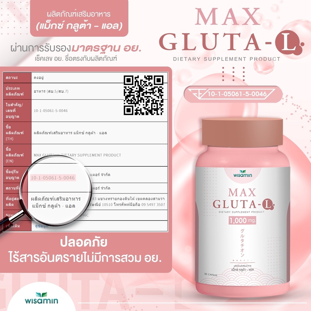 (ซื้อ 1 แถม 1) MAX GLUTA-L แม็กซ์ กลูต้า-แอล 1,000 mg/แคปซูล ผลิตภัณฑ์เสริมอาหาร (ตราวิษามิน) จำนวน 2 กระปุก 60 แคปซูล