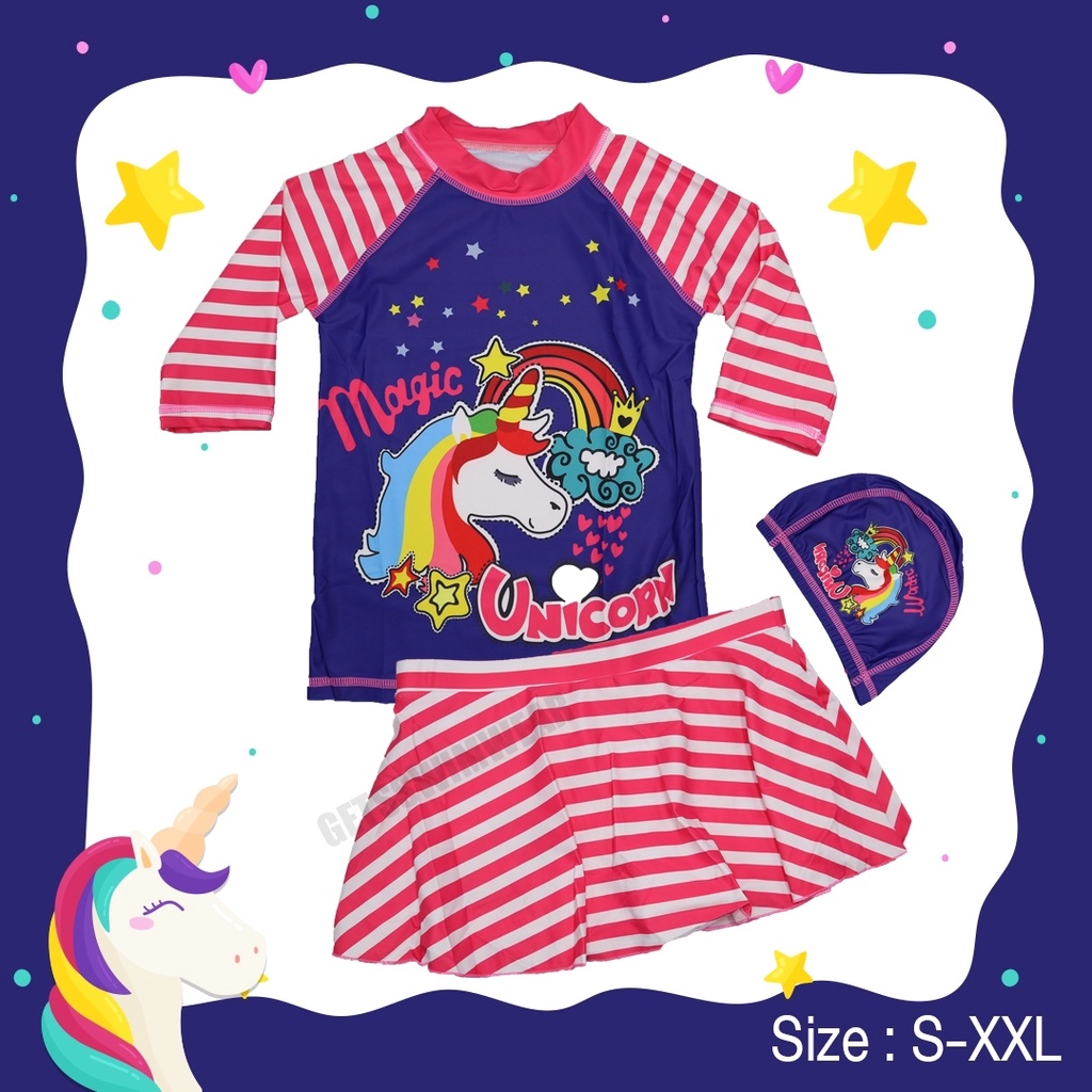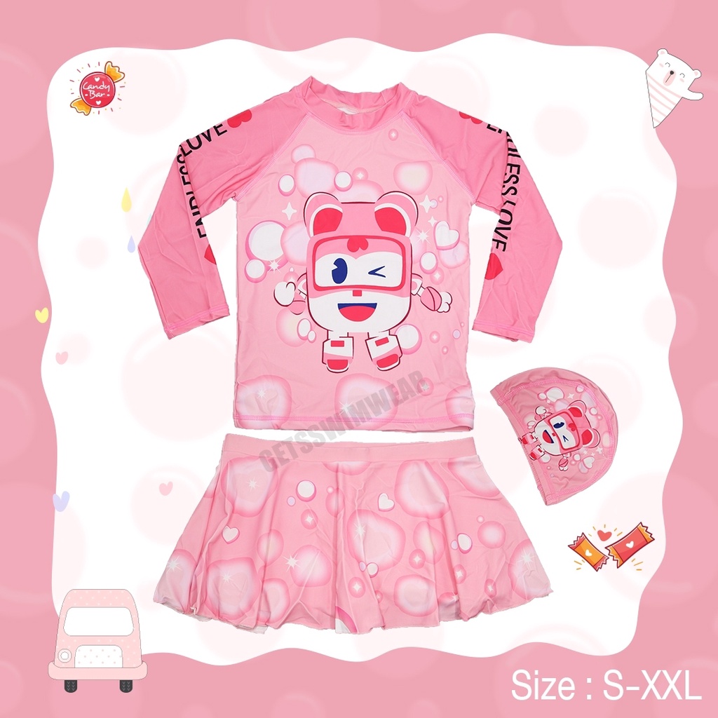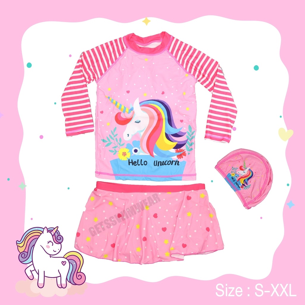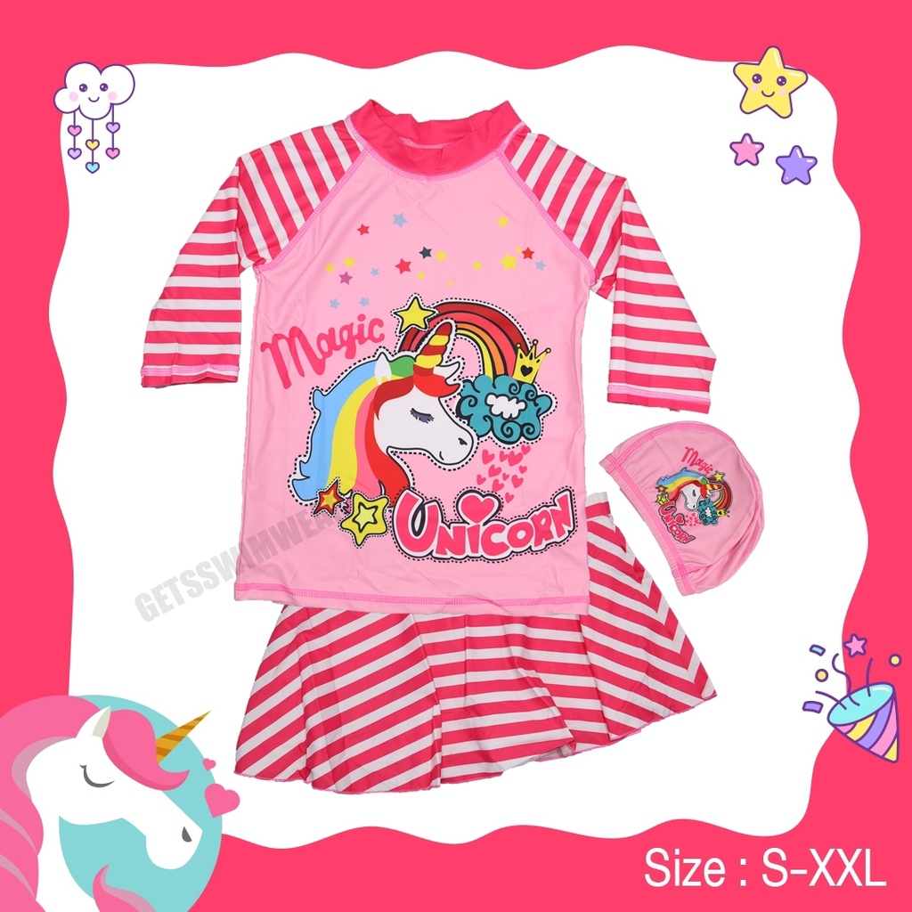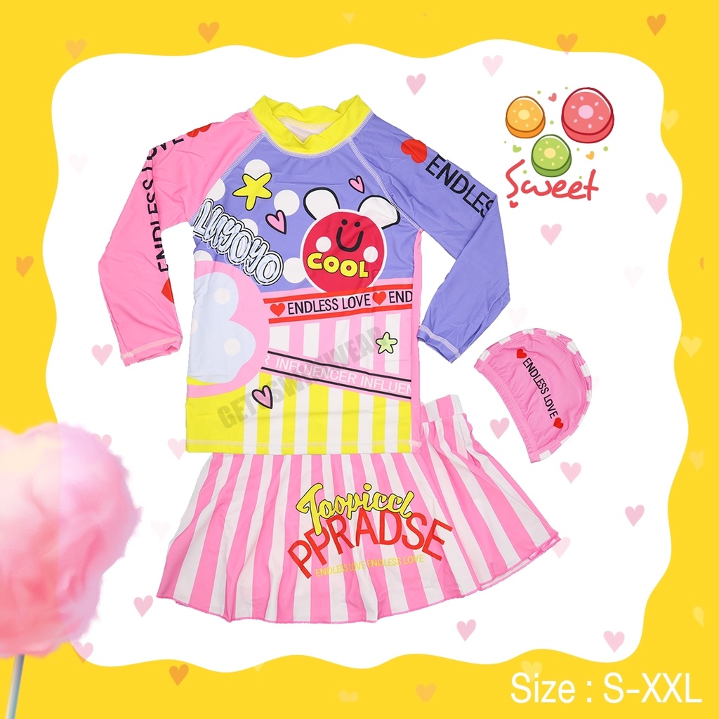 🌈ชุดว่ายน้ำเด็กผู้หญิงสุดคัลเลอร์ฟูล สีสันน่ารักสดใส #2039 Set2ชิ้น กระโปรงมีซับในอย่างดี+มาพร้อมหมวก🌈