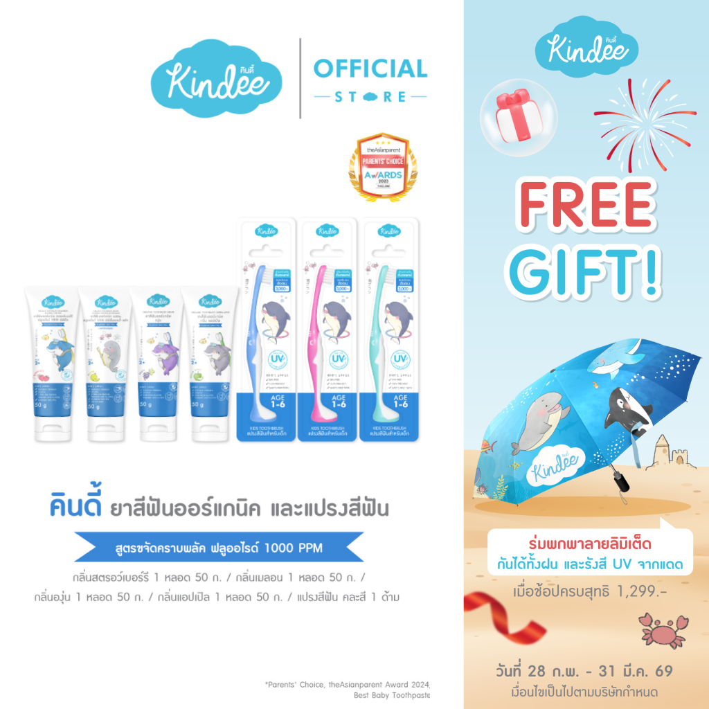Kindee คินดี้ แปรงสีฟัน ยาสีฟันออร์แกนิค สูตรฟลูออไรด์ 1000 PPM (50 กรัม)