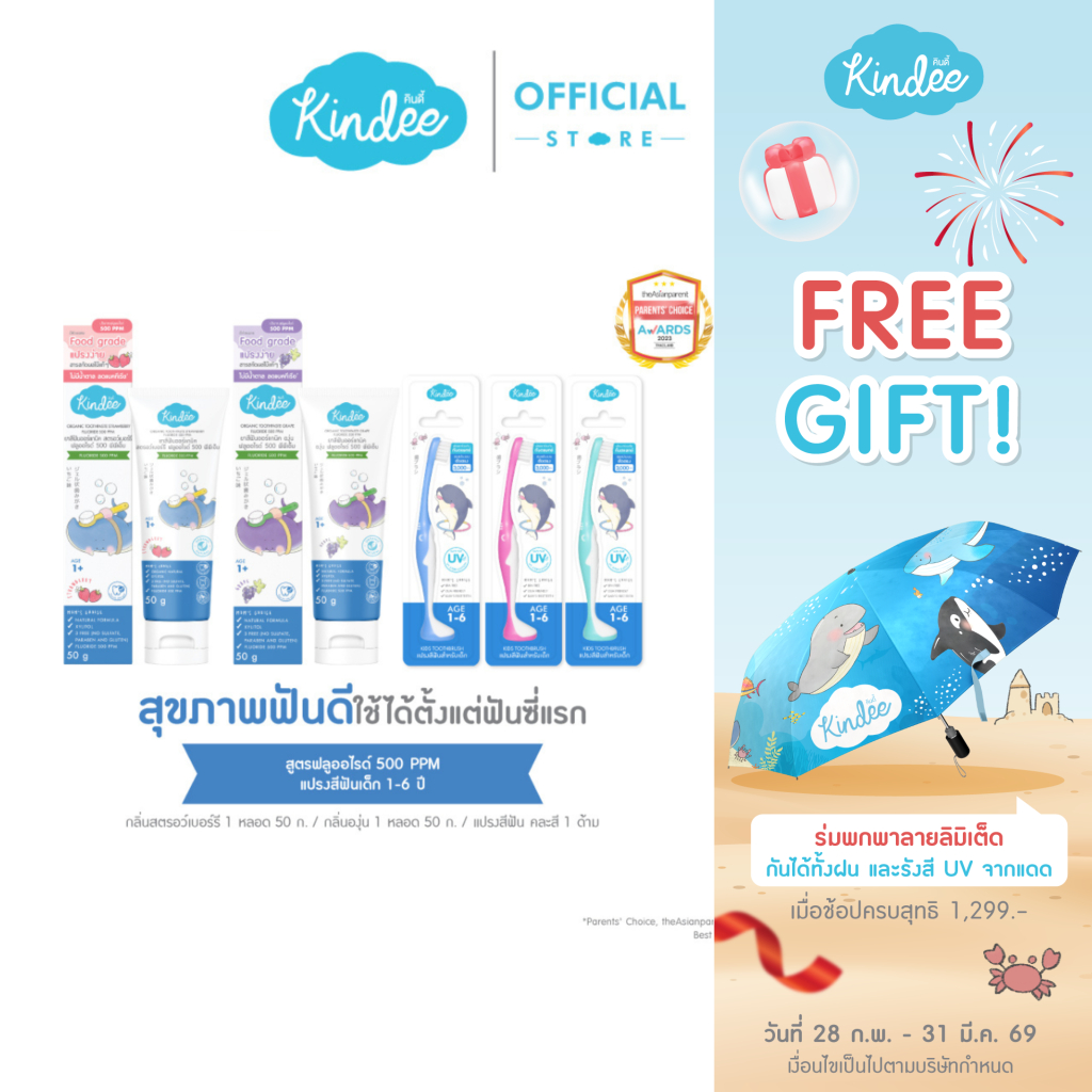 Kindee คินดี้ แปรงสีฟัน ยาสีฟันออร์แกนิค สูตรฟลูโอไรด์ 500PPM รสสตรอเบอร์รีและองุ่น (50 กรัม)