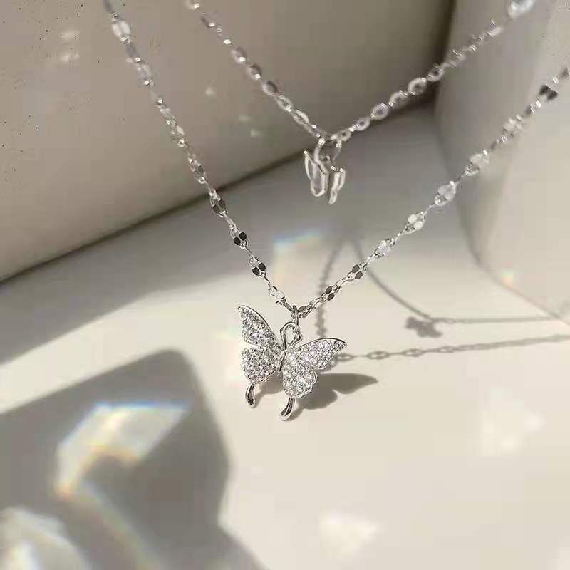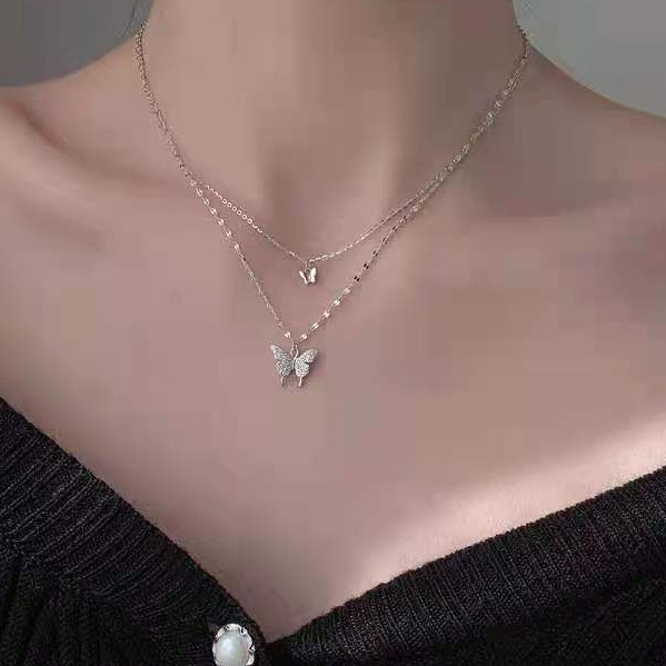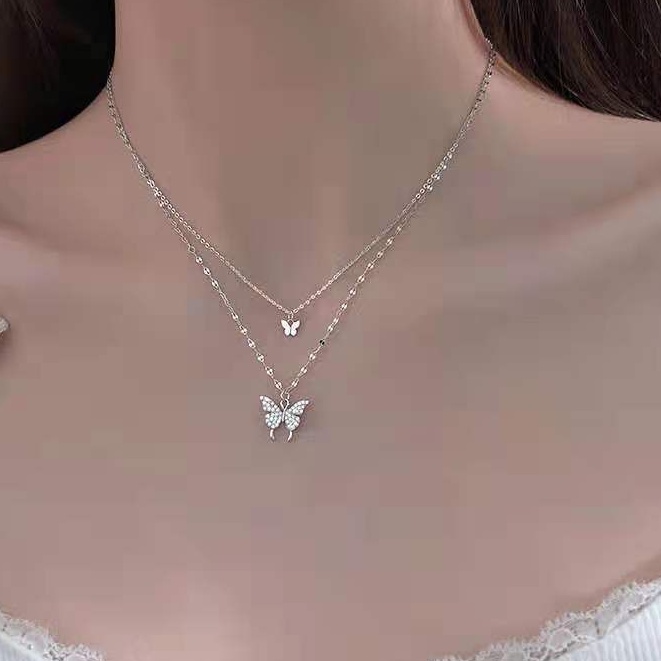 สร้อยคอ ผีเสื้อสองชั้น ประดับเพชร สร้อยคอโซ่ผีเสื้อ สร้อยเงิน จี้ผีเสื้อ เครื่องประดับแฟชั่น ผู้หญิง สไตล์เกาหลี N31/B39
