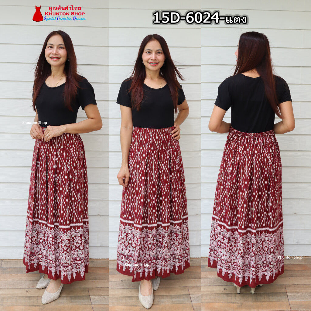 15D-01 กระโปรงผ้าไทย ทรงจีบทวิส ผ้าฝ้ายพิมพ์ลาย เนื้อนิ่มใส่สบาย ขนาดฟรีไซส์ เอวสม็อคหลังเอว 28-34