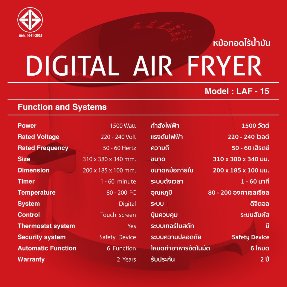 Lucky Flame หม้อทอดไร้น้ำมัน รุ่น LAF-15 air fryer หม้อทอด 3.5 ลิตร 6ฟังก์ชั่นการทำงาน