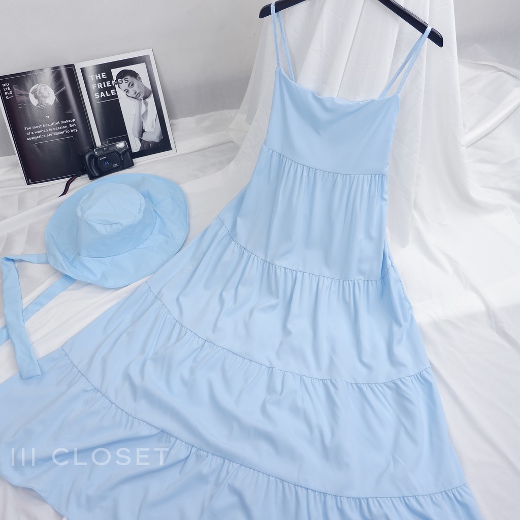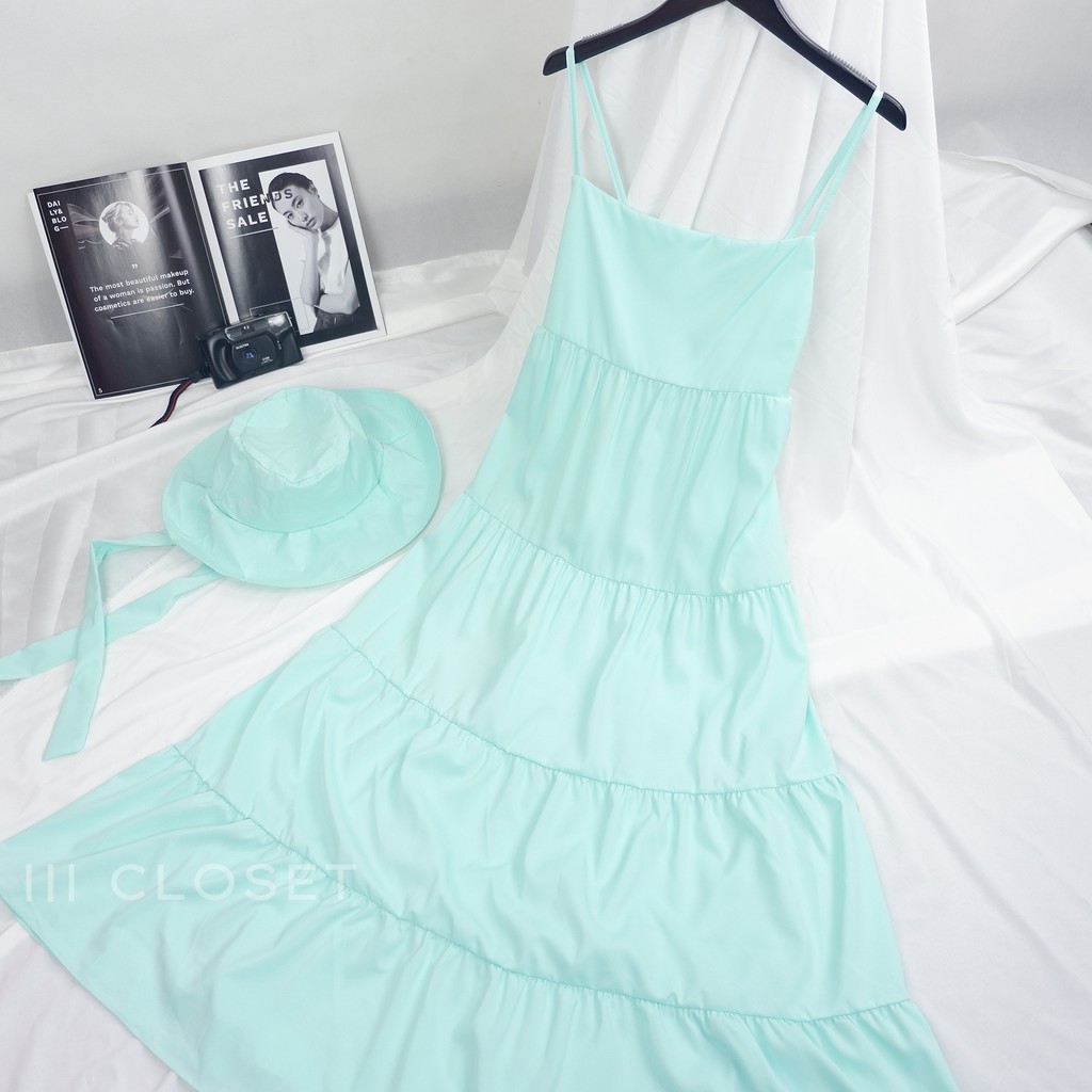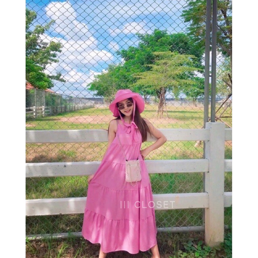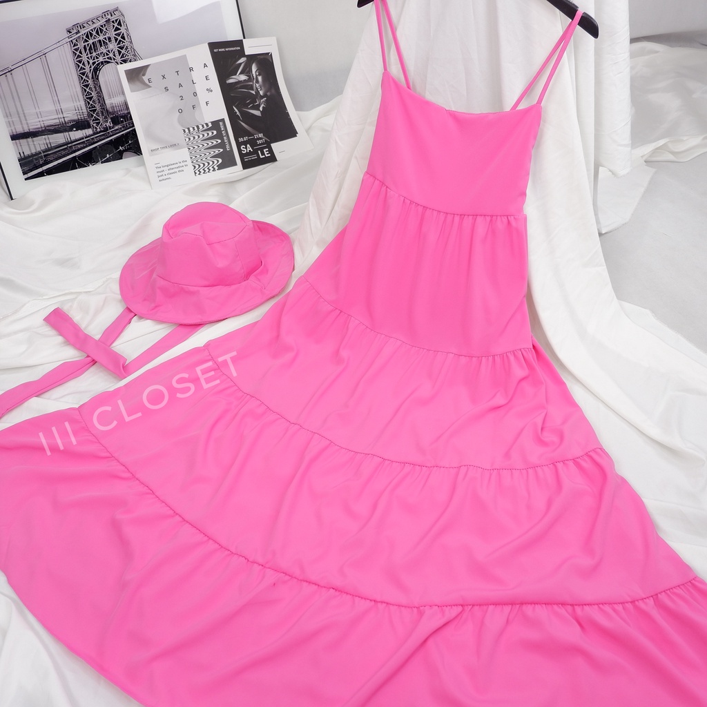 ชุดเซ็ทเดรส lll Freesize lll PE051 สายเดี่ยว+หมวก แต่งระบายเป็นชั้นๆ สม็อกหลัง พร้อมหมวกปีกกว้าง ผ้าไหมอิตาลีอย่างดี