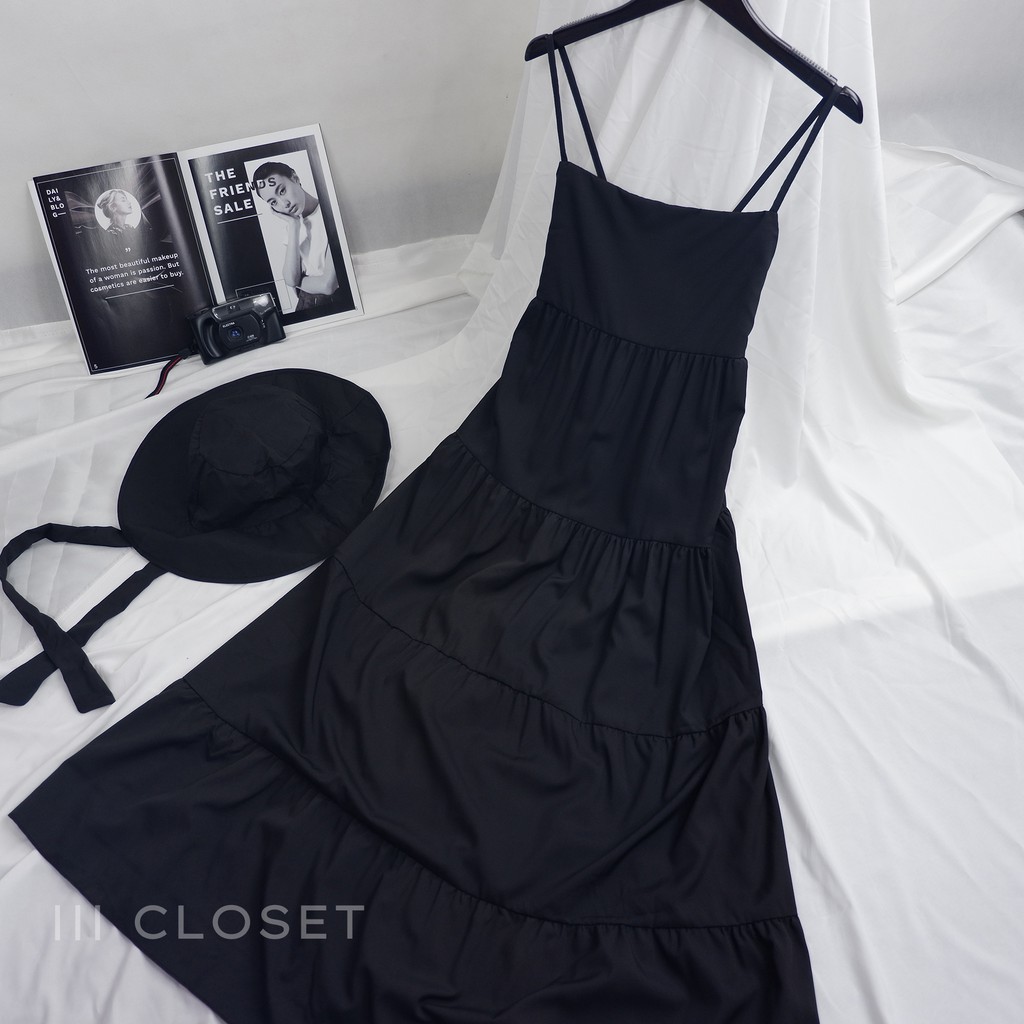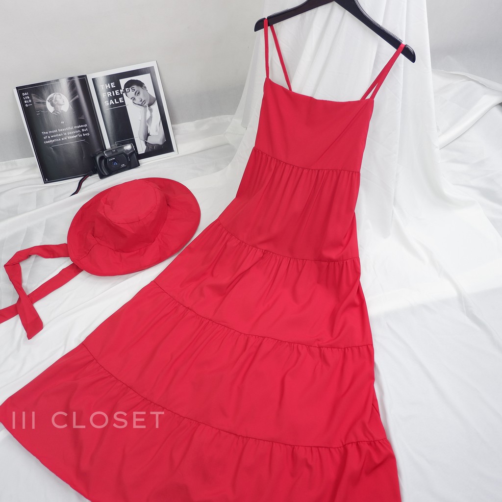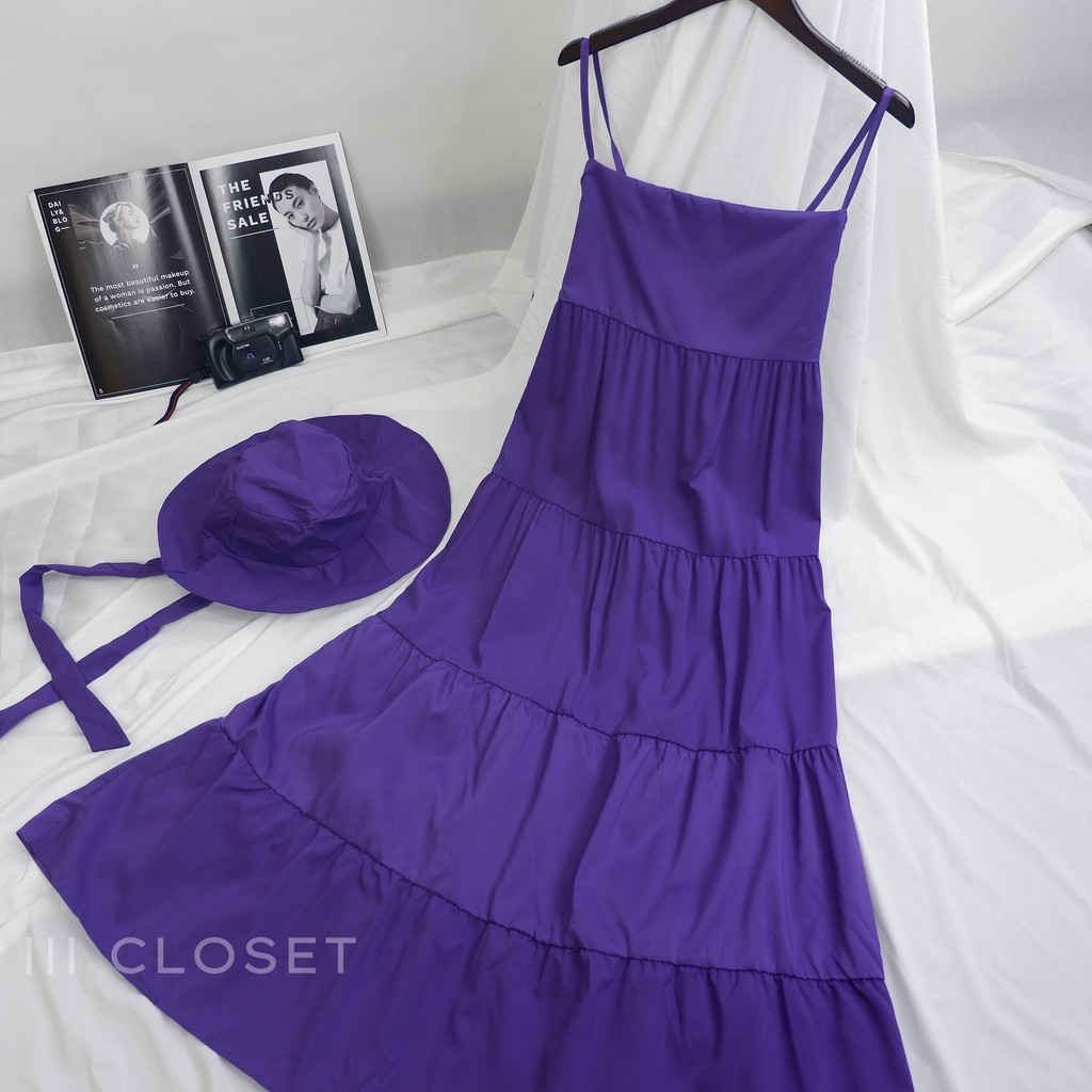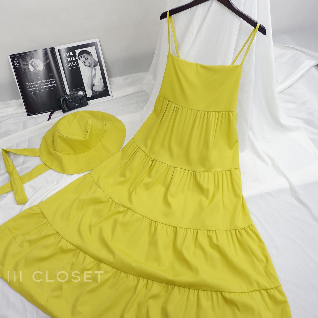 ชุดเซ็ทเดรส lll Freesize lll PE051 สายเดี่ยว+หมวก แต่งระบายเป็นชั้นๆ สม็อกหลัง พร้อมหมวกปีกกว้าง ผ้าไหมอิตาลีอย่างดี