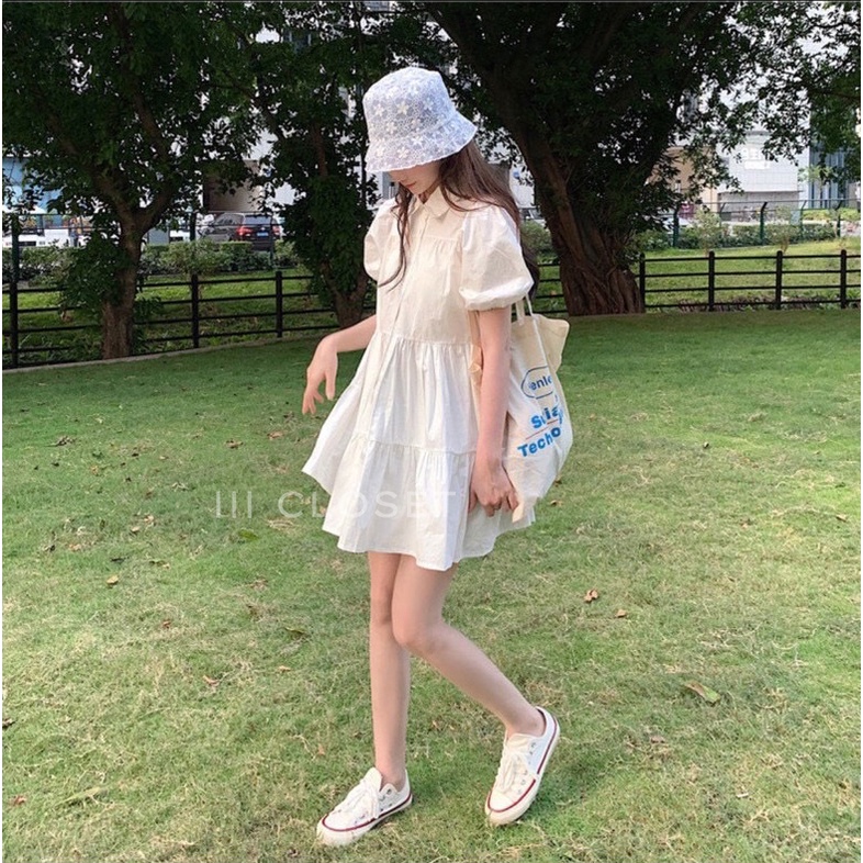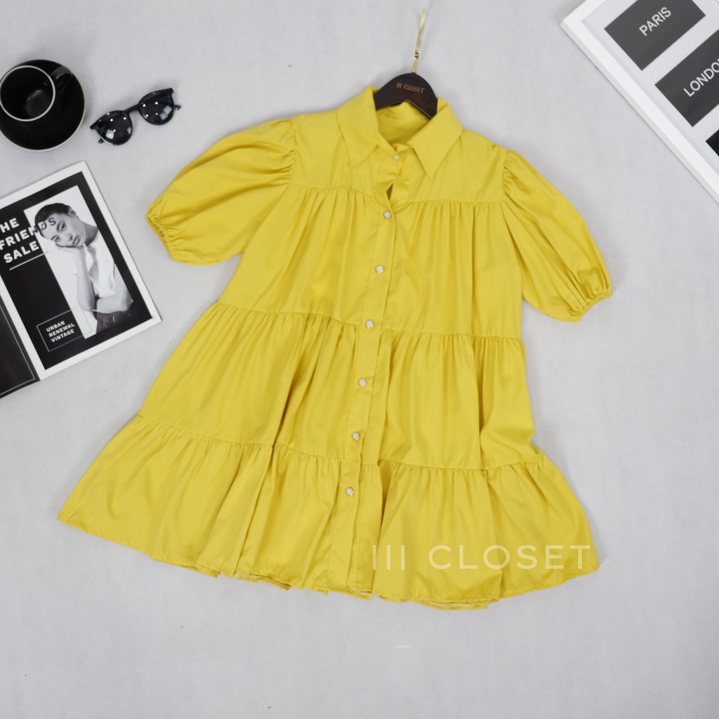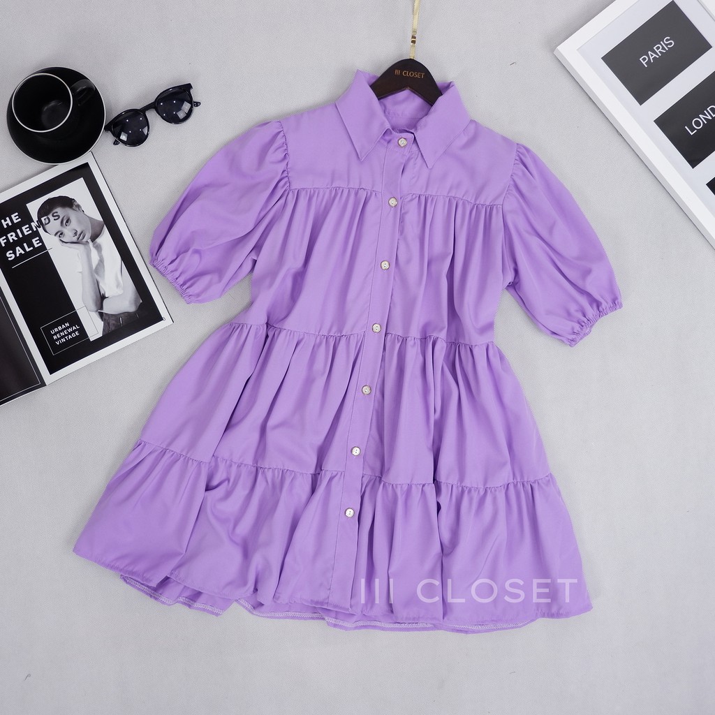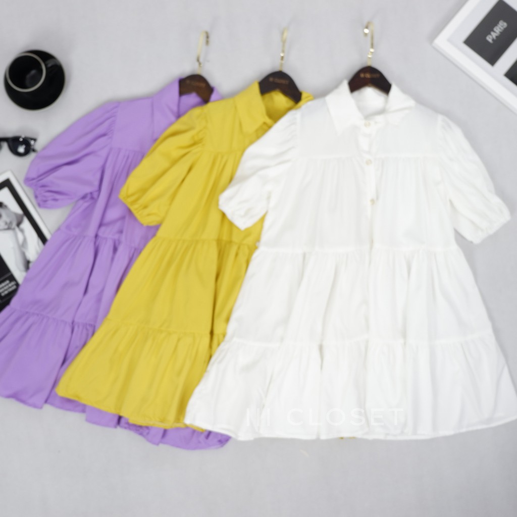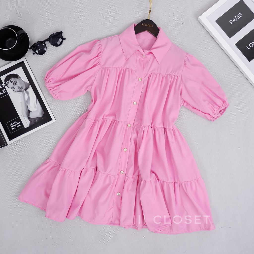 มินิเดรสสั้น lll Freesize lll ZZ001 คอปก กระดุมหน้า แขนตุ๊กตา ชุดเย็บระบายเป็นชั้นๆ เนื้อผ้าไหมอิตาลี