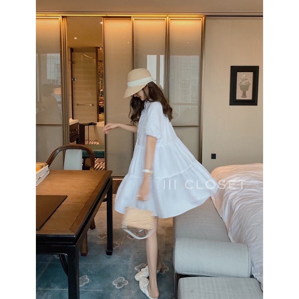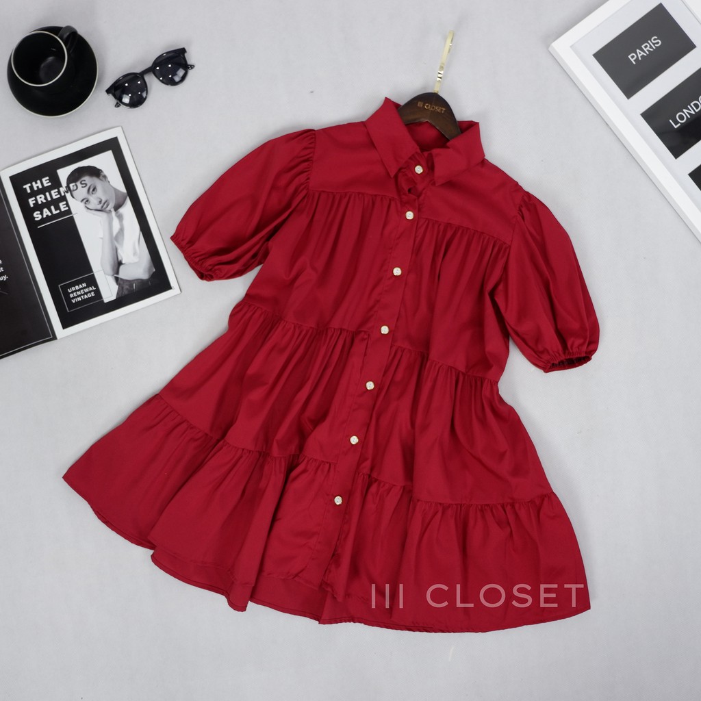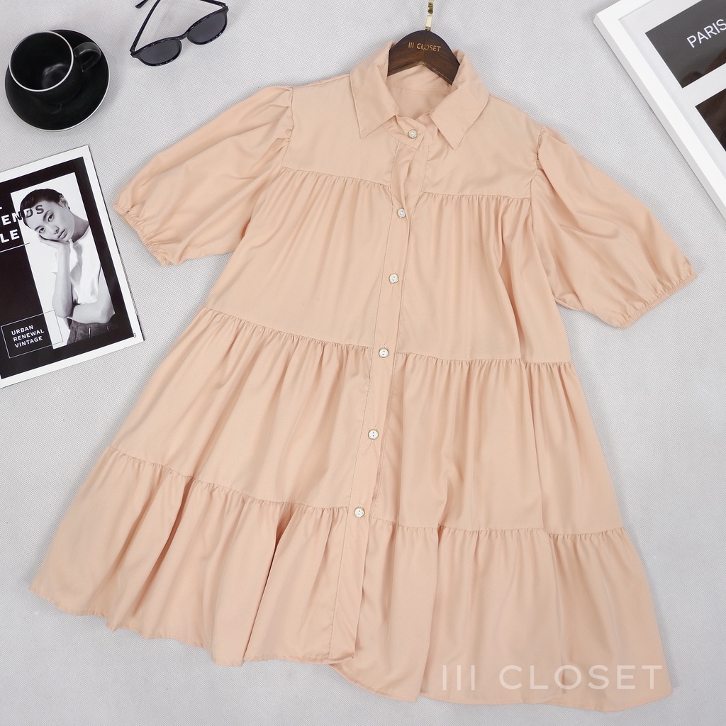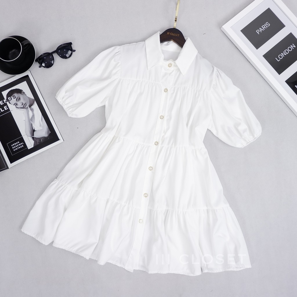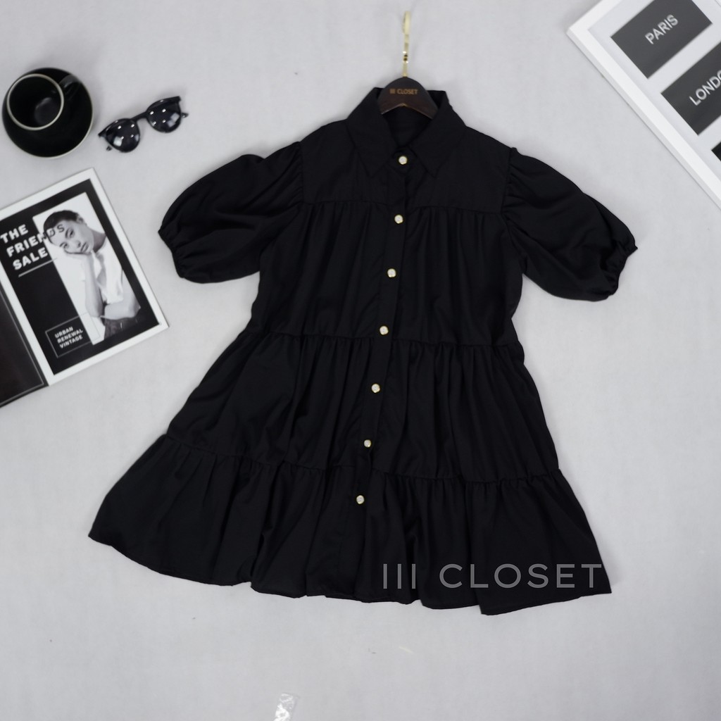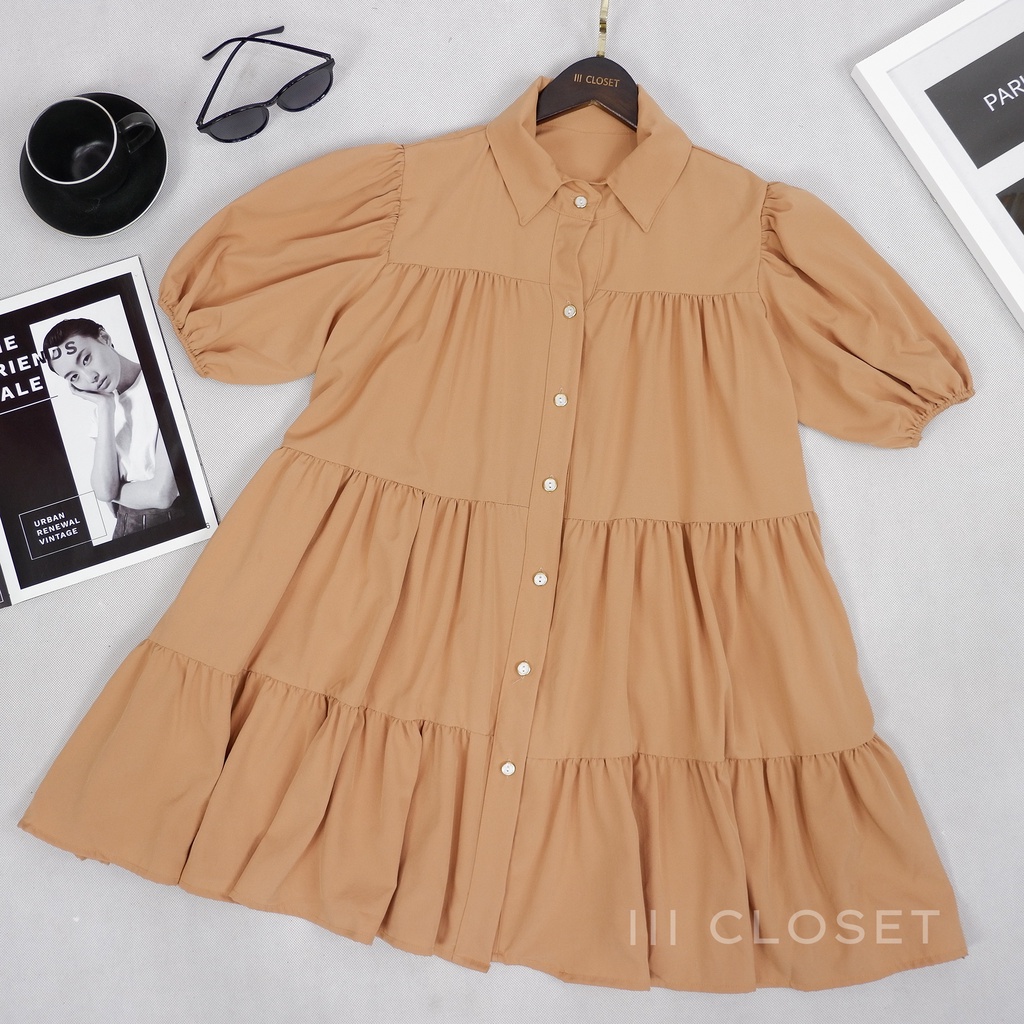 มินิเดรสสั้น lll Freesize lll ZZ001 คอปก กระดุมหน้า แขนตุ๊กตา ชุดเย็บระบายเป็นชั้นๆ เนื้อผ้าไหมอิตาลี
