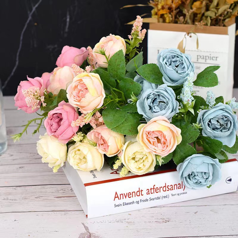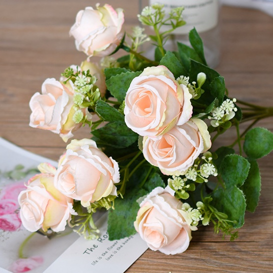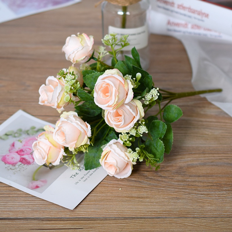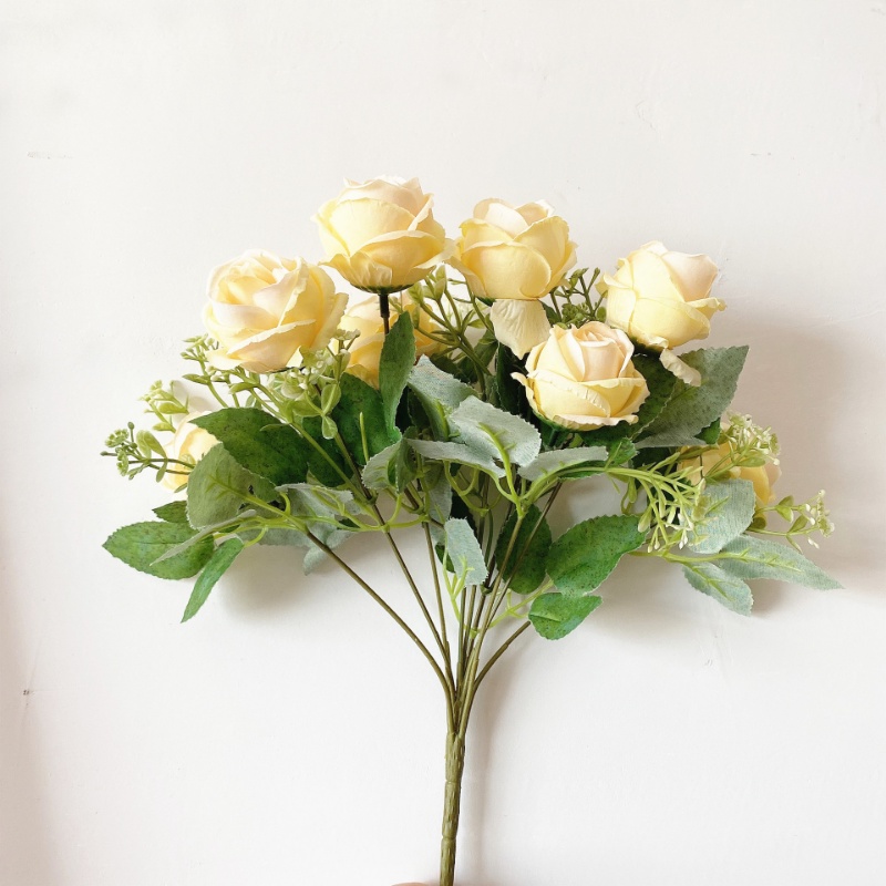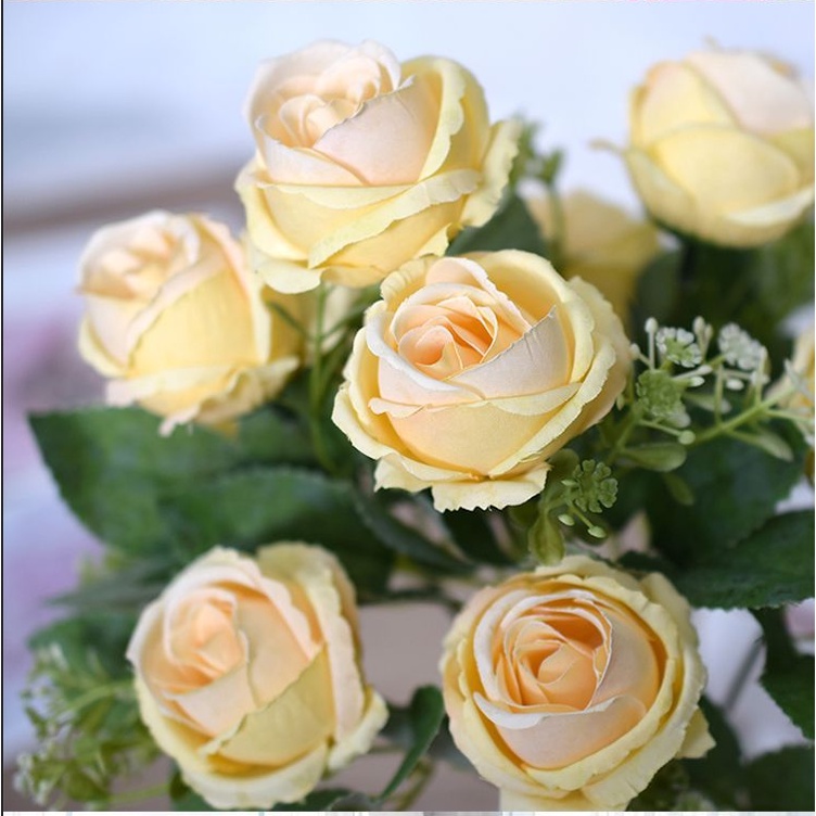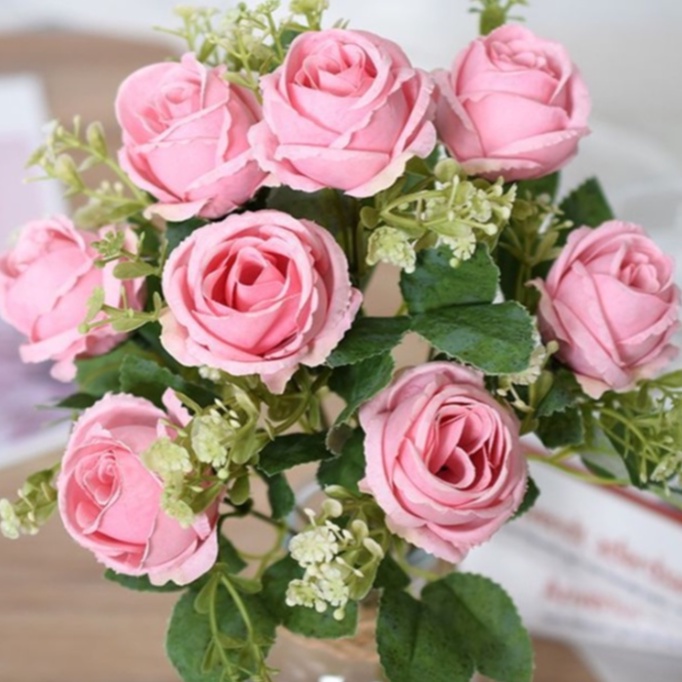 ช่อดอกกุหลาบประดิษฐ์ 9 ดอก ดอกไม้ปลอม พร้อมใบไม้สีเขียว สําหรับตกแต่งบ้าน, พรอพถ่ายรูป