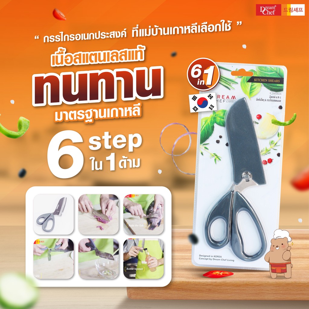 Dream Chef Living มีดเชฟญี่ปุ่นอเนกประสงค์ 6 In 1 Santoku ของแท้มาตรฐานเกาหลี สแตนเลส Body ABS ทนทาน