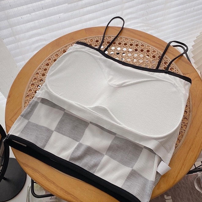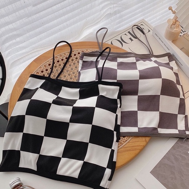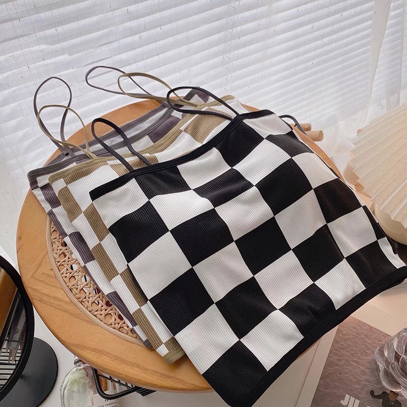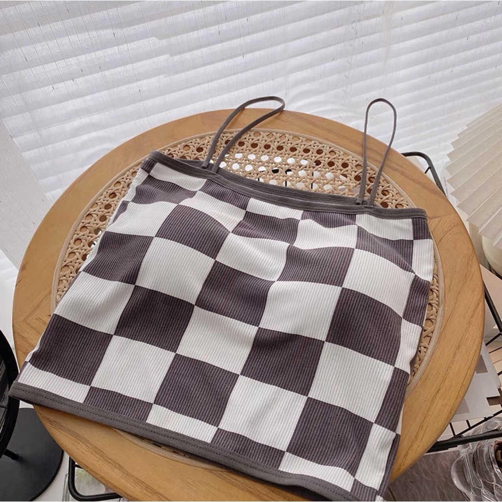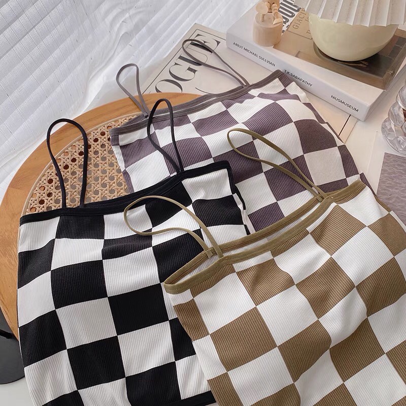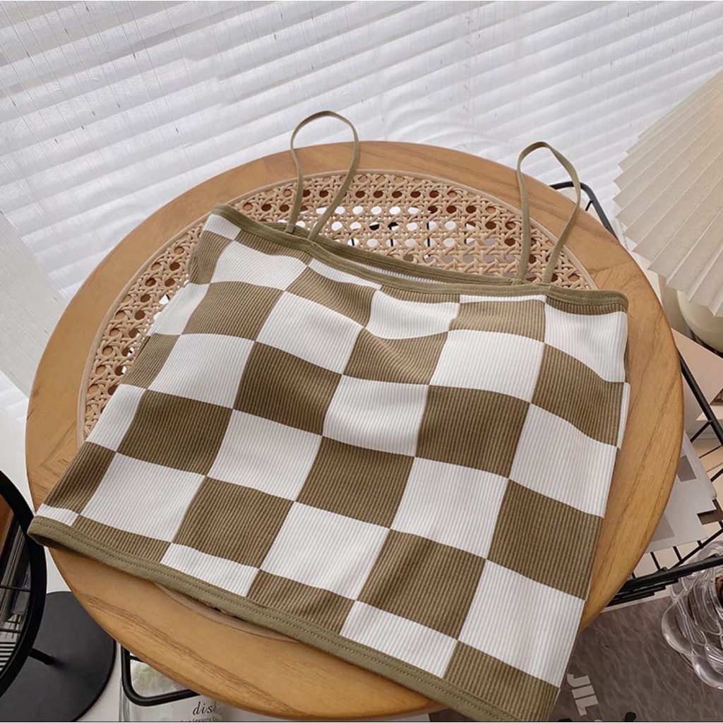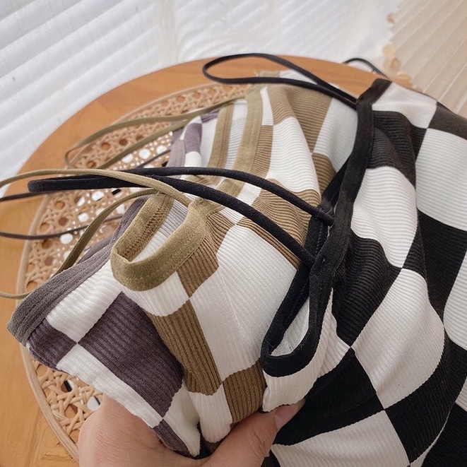 BRA 17🐣 เสื้อลายเดียว ลายตารางหมากรุก สายเดี่ยวไหมพรม มีฟองน้ำในตัว ทรงสวยมาก เสื้อแฟชั่นสไตล์เกาหลี 🐣