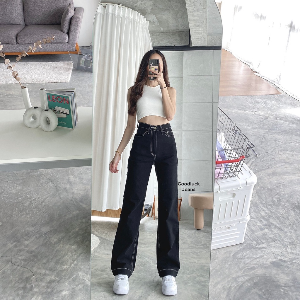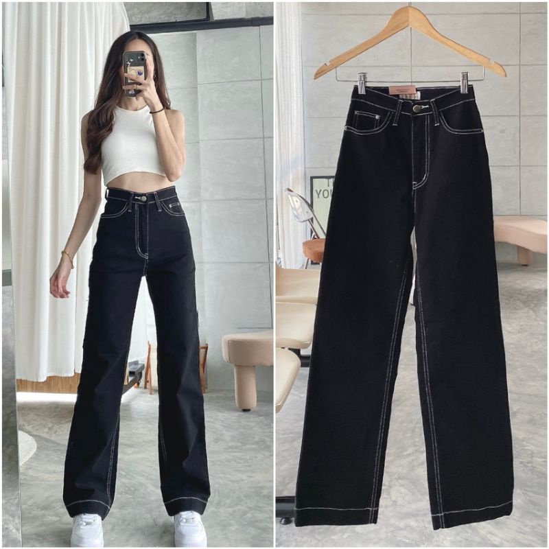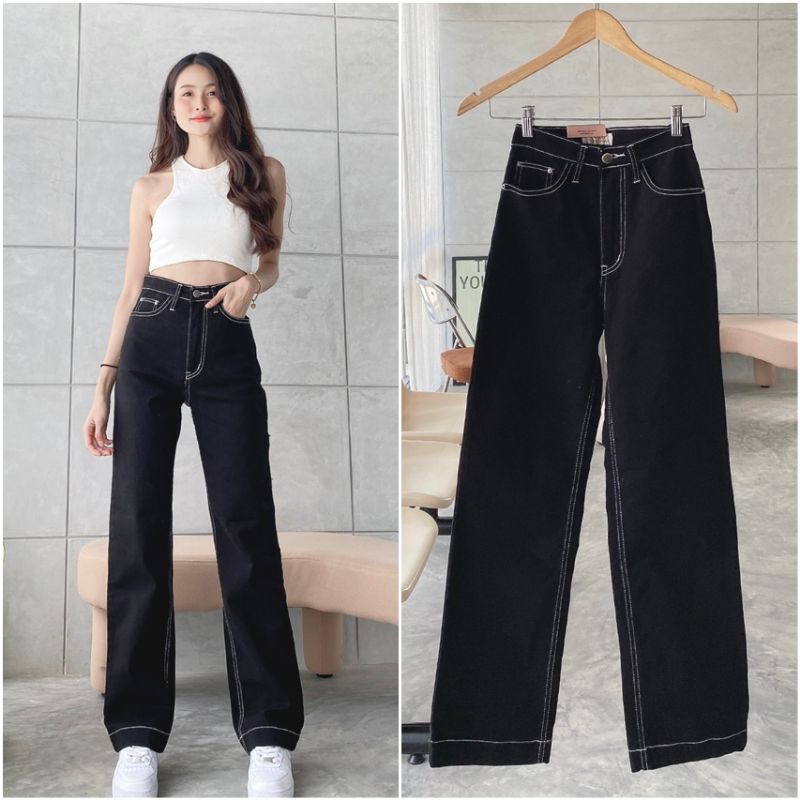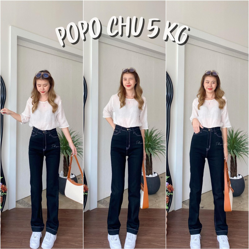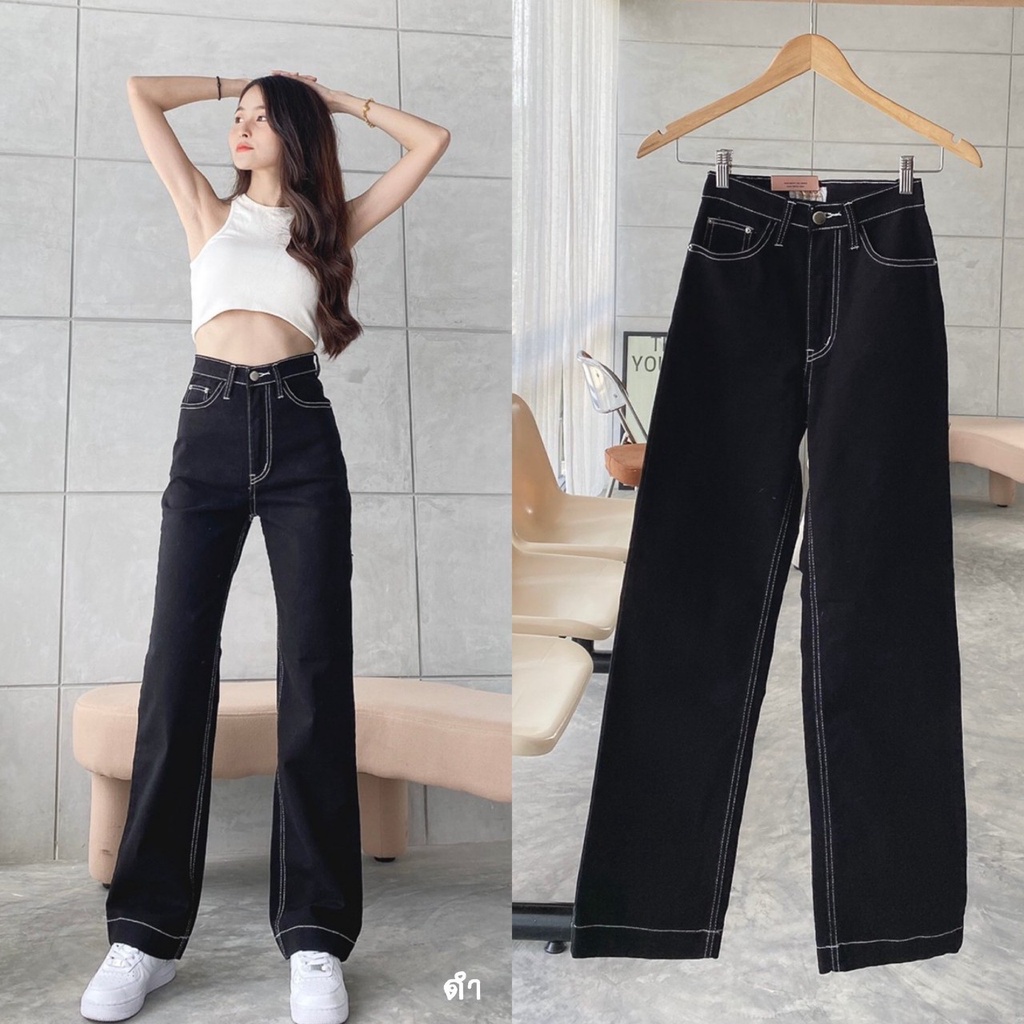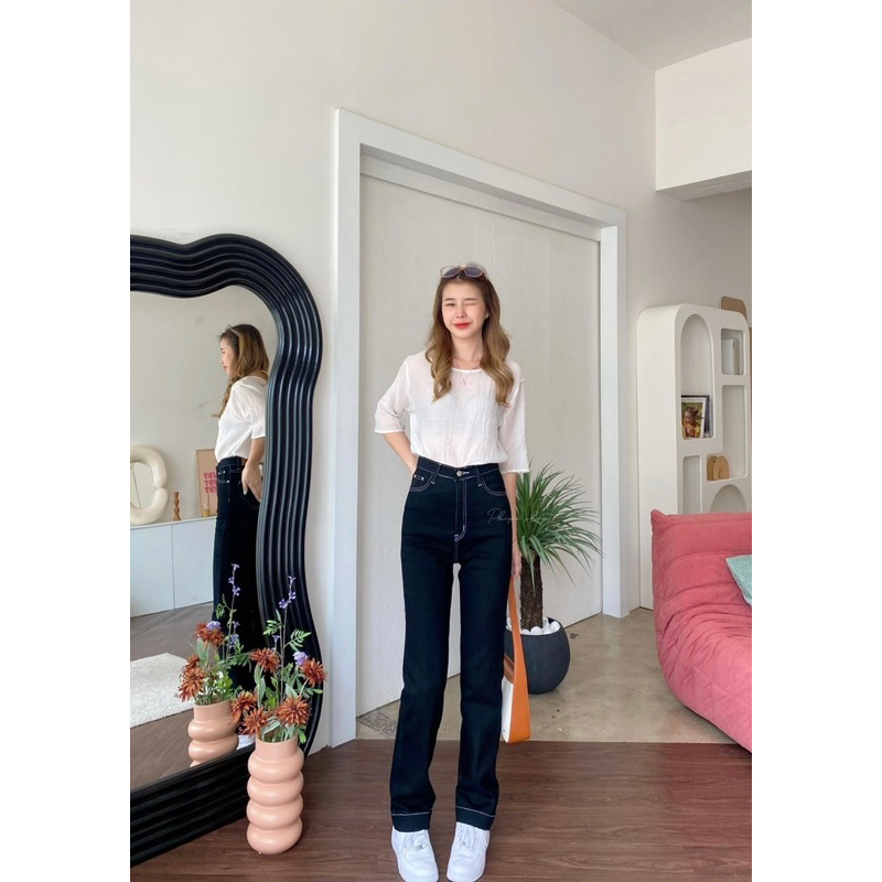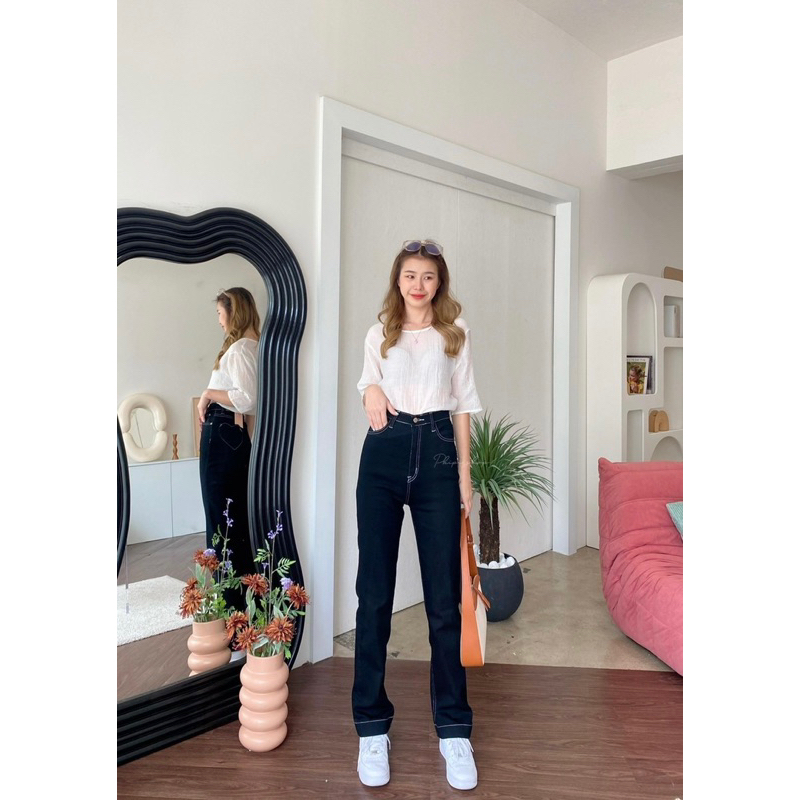 กางเกงยีนส์ป้าย CHUU 5 KG ขายาวเอวสูงขากระบอกใหญ่ผ้ายืดกระเป๋า