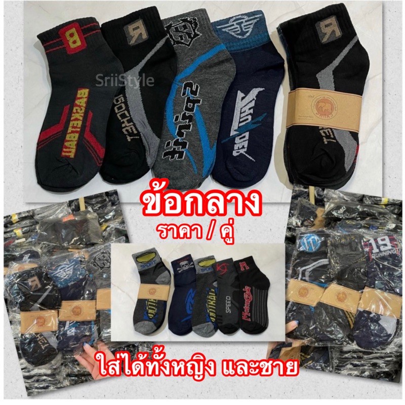 [แพ็ค 1 คู่] ถุงเท้าข้อกลาง ถุงเท้าลายสปอร์ต สุ่มป้าย สุ่มสี-ลาย