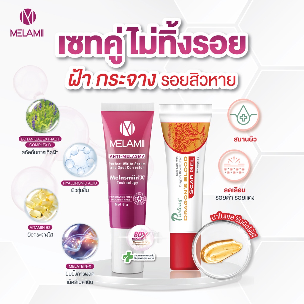 เซทคู่ไม่ทิ้งรอย ฝ้า กระ รอย สิว Melamii 8g. + Scar 8g.