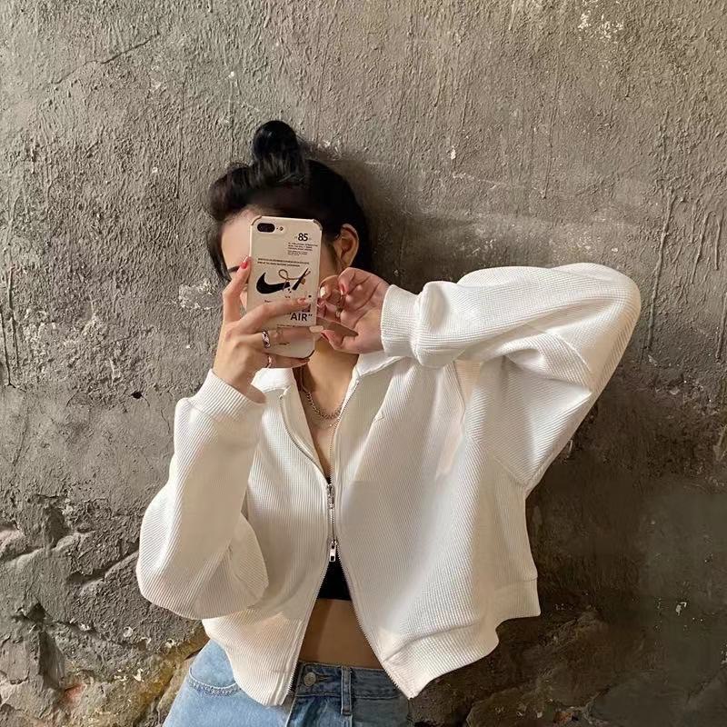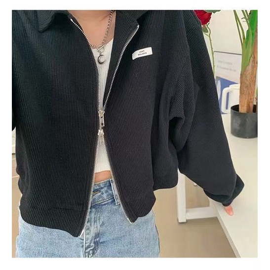 เสื้อแขนยาว ผ้าฝ้าย มีซิป ทรงหลวม เสื้อครอปกันหนาวแจ็คเก็ต