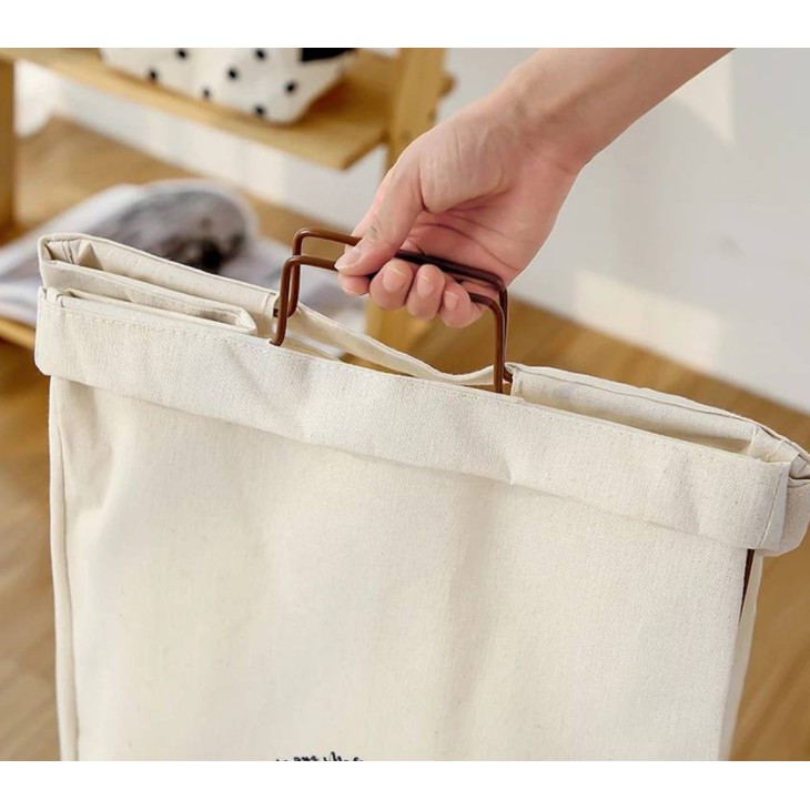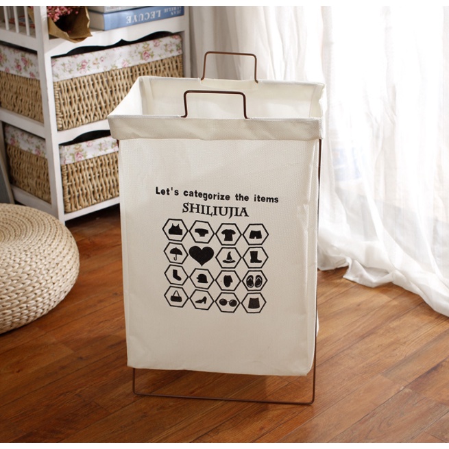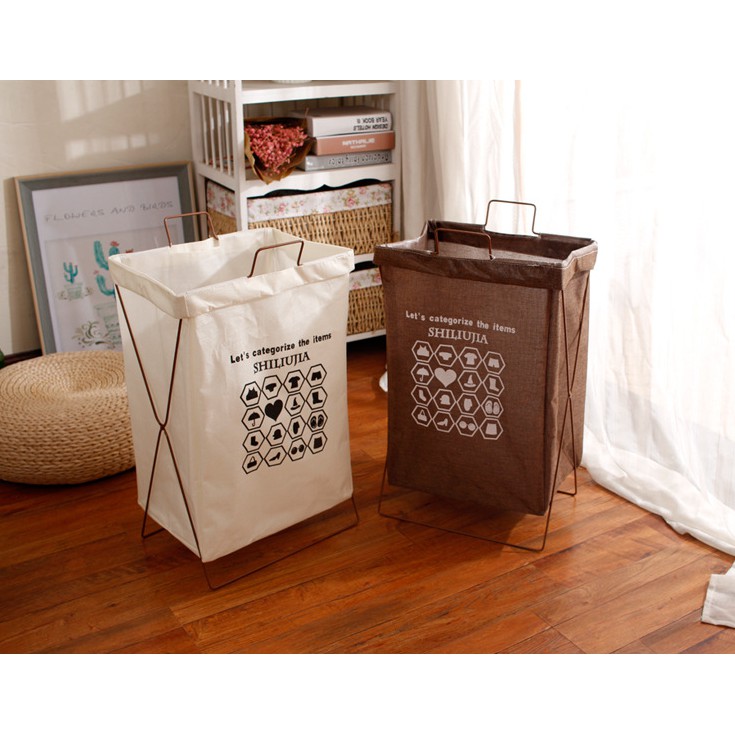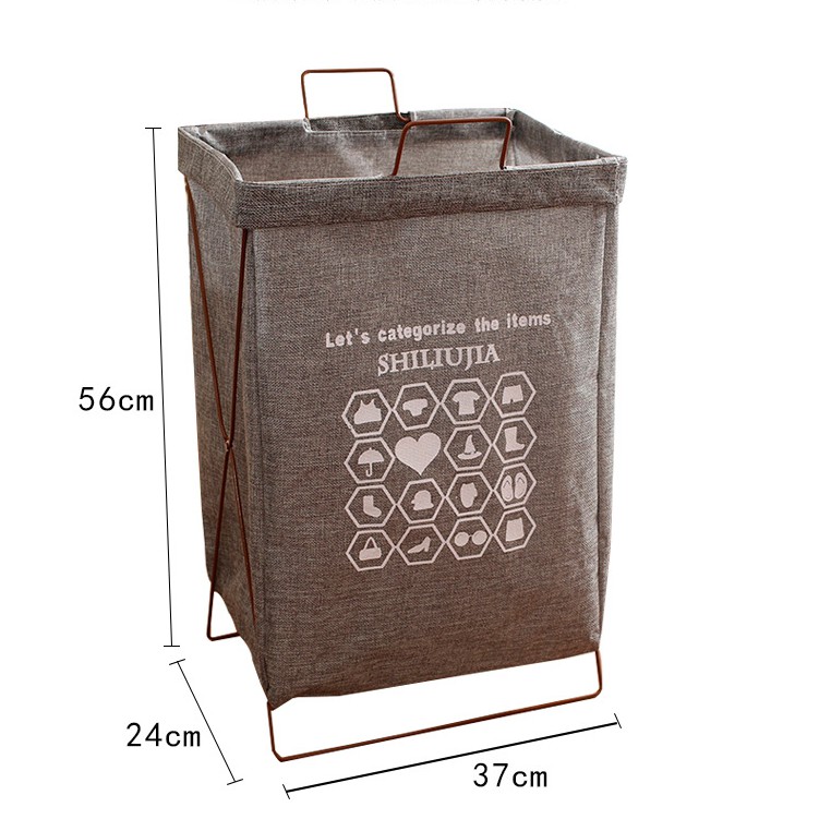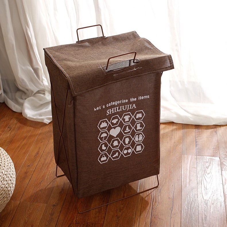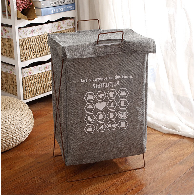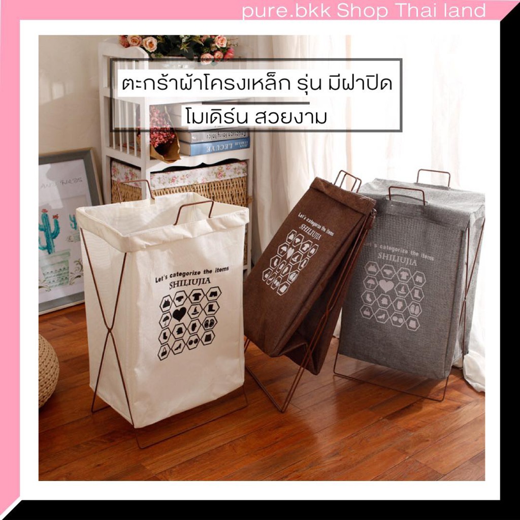 ตะกร้าผ้าโครงเหล็ก พับเก็บได้ ผ้าเตรียมซักเอนกประสงค์ มีฝาปิด