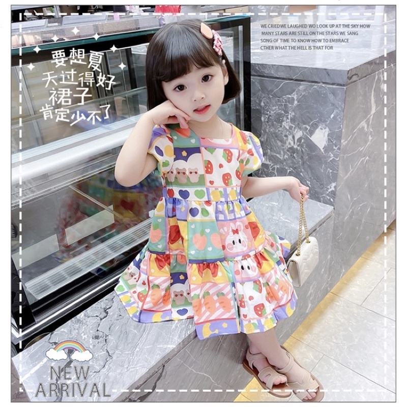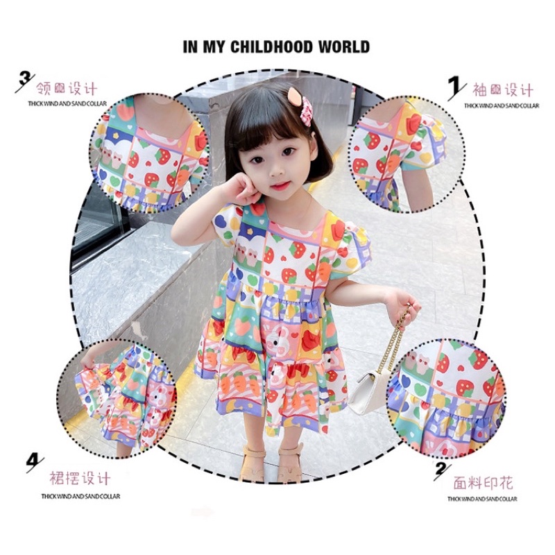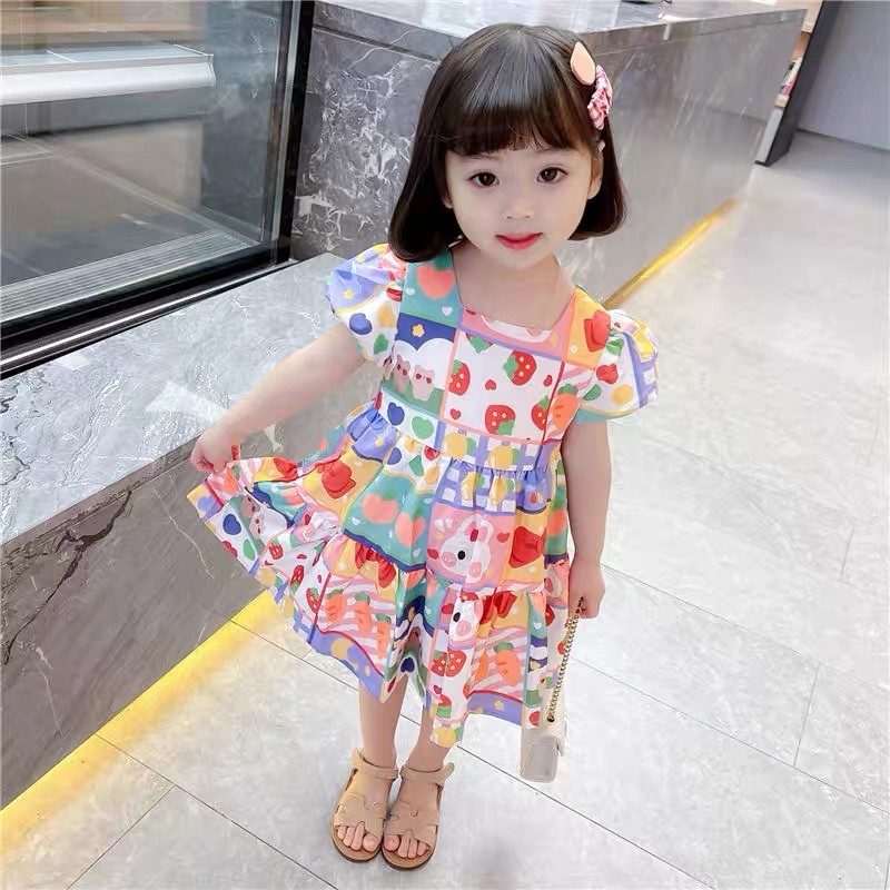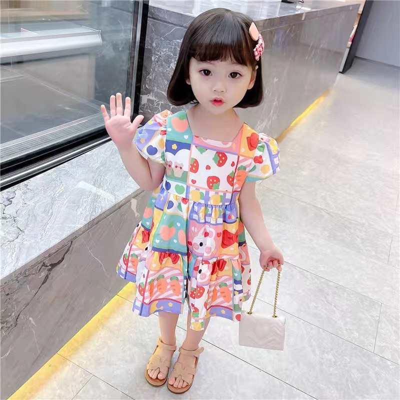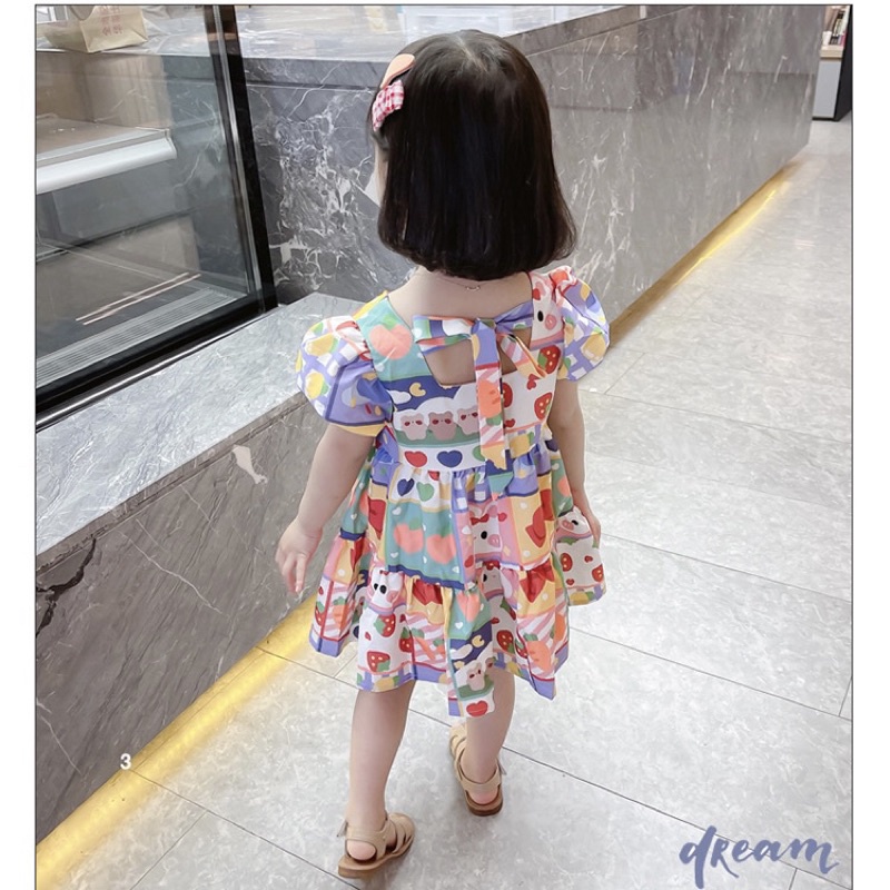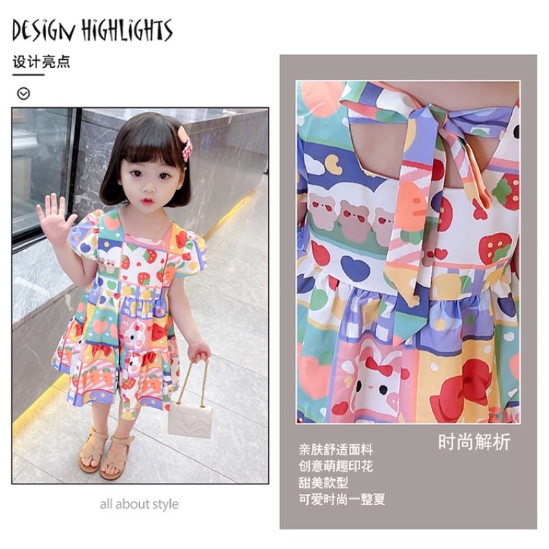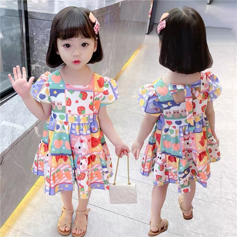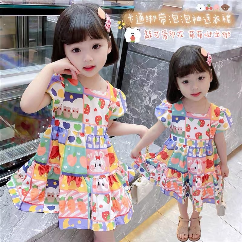 ชุดเดรสสำหรับเด็กผู้หญิง<กระโปรงเด็ก<พร้อมส่ง<เดรสแขนพองลายการ์ตูนผูกโบว์🎀