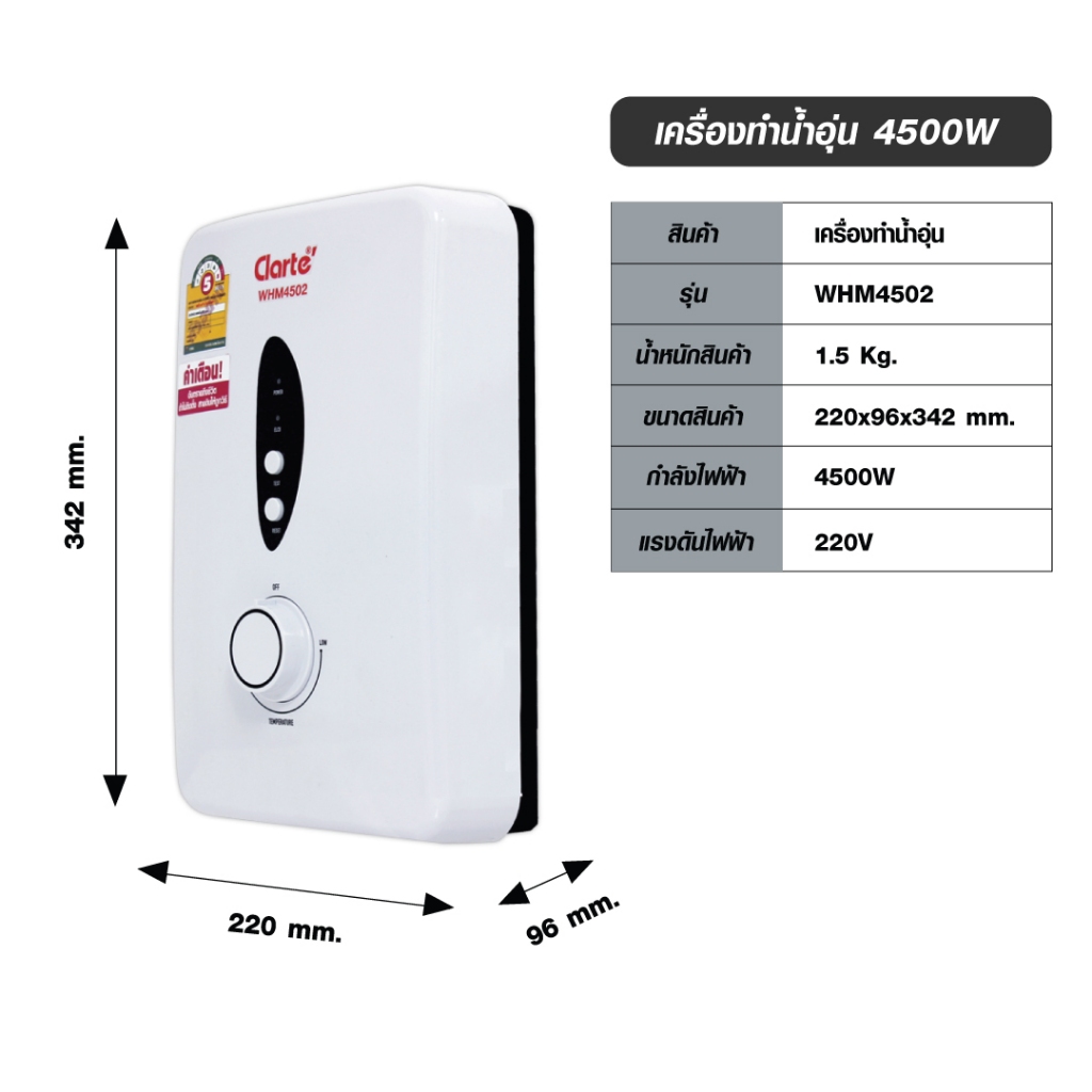 Jaymarketเครื่องทำน้ำอุ่นClarte'4500W.พร้อมอุปกรณ์ฝักบัวใหญ่ครบชุดมีให้เลือก2รุ่นWHM4501/WHM4502สินค้าพร้อมส่ง