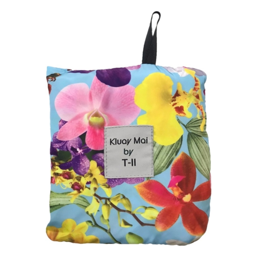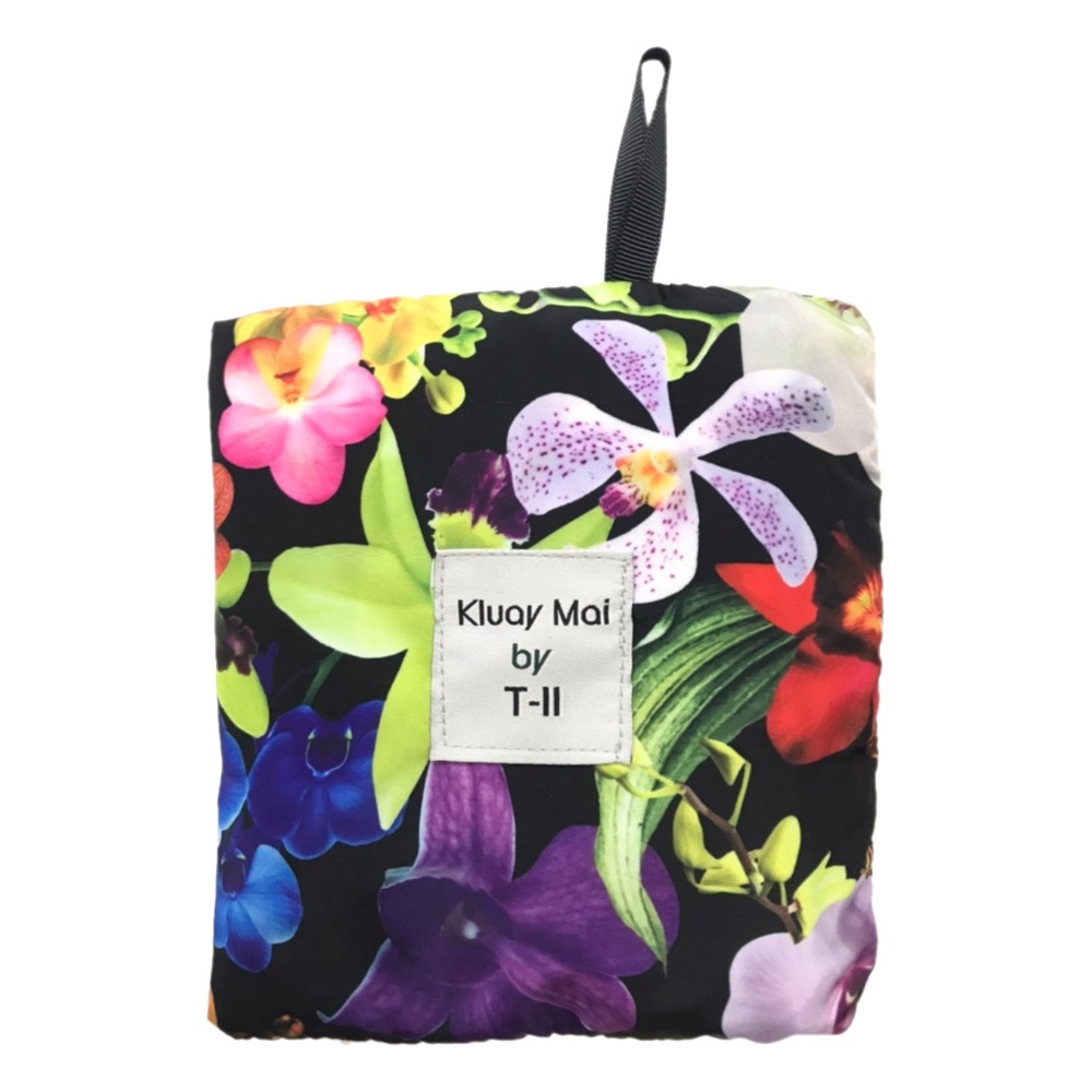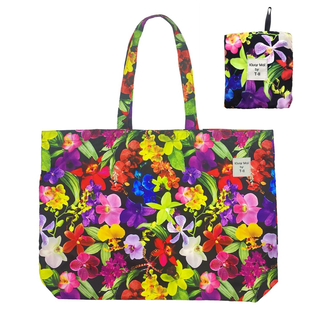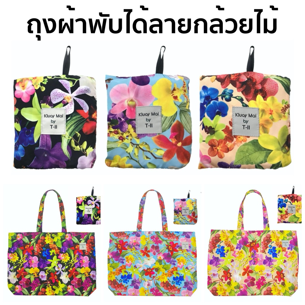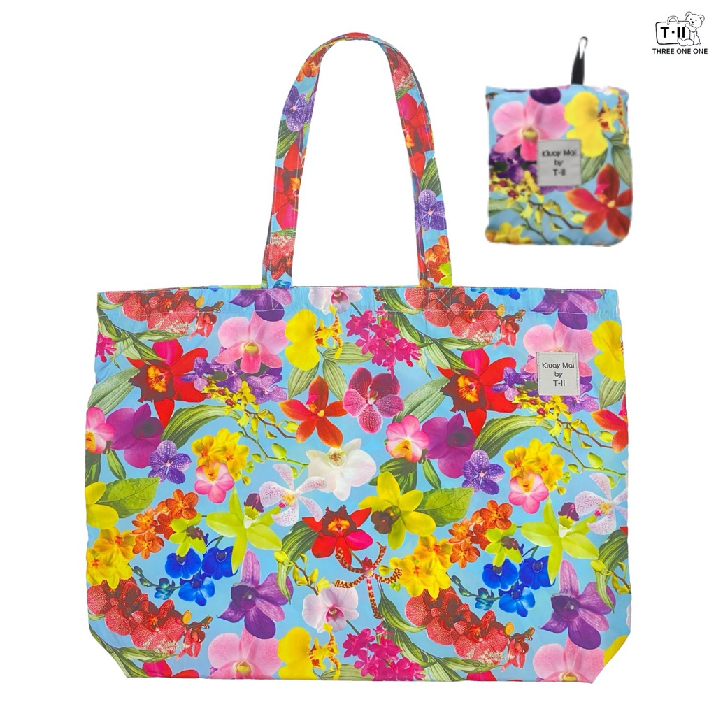 Three One-One ถุงผ้าพับได้ลายกล้วยไม้ กระเป๋าช็อปปิ้ง ผ้ากันน้ำ จุได้เยอะ สีดำ/ฟ้า/ส้ม