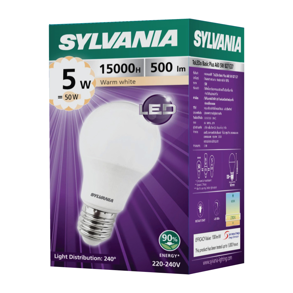 [ซื้อ 1 ฟรี 1 ] SYLVANIA หลอดไฟ ECO ToLEDo A60 5W E27 2700K (แสงวอร์มไวท์)