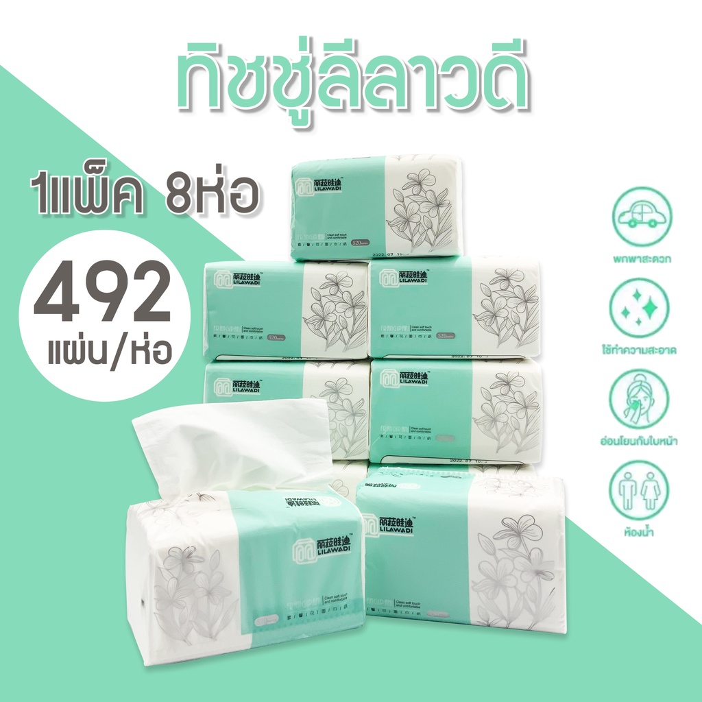 <พร้อมส่ง> กระดาษทิชชู่ 1แพ็ค มี 8ห่อ กระดาษทิชชู่ 1ห่อ มี 492แผ่น หนา 3 ชั้น ไม่เปื่อยง่าย เนื้อเยื่อกระดาษแท้ ไม่ฟอกสี