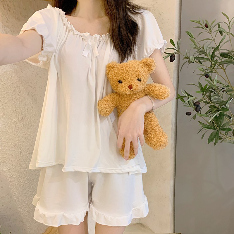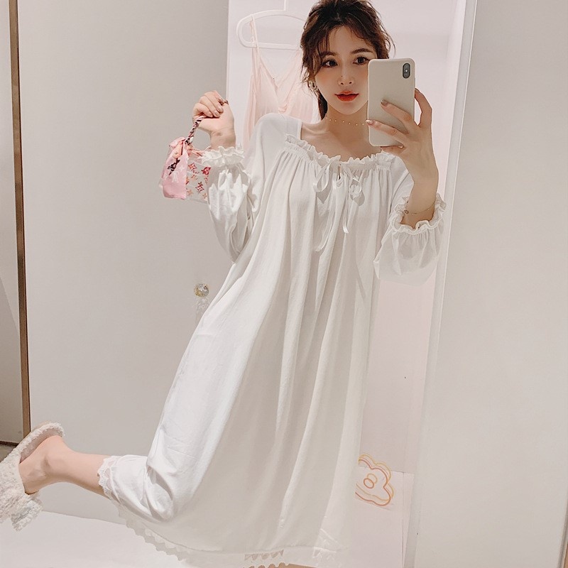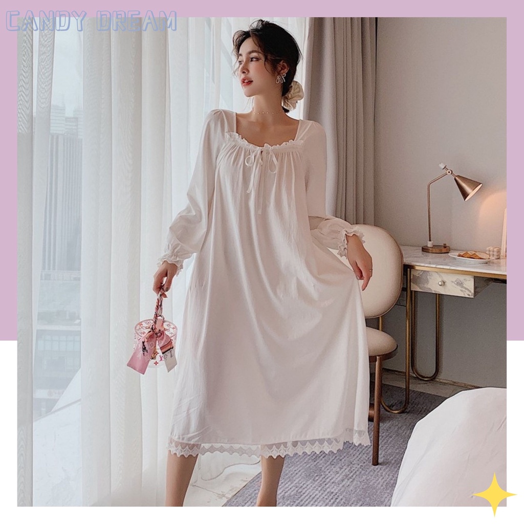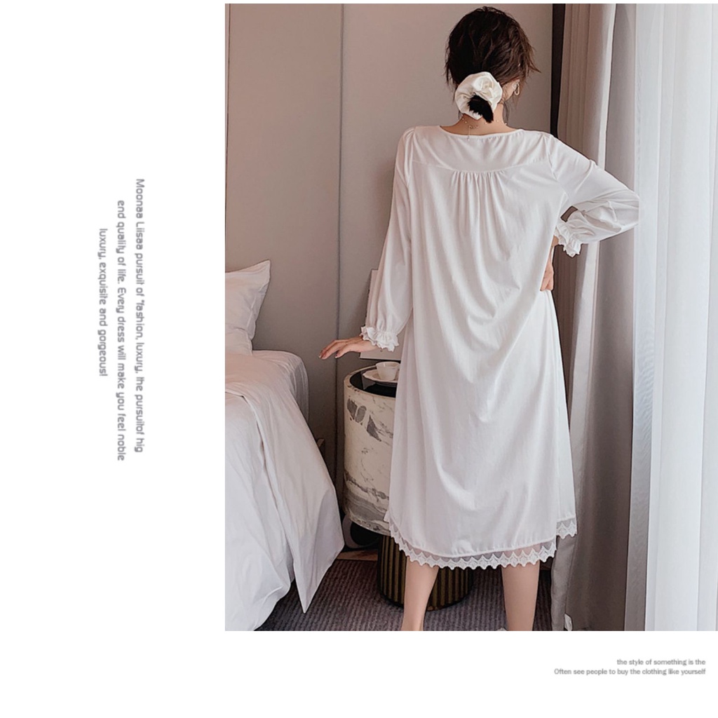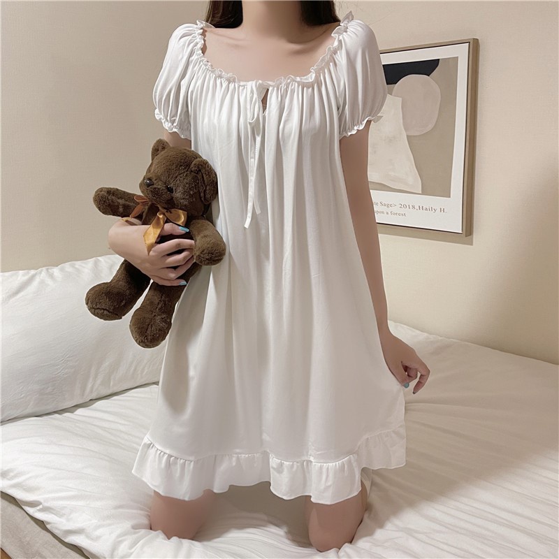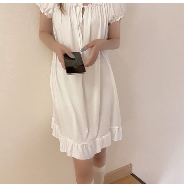 🍭ชุดนอน ผู้หญิง ชุดนอนเดรสลูกไม้แขนสั้นสไตล์เกาหลีคุณหนูสีขาวผ้านิ่มใส่สบายไซส์ใหญ่ M-XL D03พร้อมส่ง